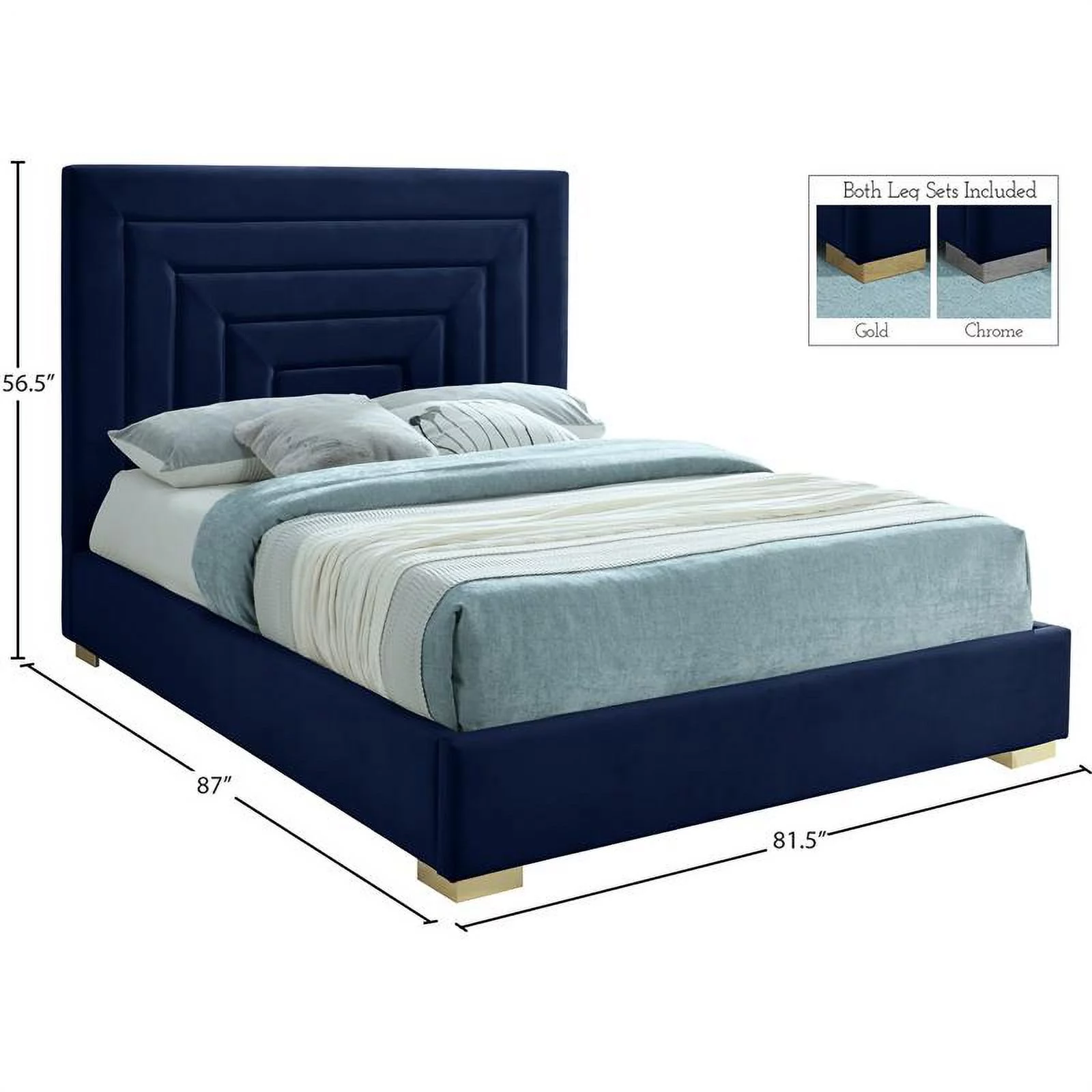 Meridian Furniture Nora Navy Velvet King Bed with Gold/Chrome Legs Included