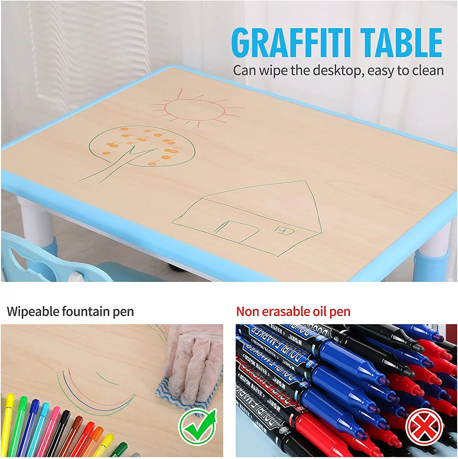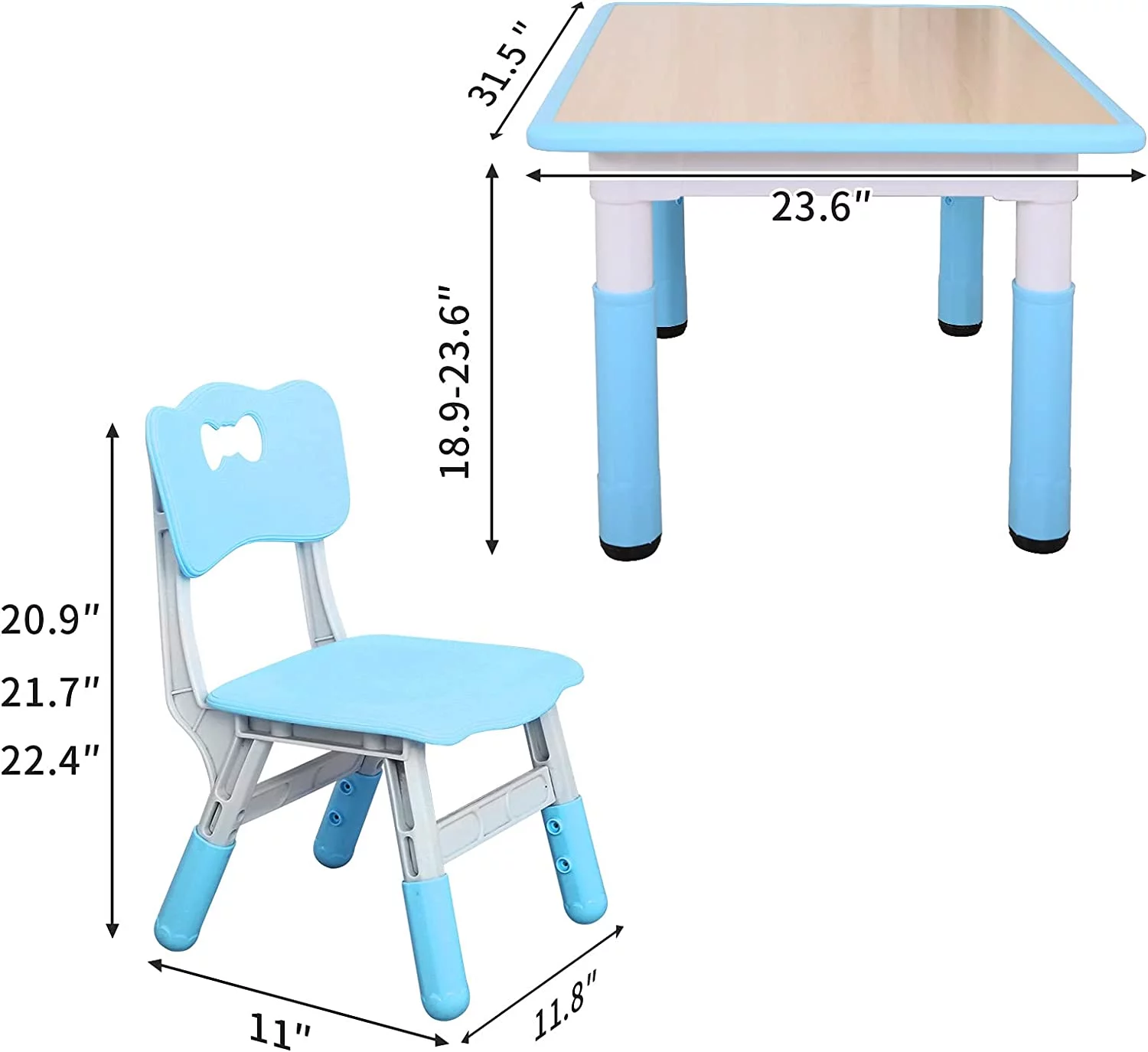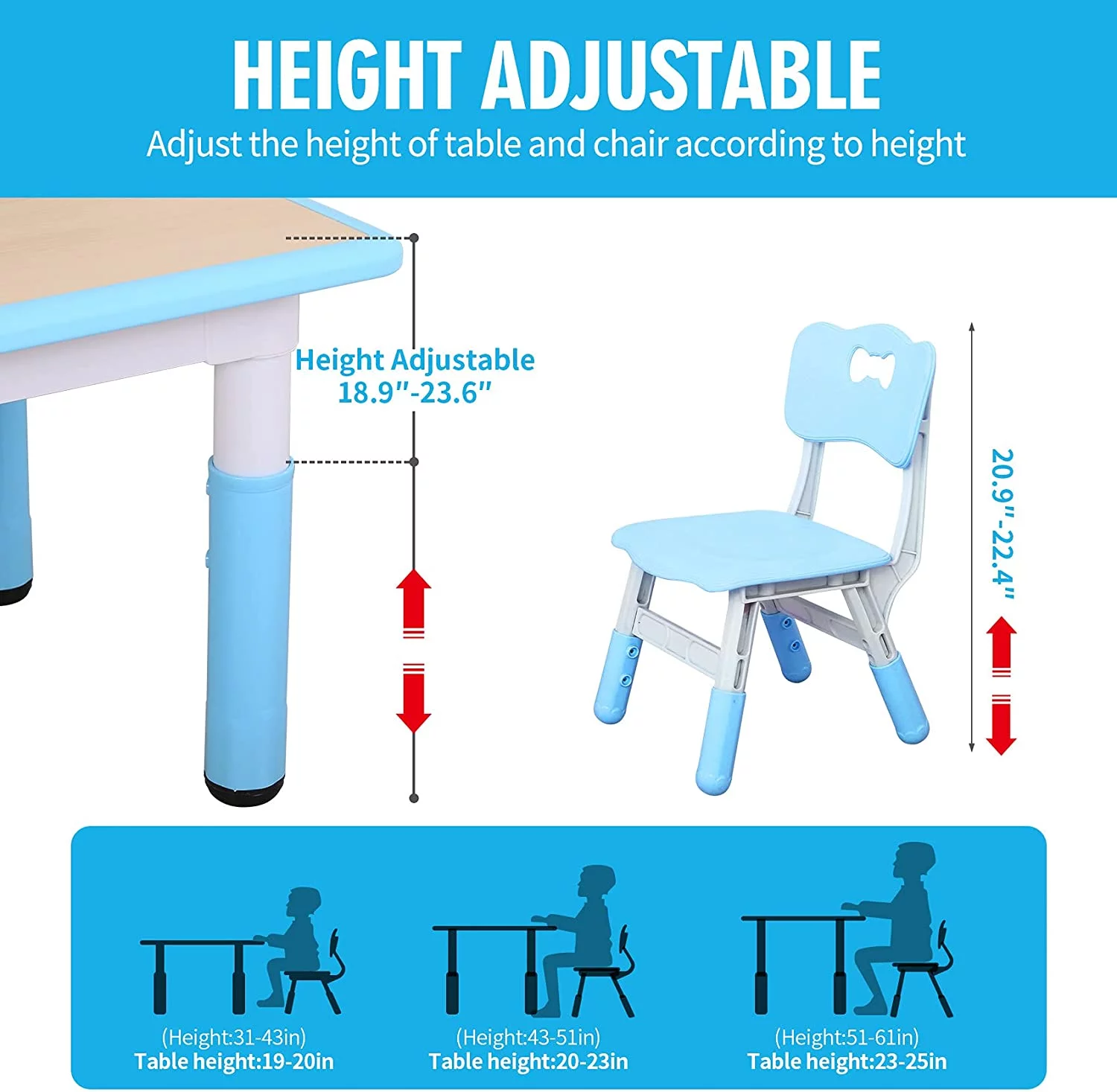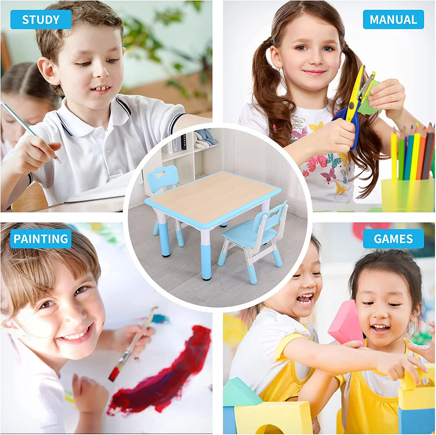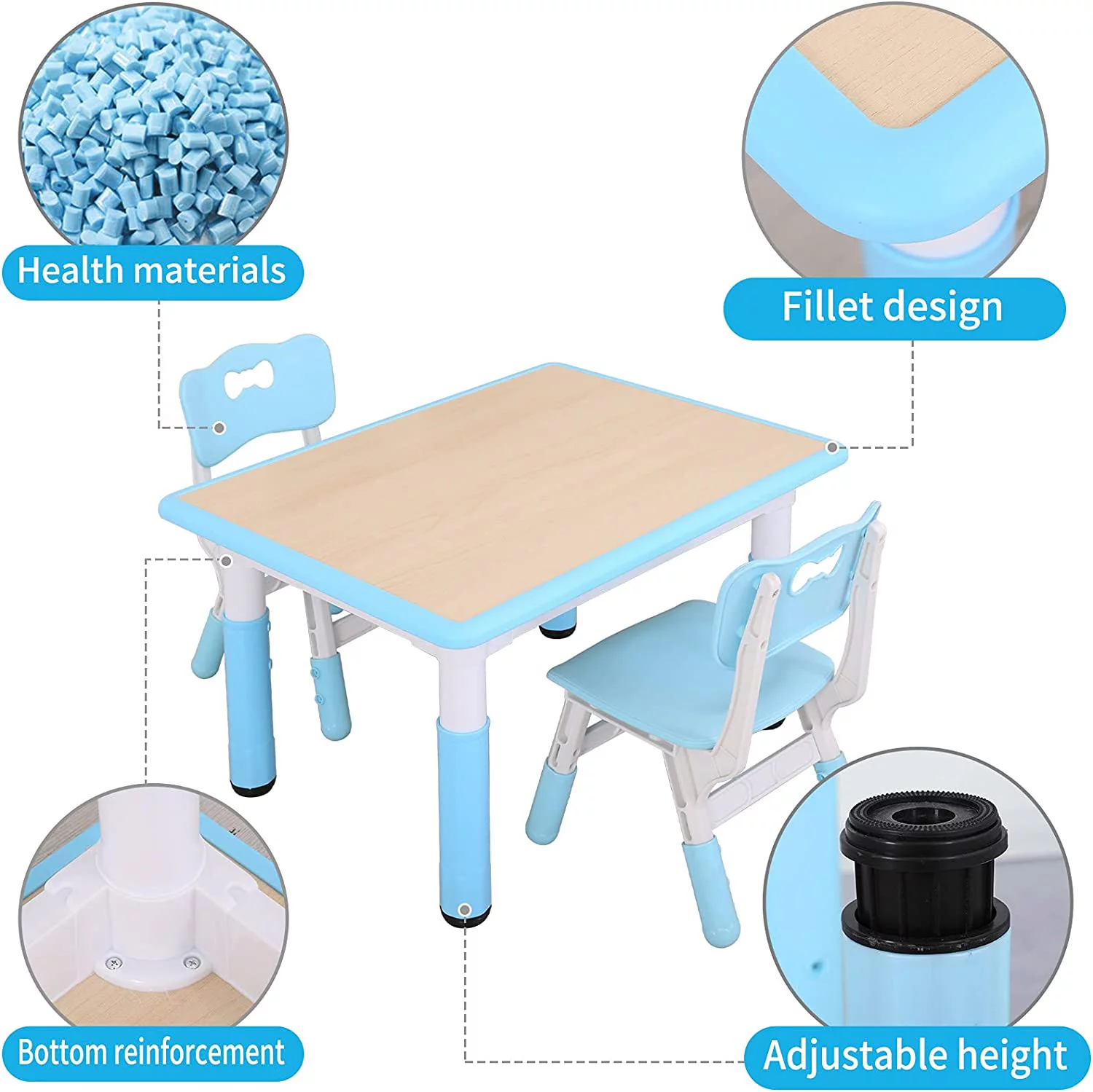 Kids Study Table and Chairs Set, Height Adjustable Plastic Children Art Desk with 2 Seats, Kids Multi Activity Table Set (Maple TOP with Blue Border) BY-60-MBL