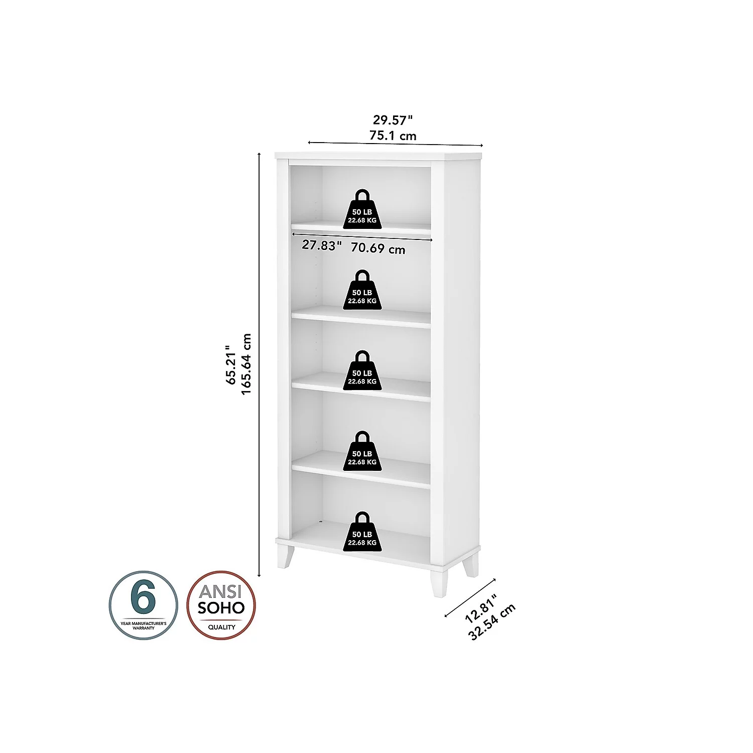 Bush Furniture Somerset 5 Shelf Tall Bookcase in White Finish