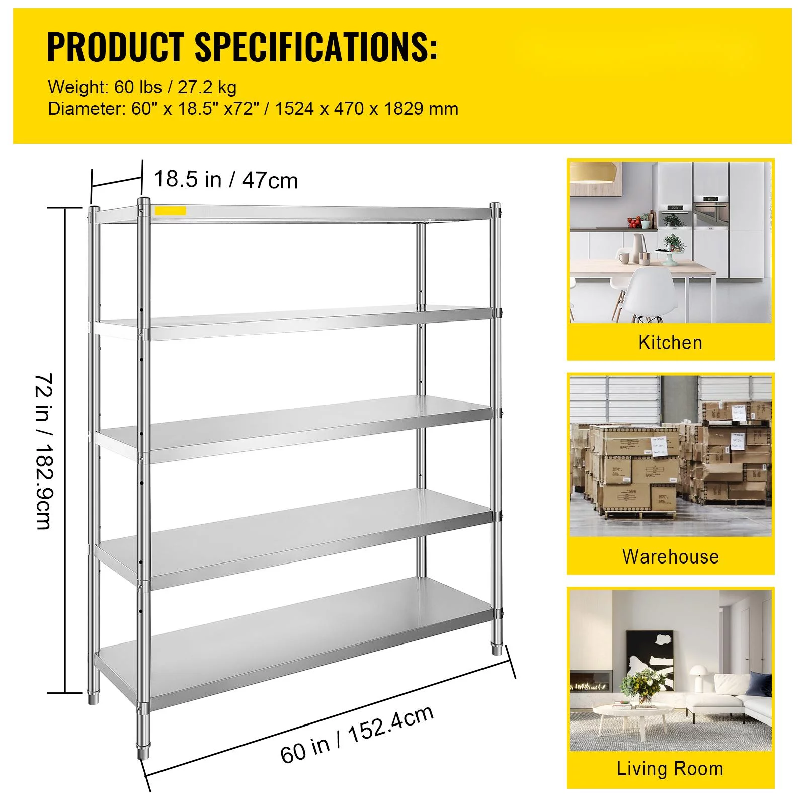 BENTISM Shelving Unit Storage Shelves 60x18.5 inch 5-Tier Stainless Steel 330lb Per Kitchen Shelf