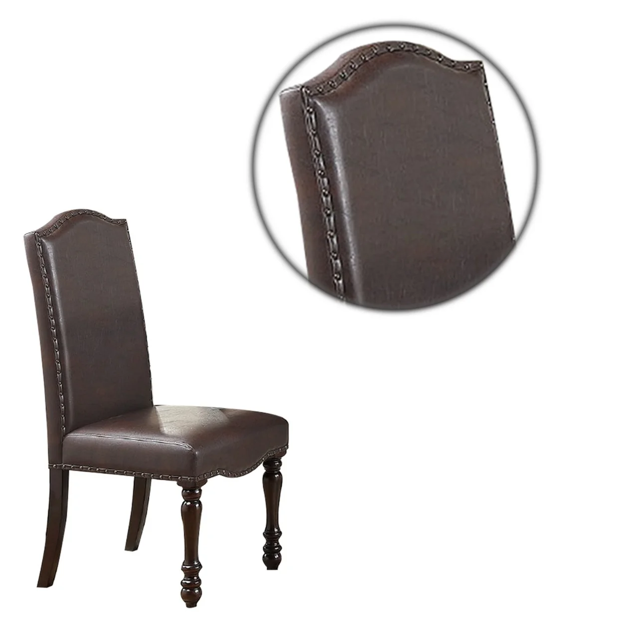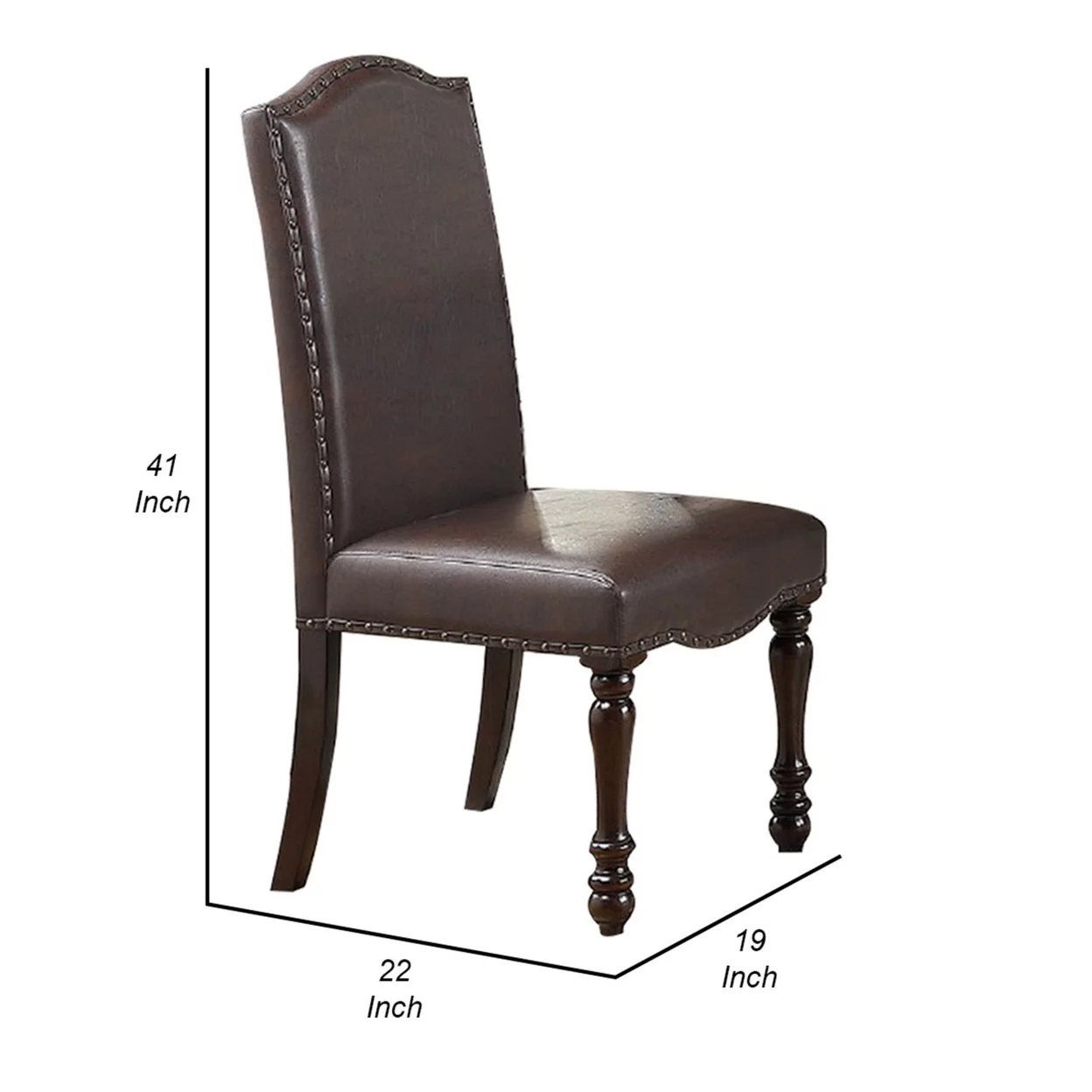 Nailhead Trim Faux Leather Dining Chair with Turned Legs, Set of 2, Brown- Saltoro Sherpi