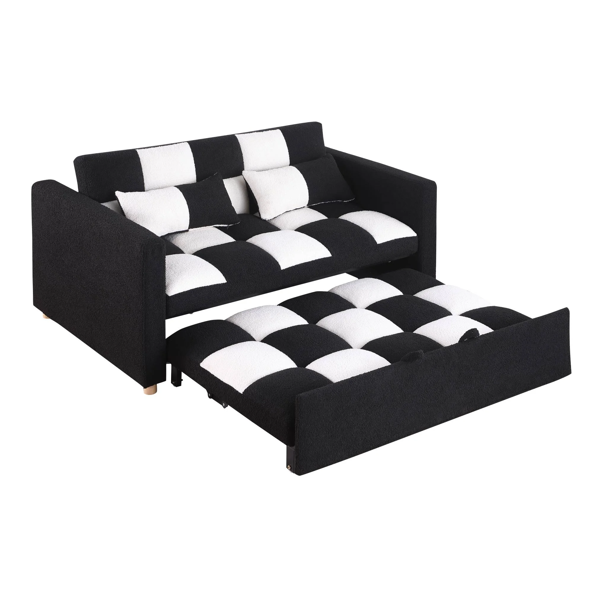 Holaki 45 x 68 Small Teddy Convertible Loveseat, 3 in 1 Sleeper Sofa Couch Bed, Futon Sofa Pull out Bed with Adjustable Backrest, 2 Pillows, Black+White