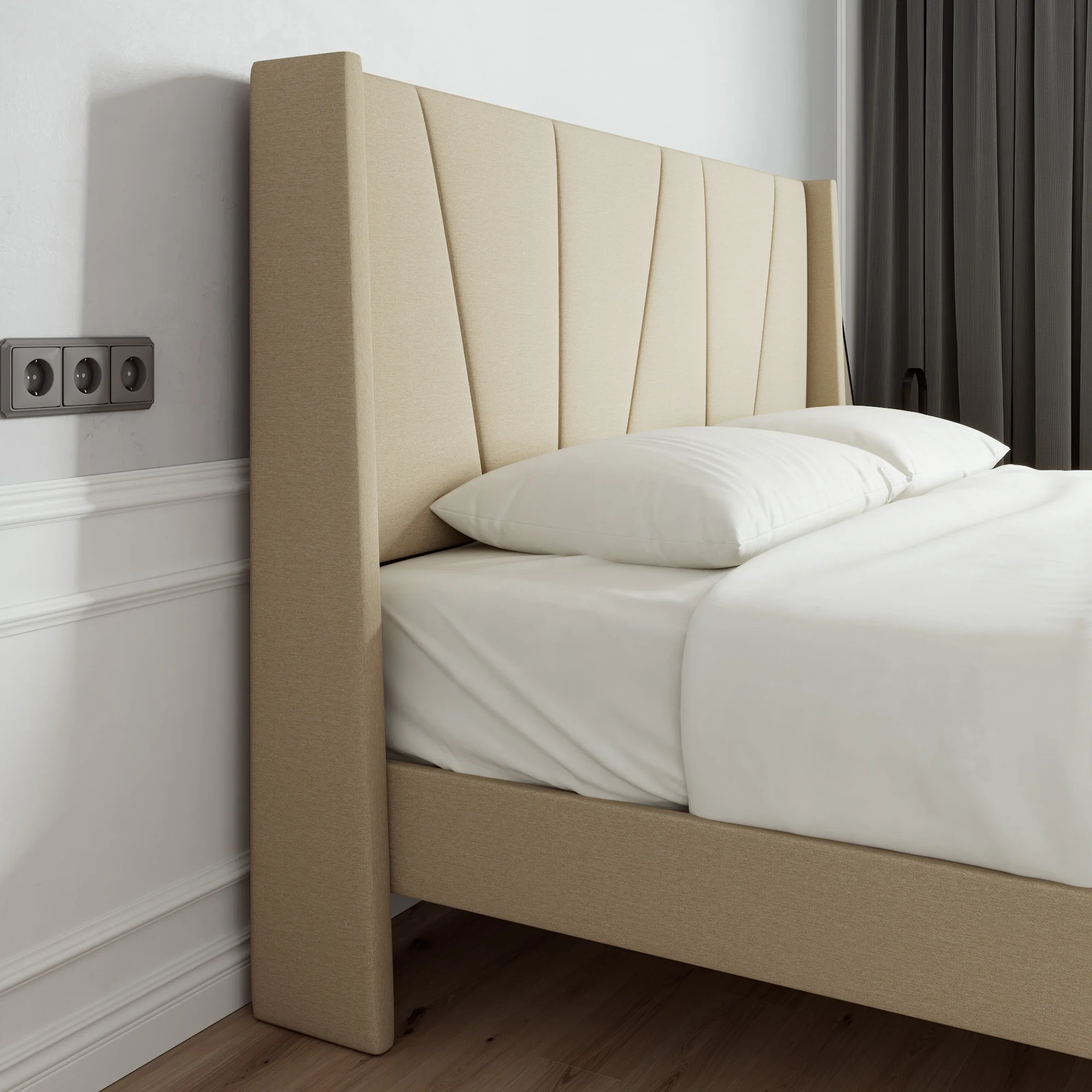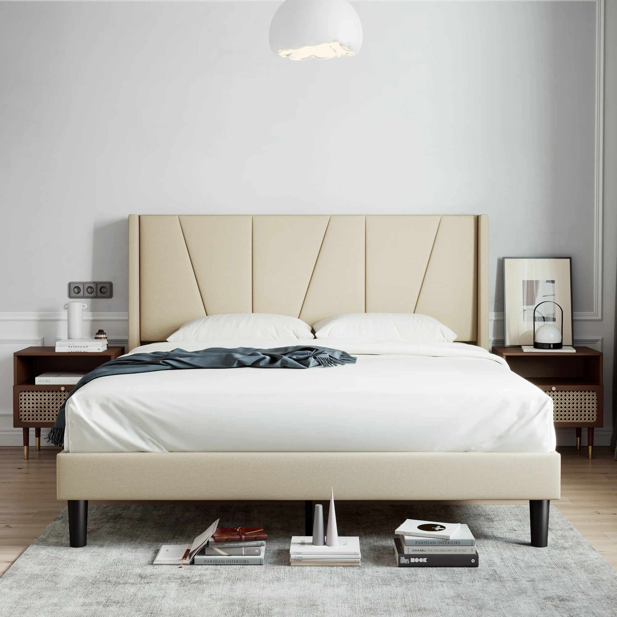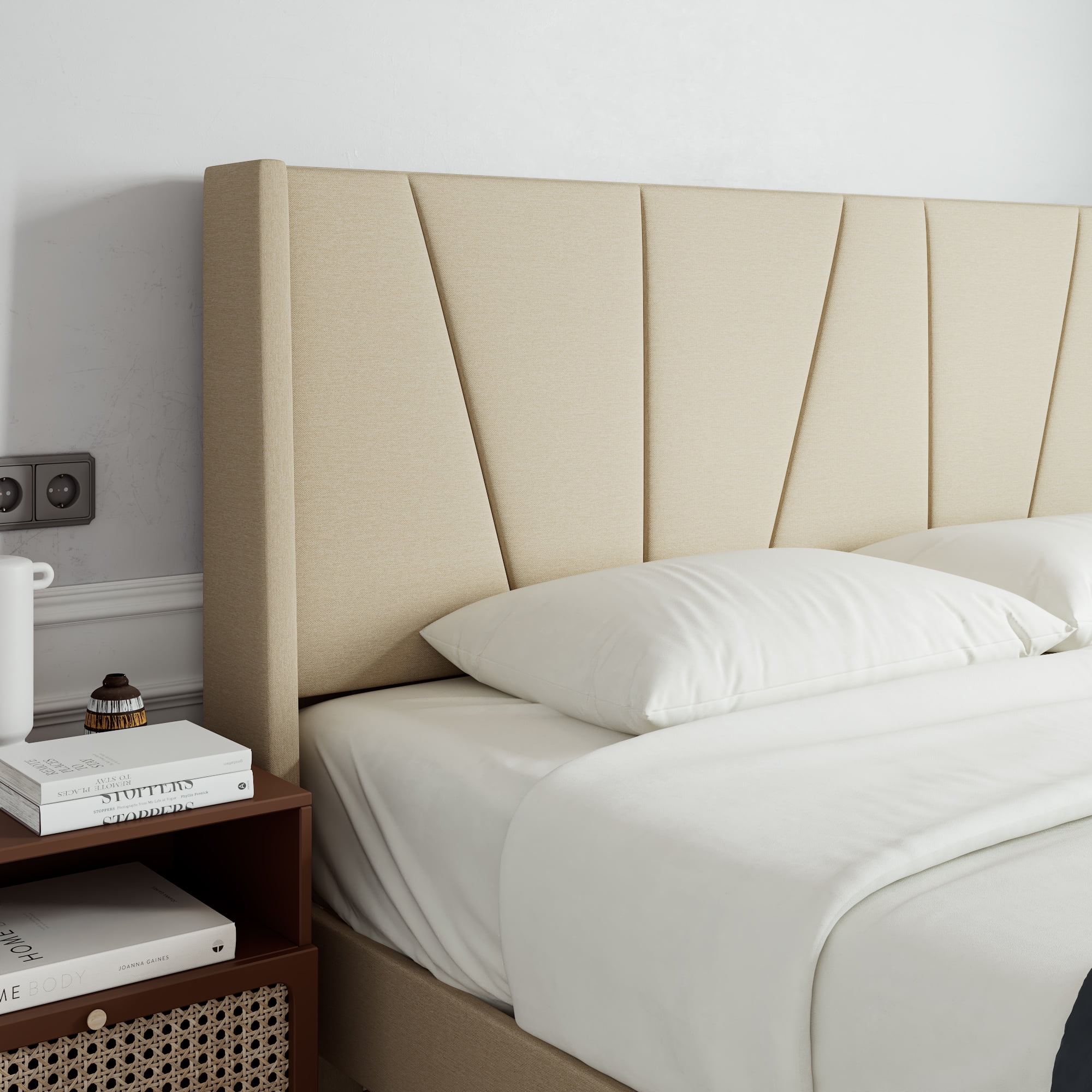 Sha Cerlin King Size Upholstered Platform Bed frame with Geometric Headboard and Wingback, Wood Slat Support, Beige