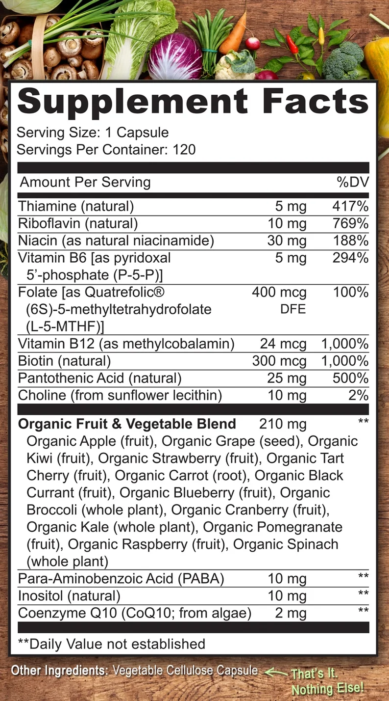 NATURELO Vitamin B Complex with Methyl B12, Methyl Folate, Vitamin B6, Biotin Plus Choline, CoQ10, and Fruit & Vegetable Blend - Supports Energy & Healthy Stress Response - Vegan - 120 Capsules