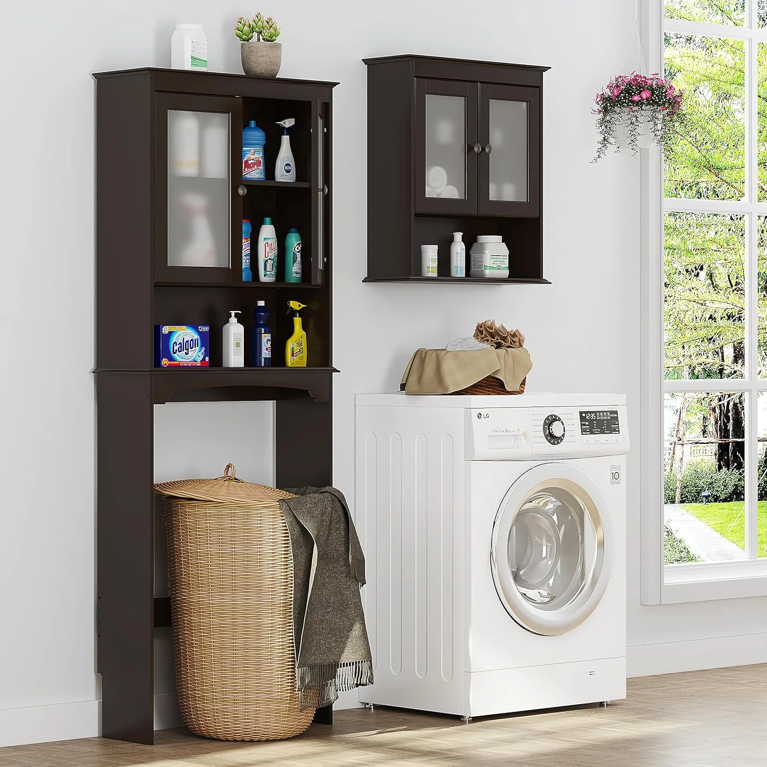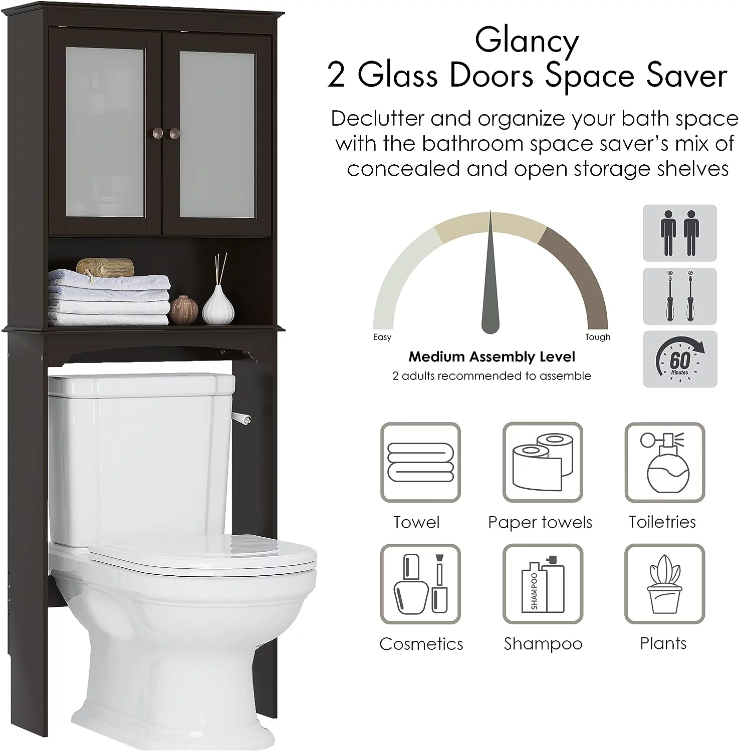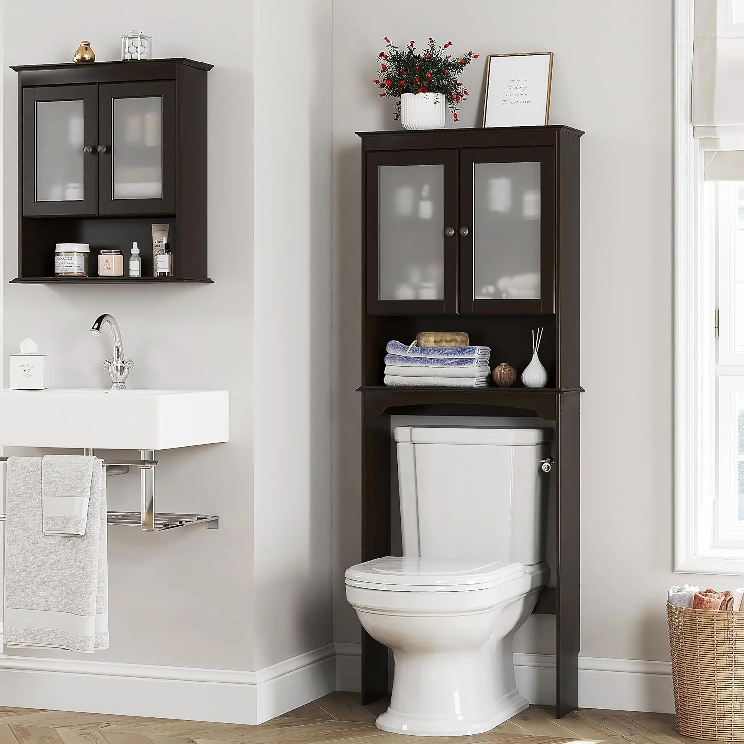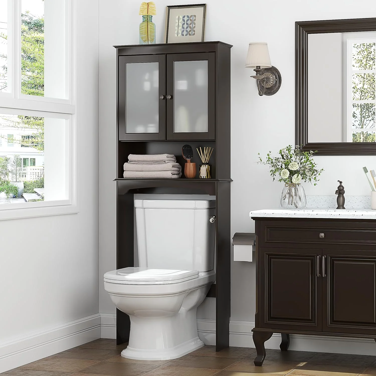WANHUI Over The Toilet Storage Cabinet, Over Toilet Storage Shelf with Glass Doors, Wood Bathroom Organizer Space-Saving Cabinet, Espresso