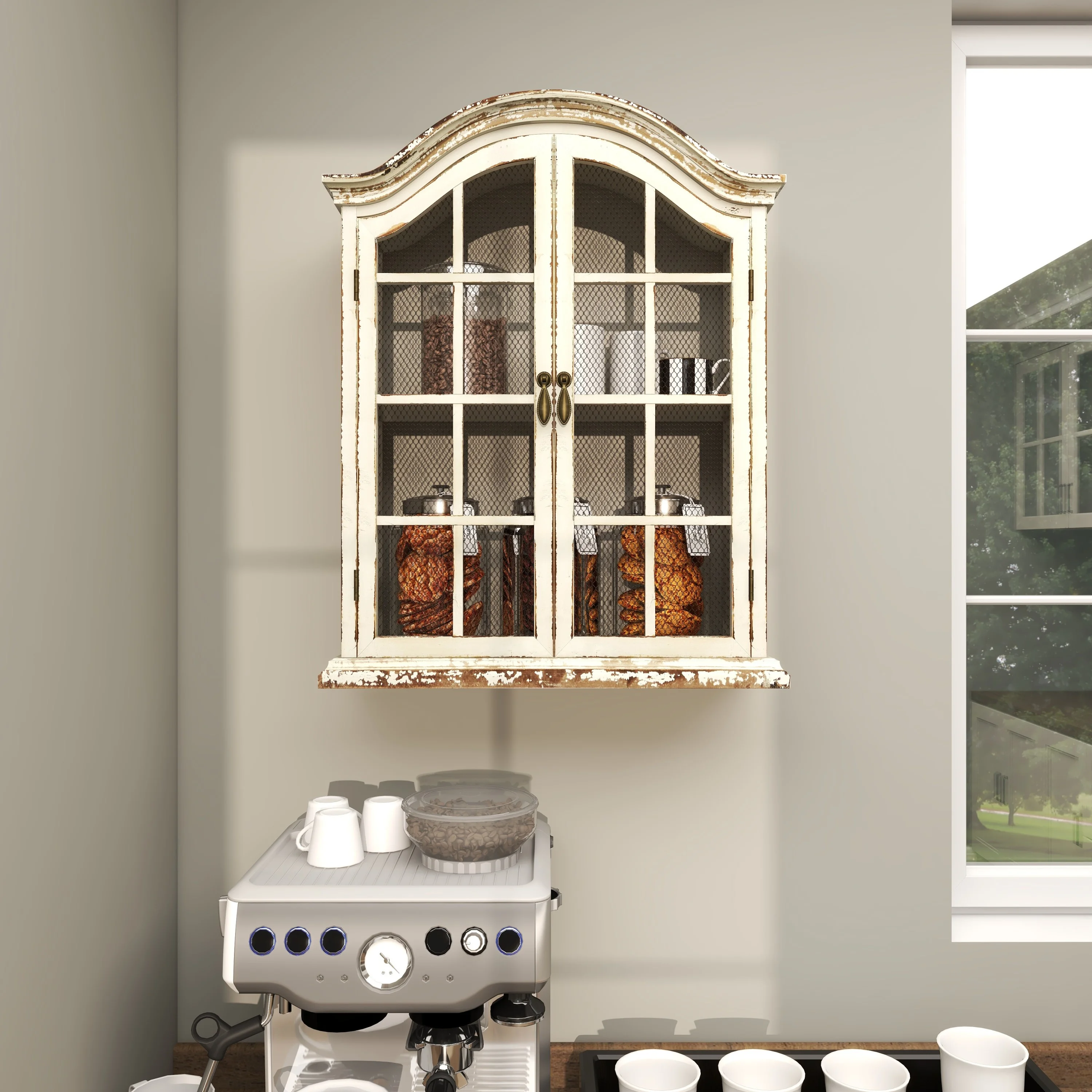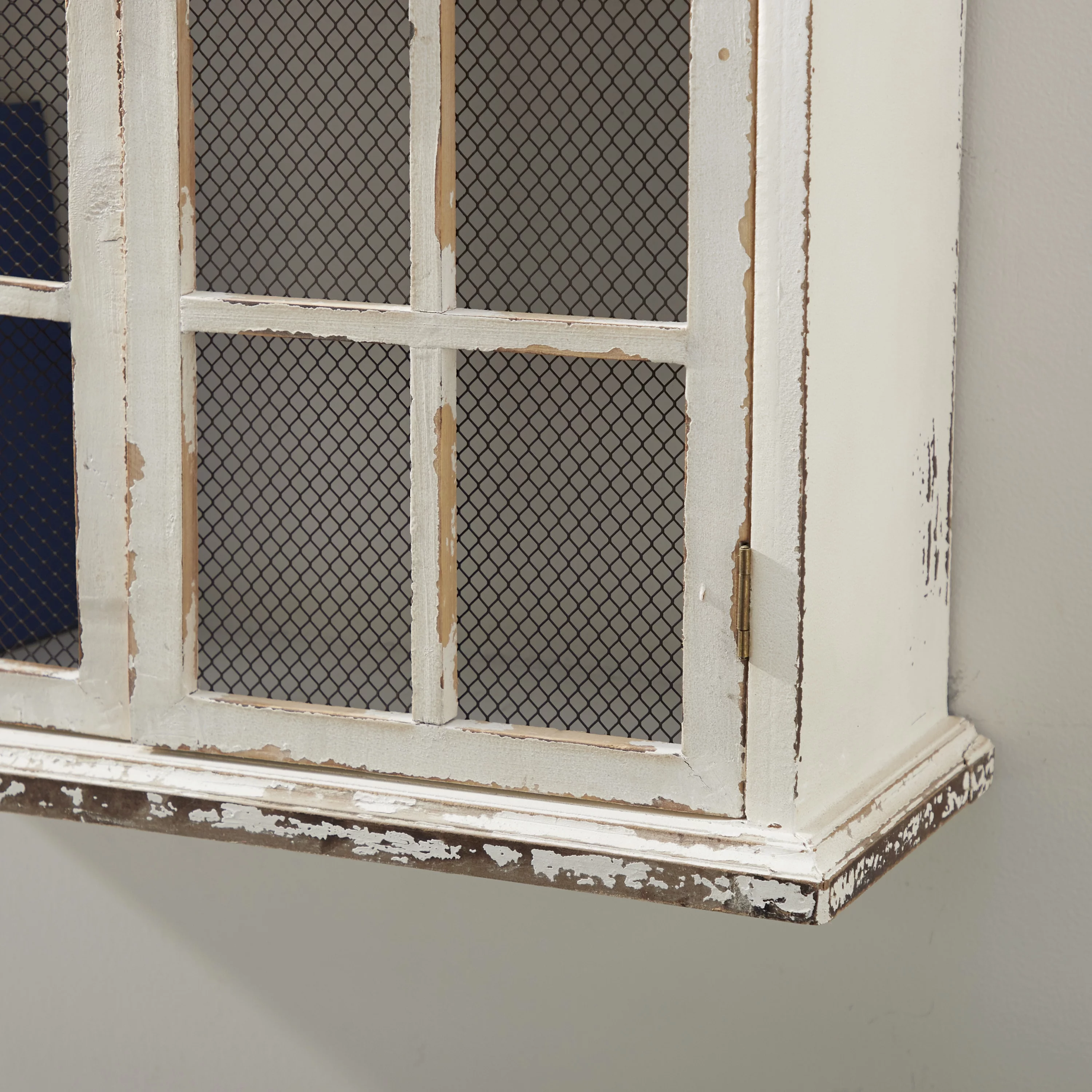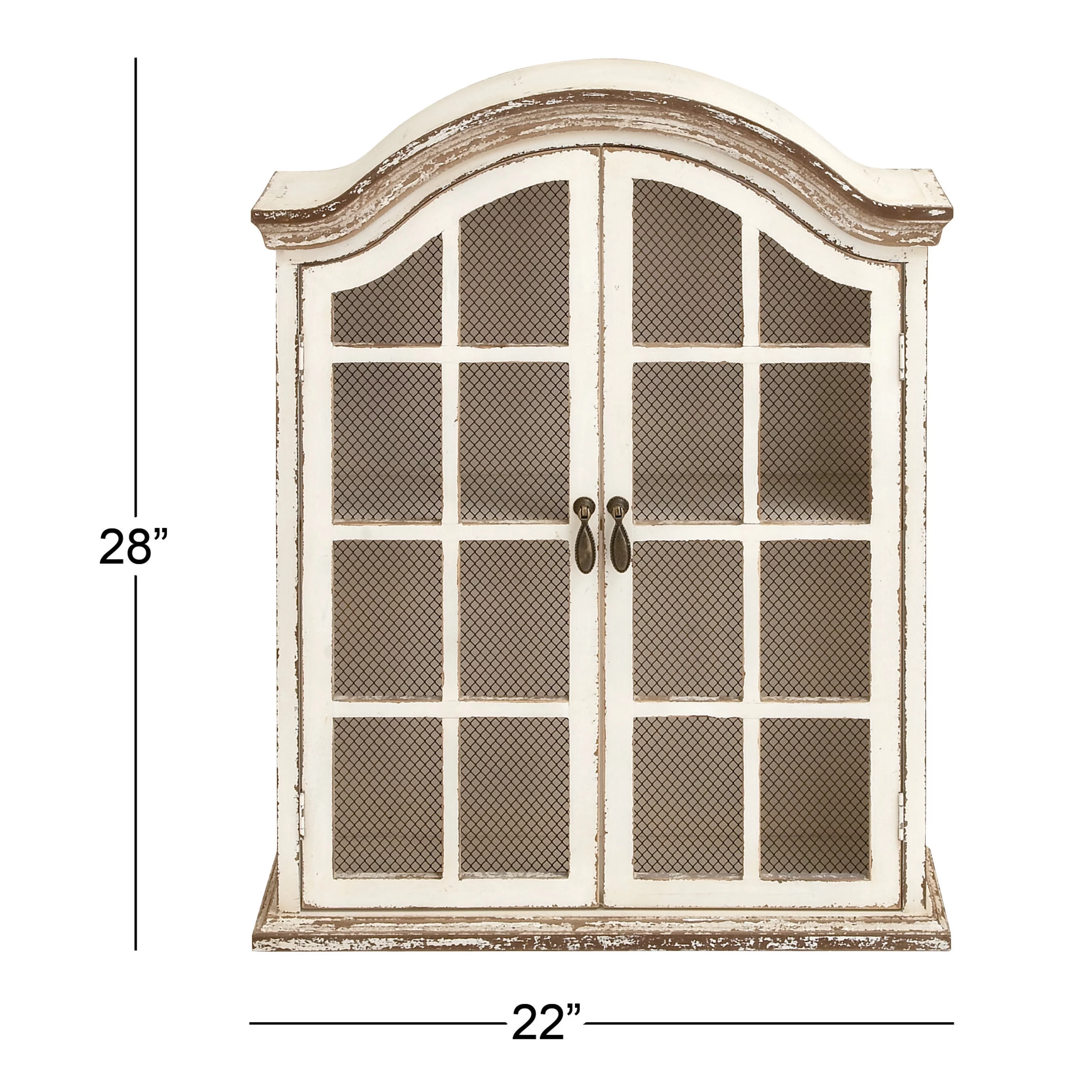 DecMode Vintage White Wood Wall Décor with Glass Doors and Shelving, 22"L x 8"W x 28"H