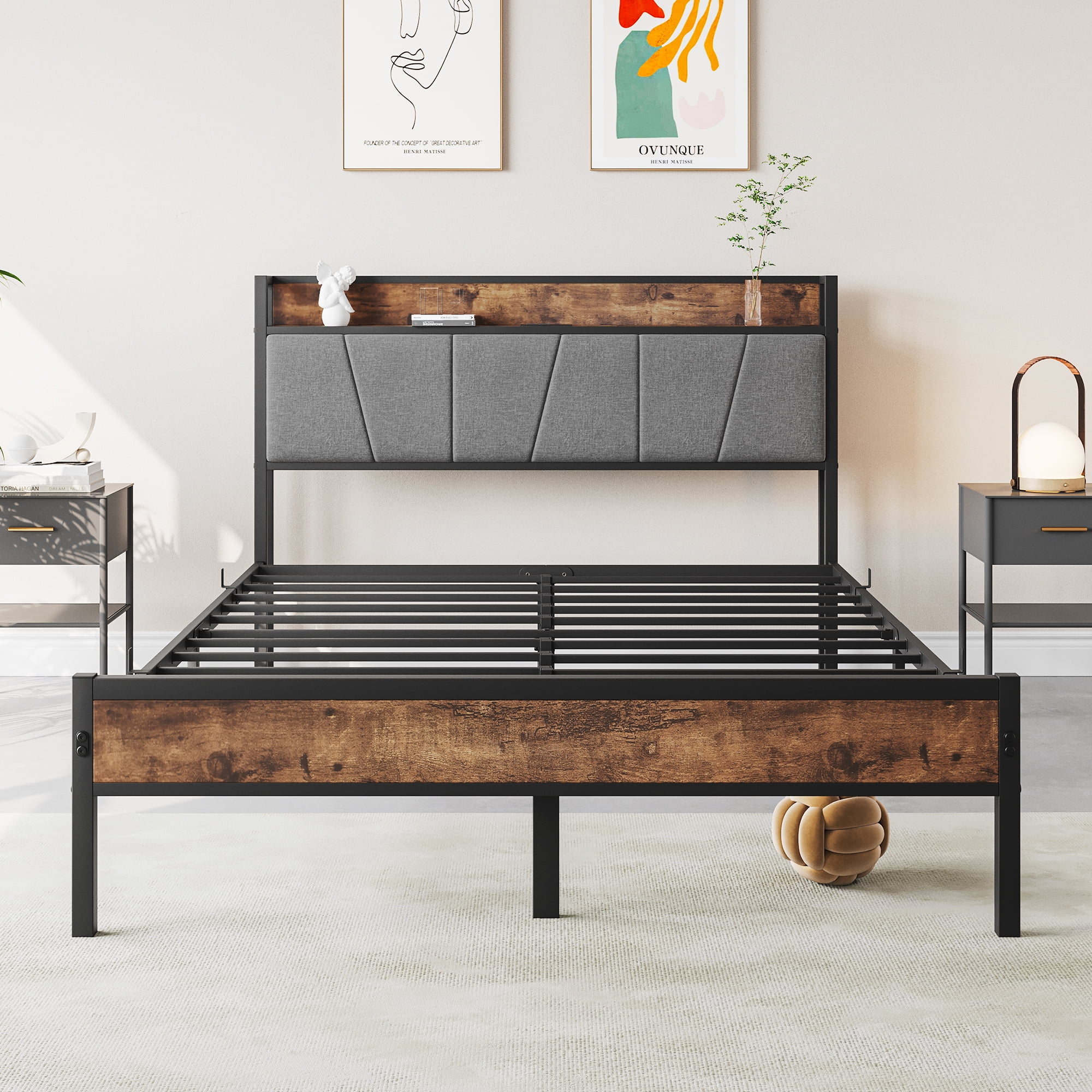 CASEMIOL Queen Bed Frame with Storage Upholstered Headboard, Metal Platform Bed with 2 Charging Station 2 USB for Bedroom Furniture, Sturdy No Noise, No Box Spring Needed, Easy Assembly, Vintage Brown