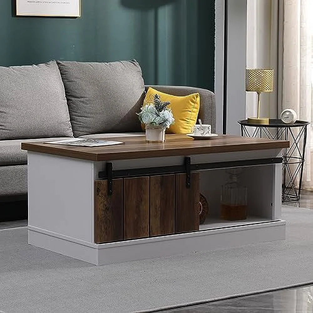 KHBIULIFE Ansley&HosHo Farmhouse Coffee Table with Sliding Barn Doors & Antique Wood Living Room Center Table Rustic Industrial Cocktail Table for Bedroom Home Office White+Da