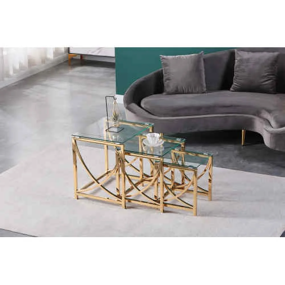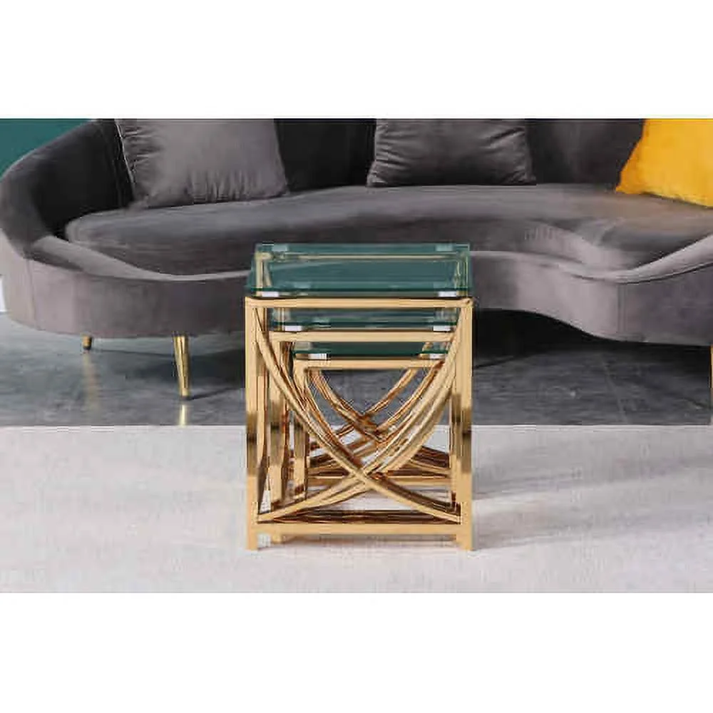 VREKEF 3 Pieces Gold Square Nesting Glass End Tables- Small Coffee Table Set- Stainless Steel Small Coffee Tables with Clear Tempered Glass- 18" Modern Minimalist Side Table for Living Room (Curve)