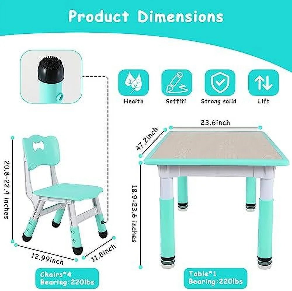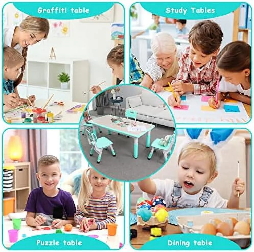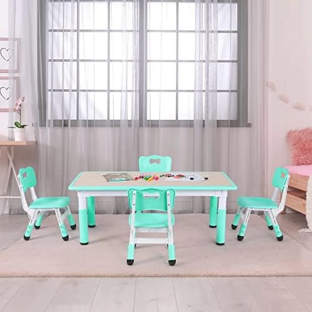 HJZBNONE Big Study Table and 4 Chair Set Height Adjustable Toddler Table and Chair Set for 4 Multifunctional Toddler Table Reading Drawing Eating Interaction (Light Green Long Tabl