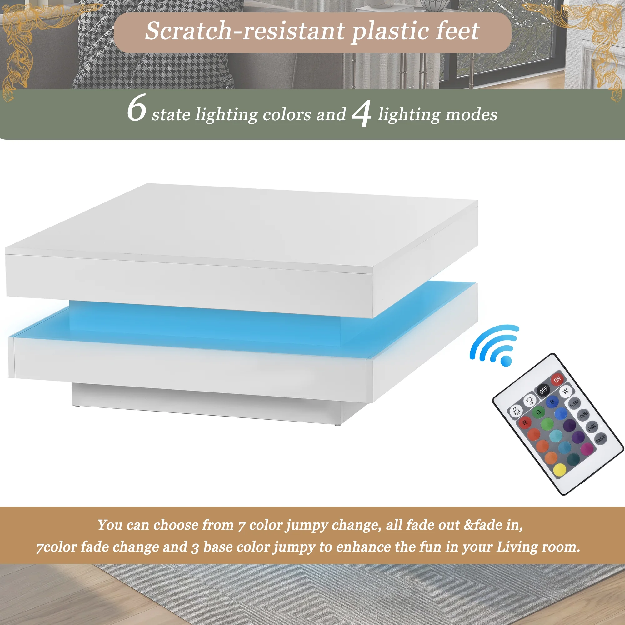 EUROCO 31.5" Coffee Table with Waterproof UV Surface,2-Tier Square LED Center Table White High Gloss Finish