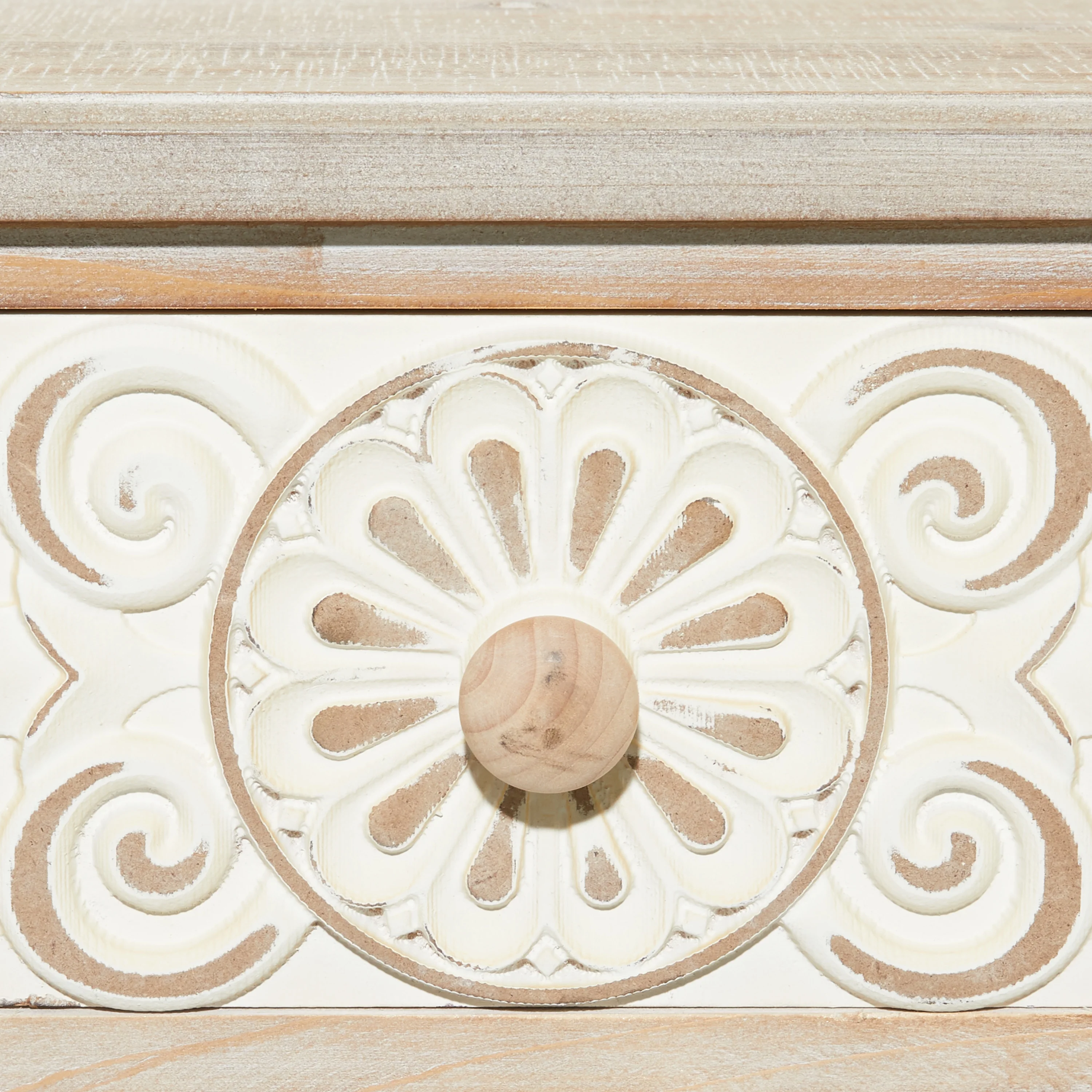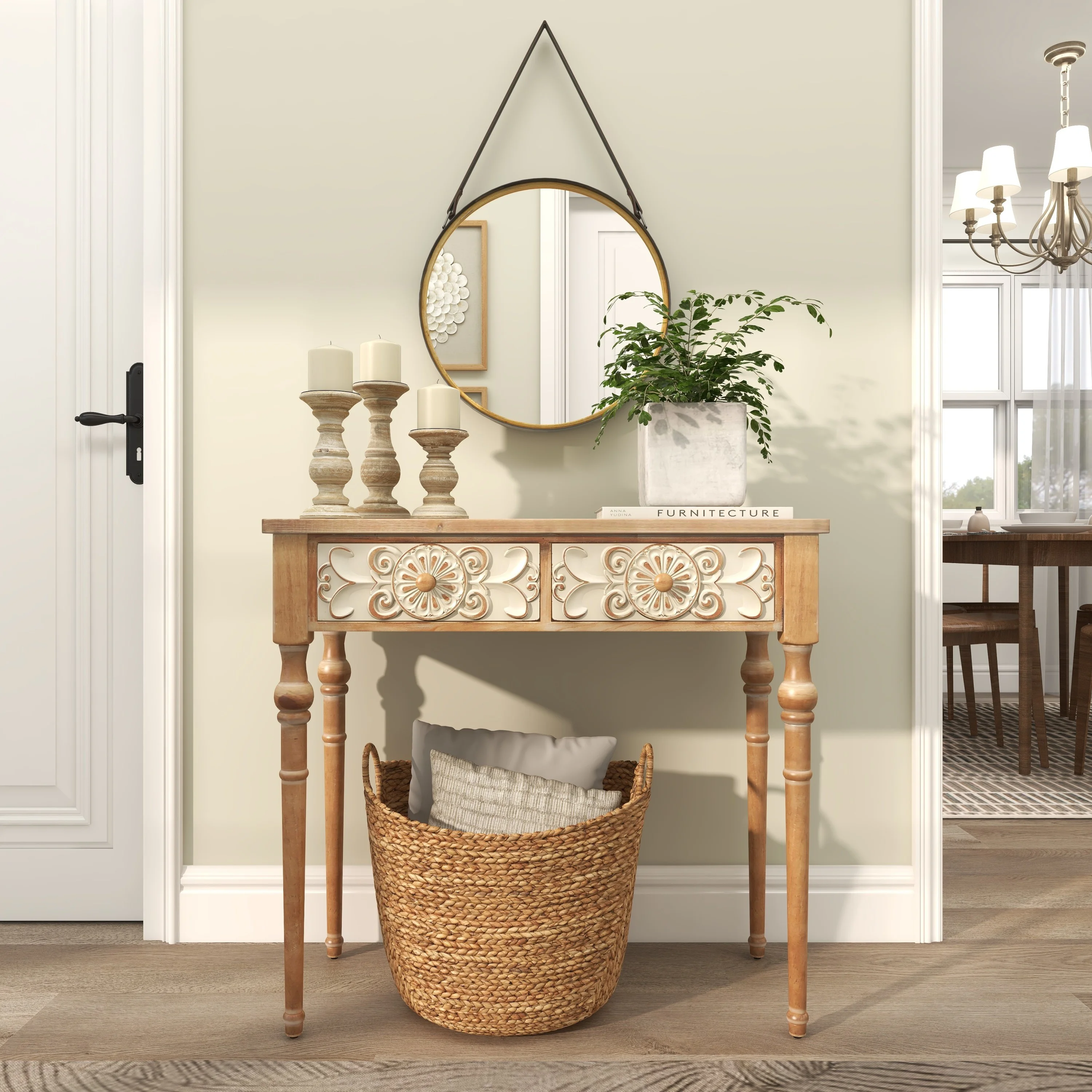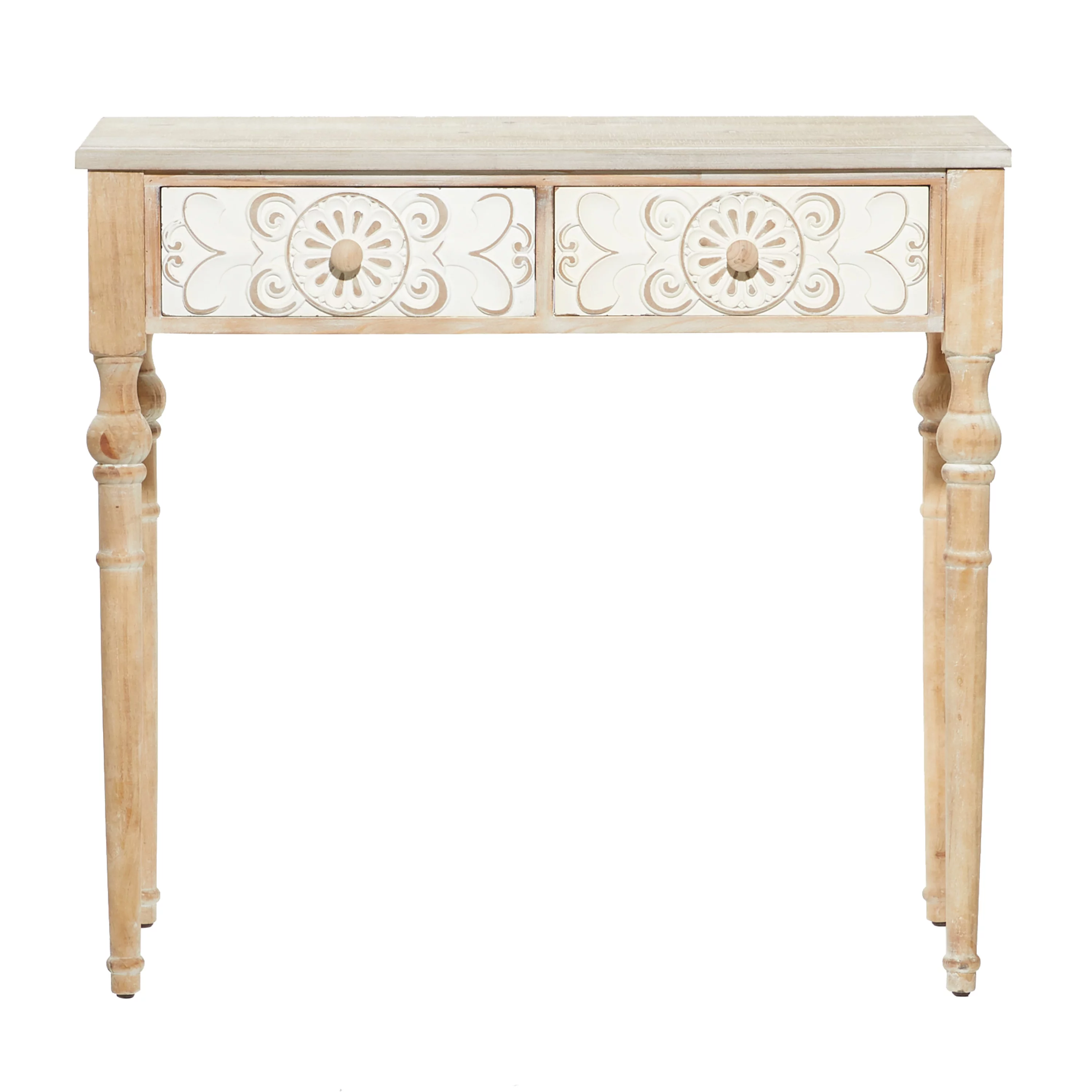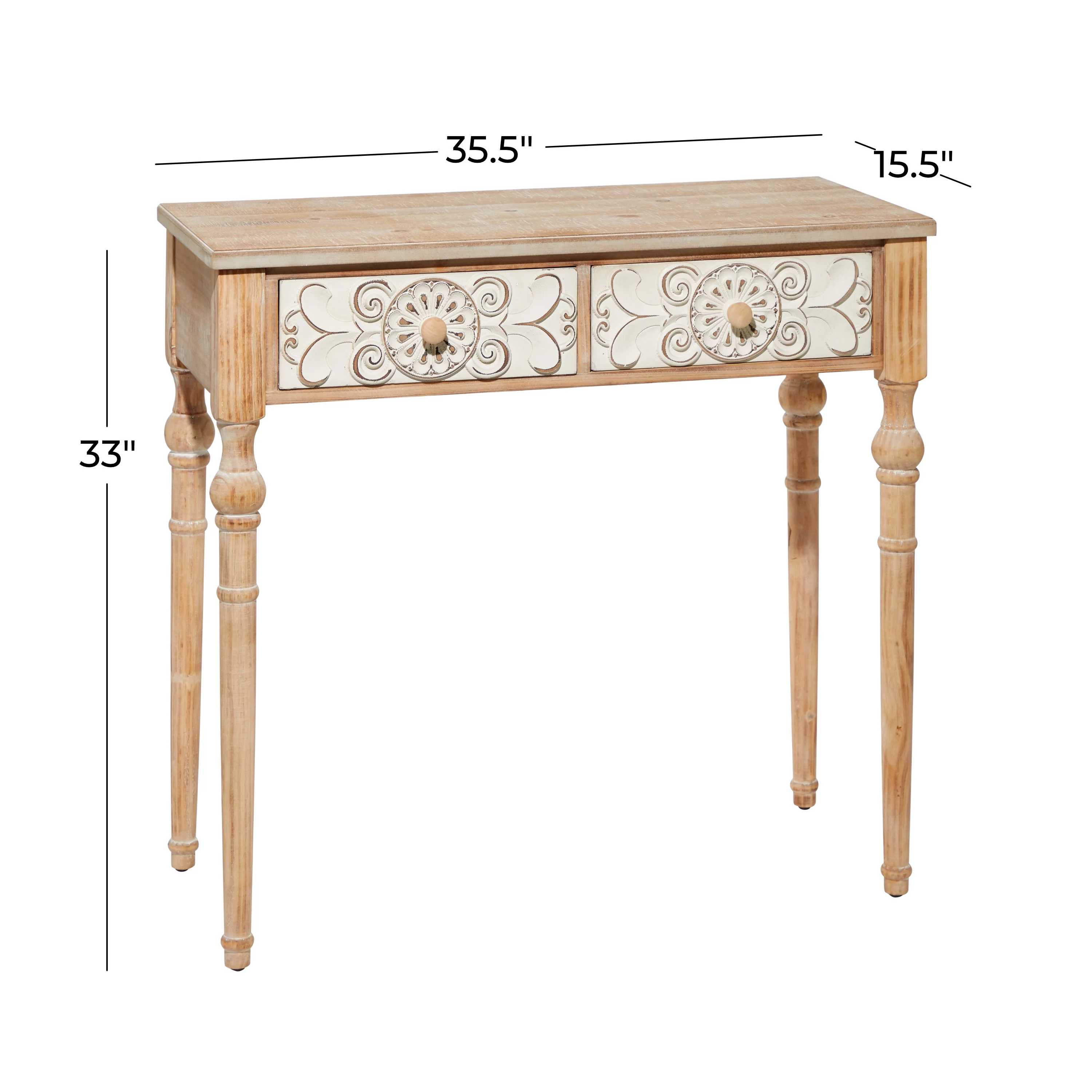 DecMode 36" x 33" Brown Wood Intricately Carved Floral 2 Drawers Console Table, 1-Piece