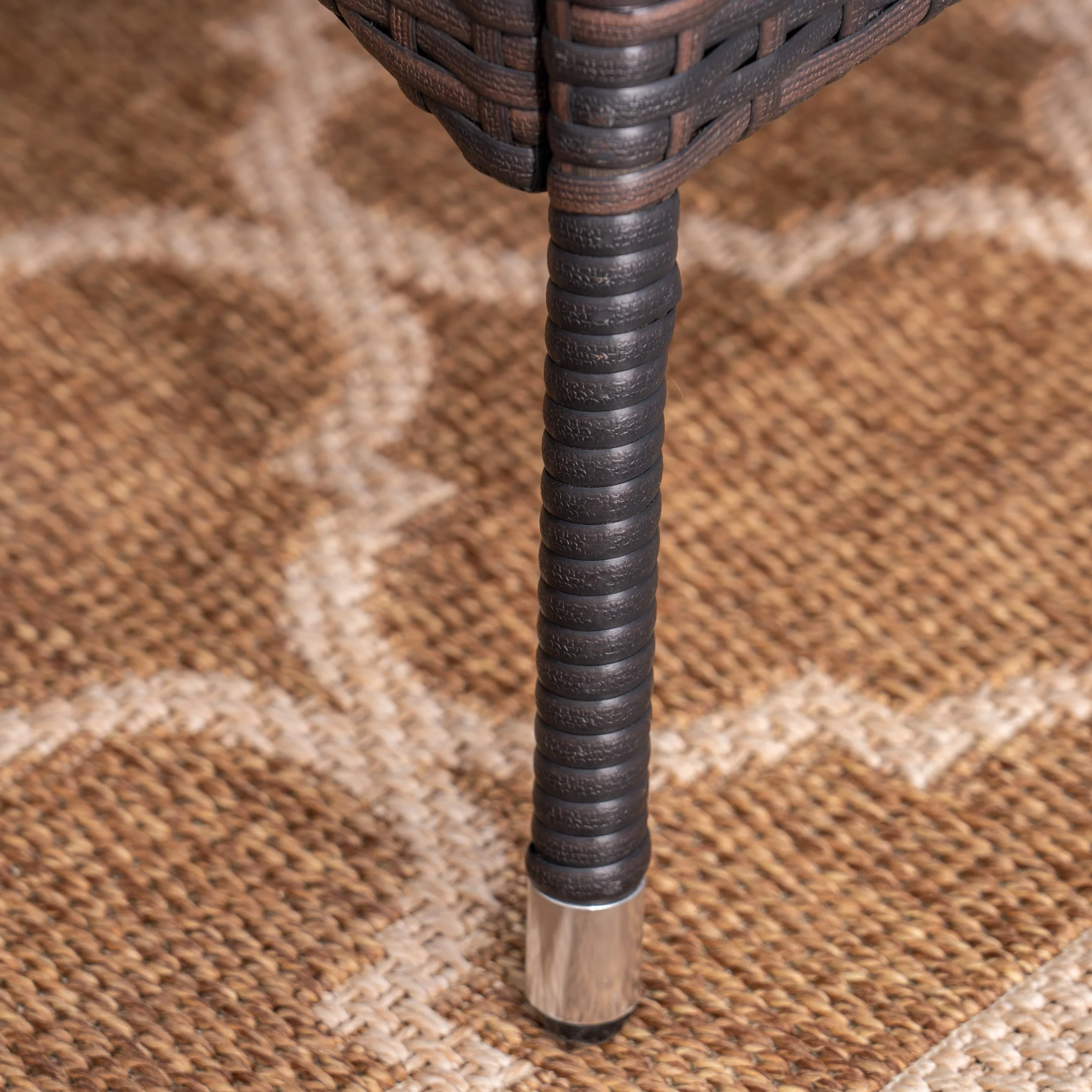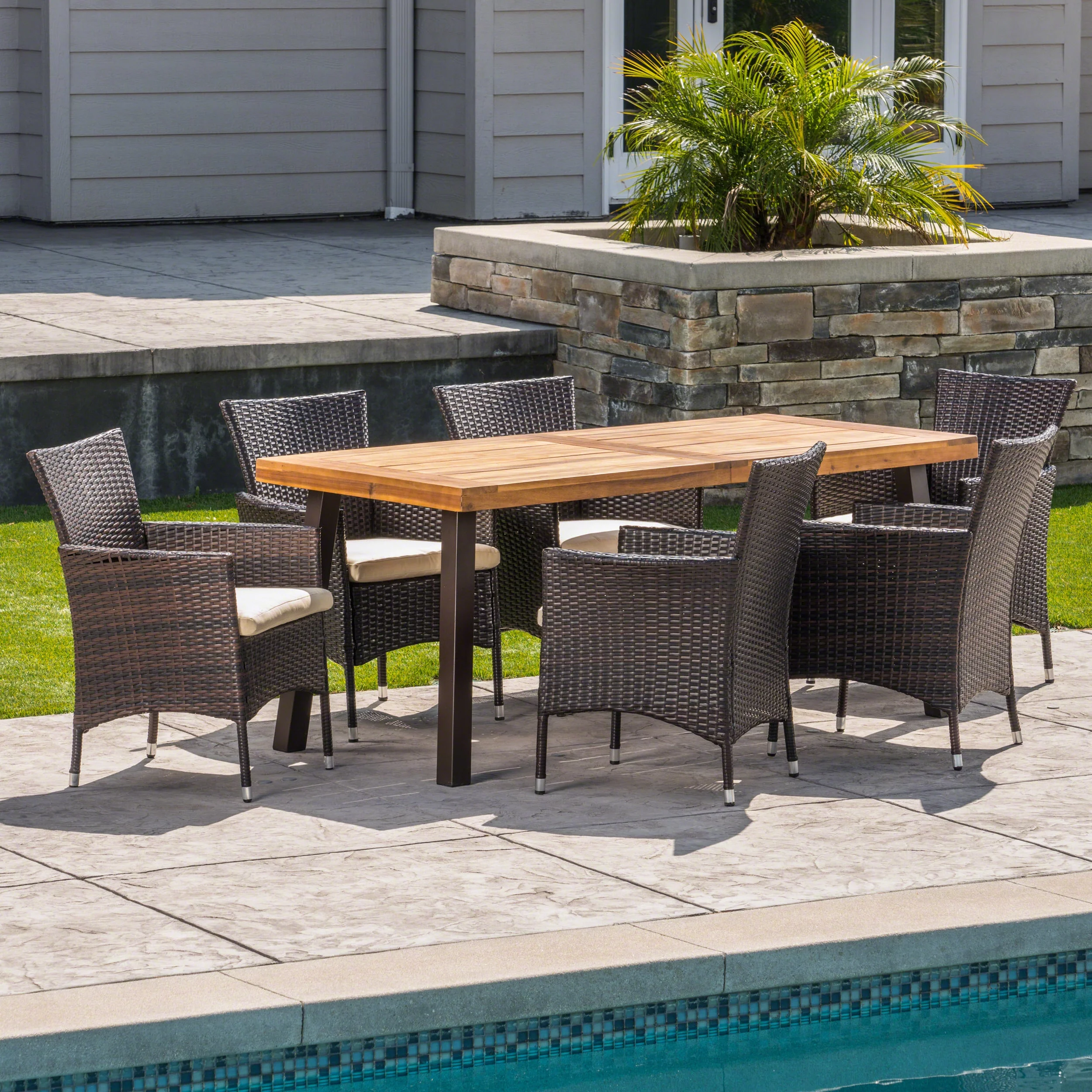 Outdoor 7 Piece Acacia Wood/Wicker Dining Set with Cushions, Multibrown, Beige, Teak