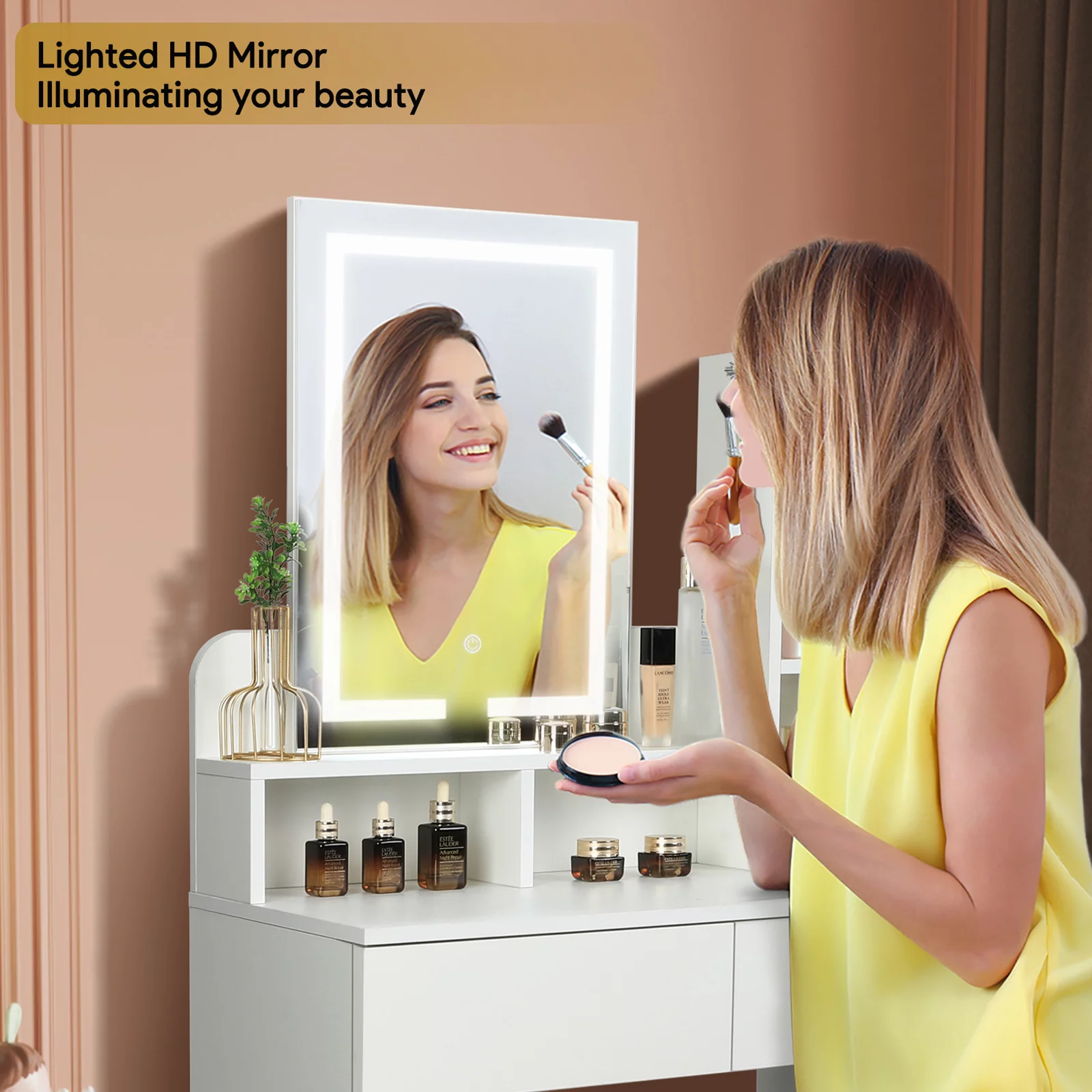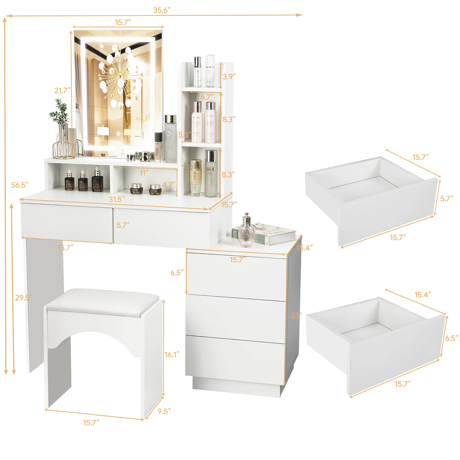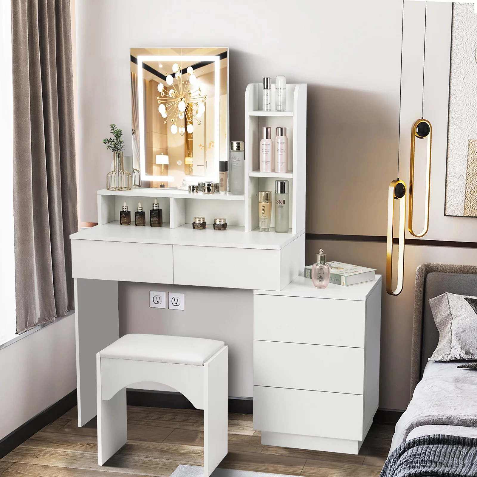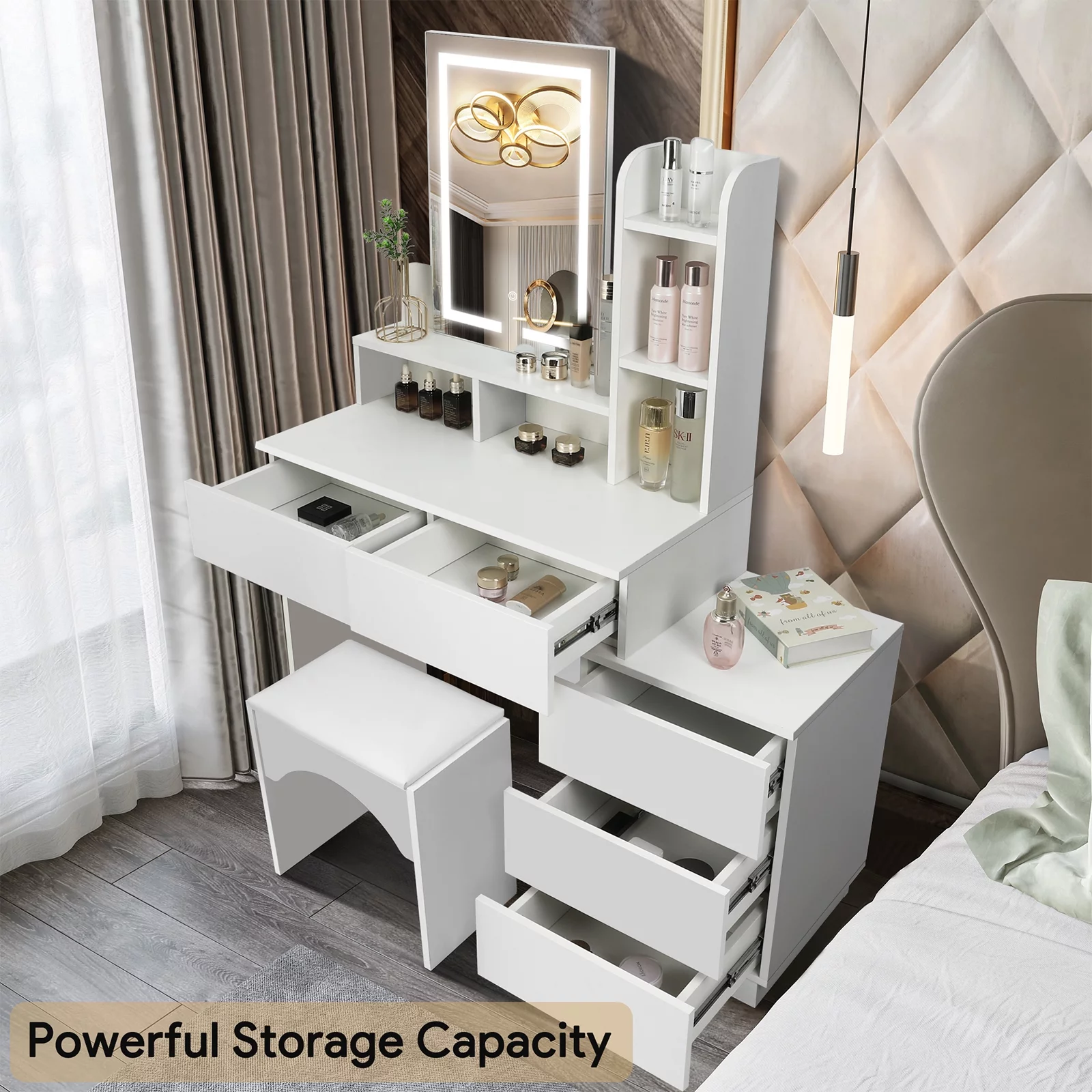 Vanity Table Set with Lighted Mirror, Makeup Table with 5 Drawers, Dressing Vanity Tables, Dresser Desk for Girls Women