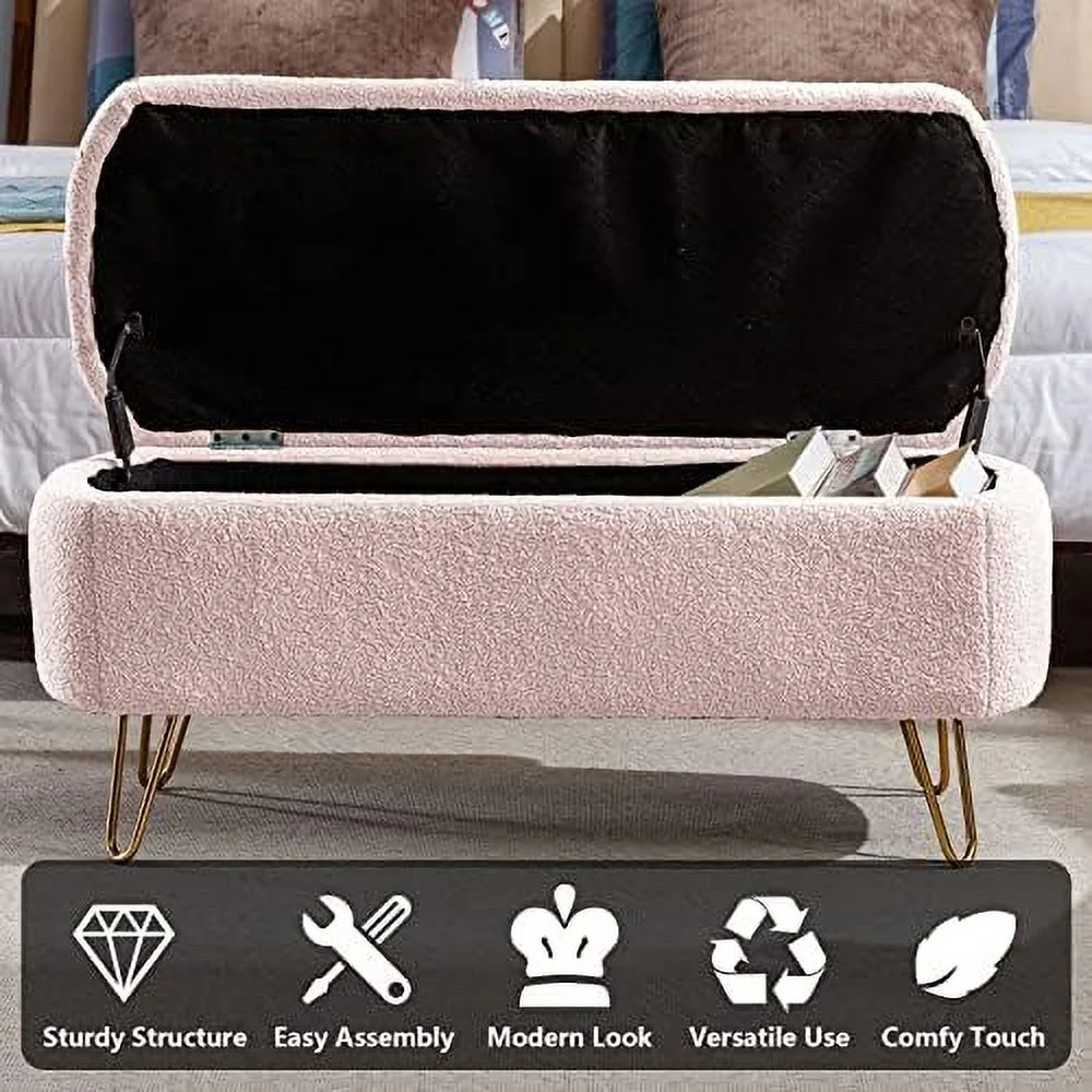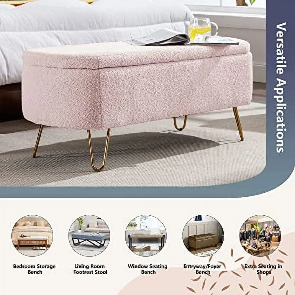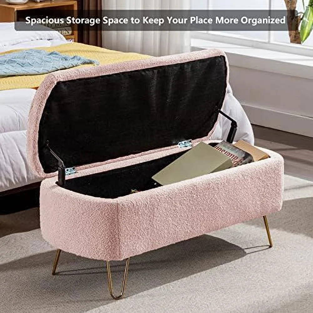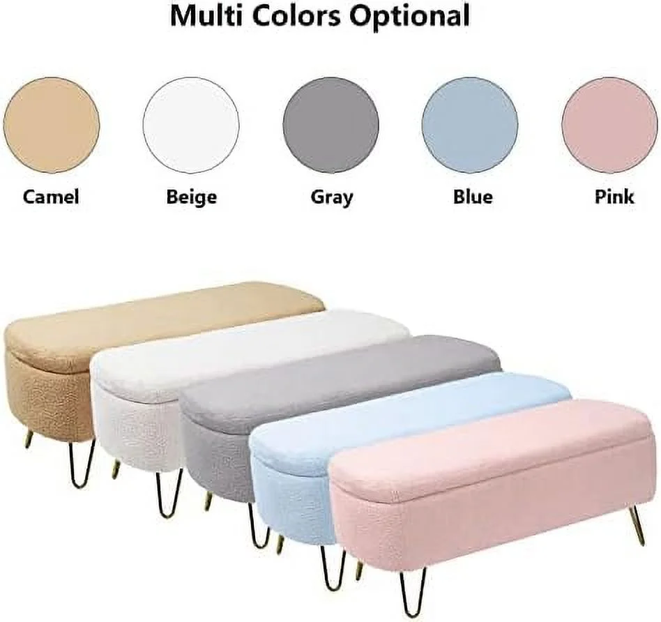 Oval End of Bed 47.24" Comfy Boucle Fabric Ottoman Bench Lift Top Long Bedroom Ottoman Bench Window Seating Bench Footrest for Living Room Entryway (Cream White)