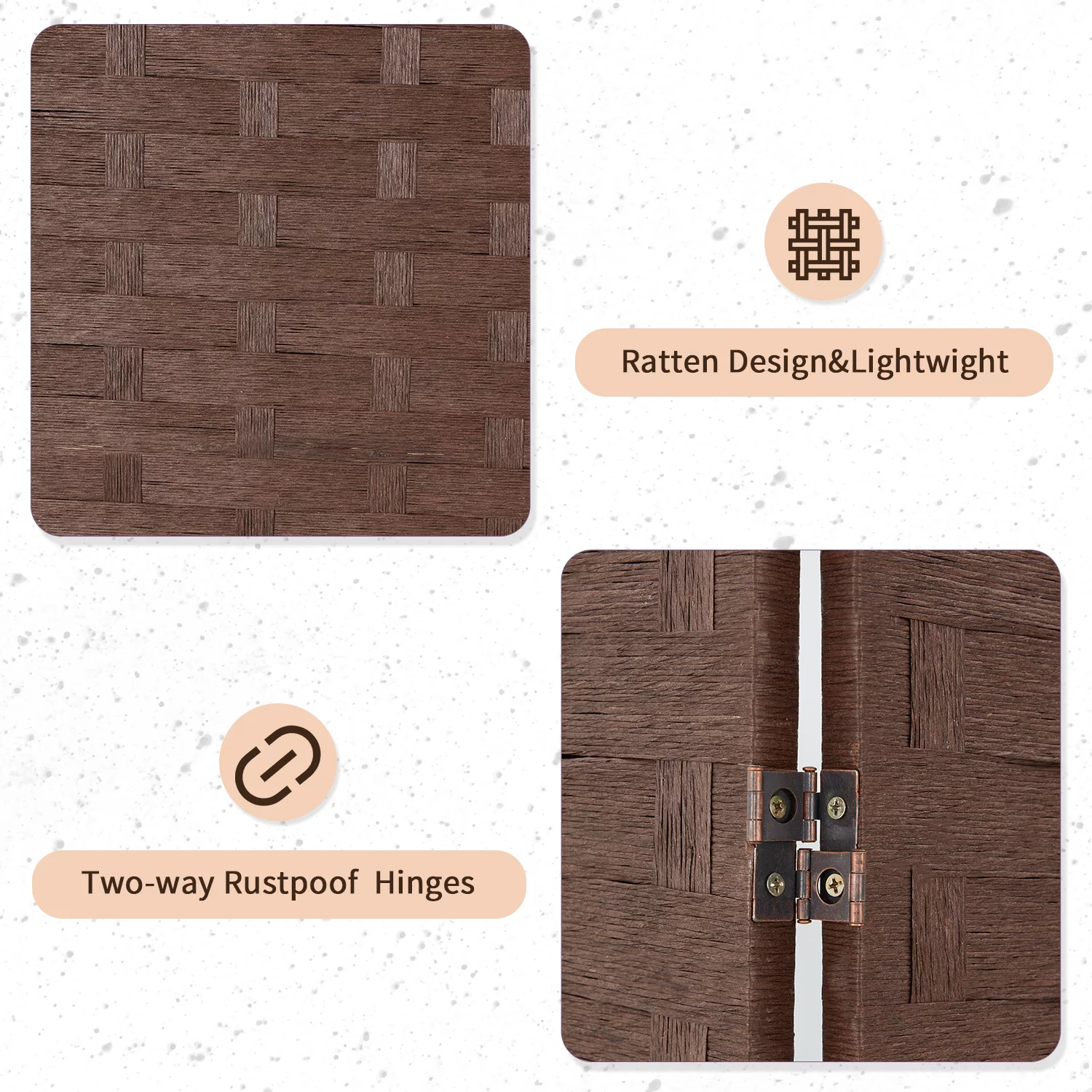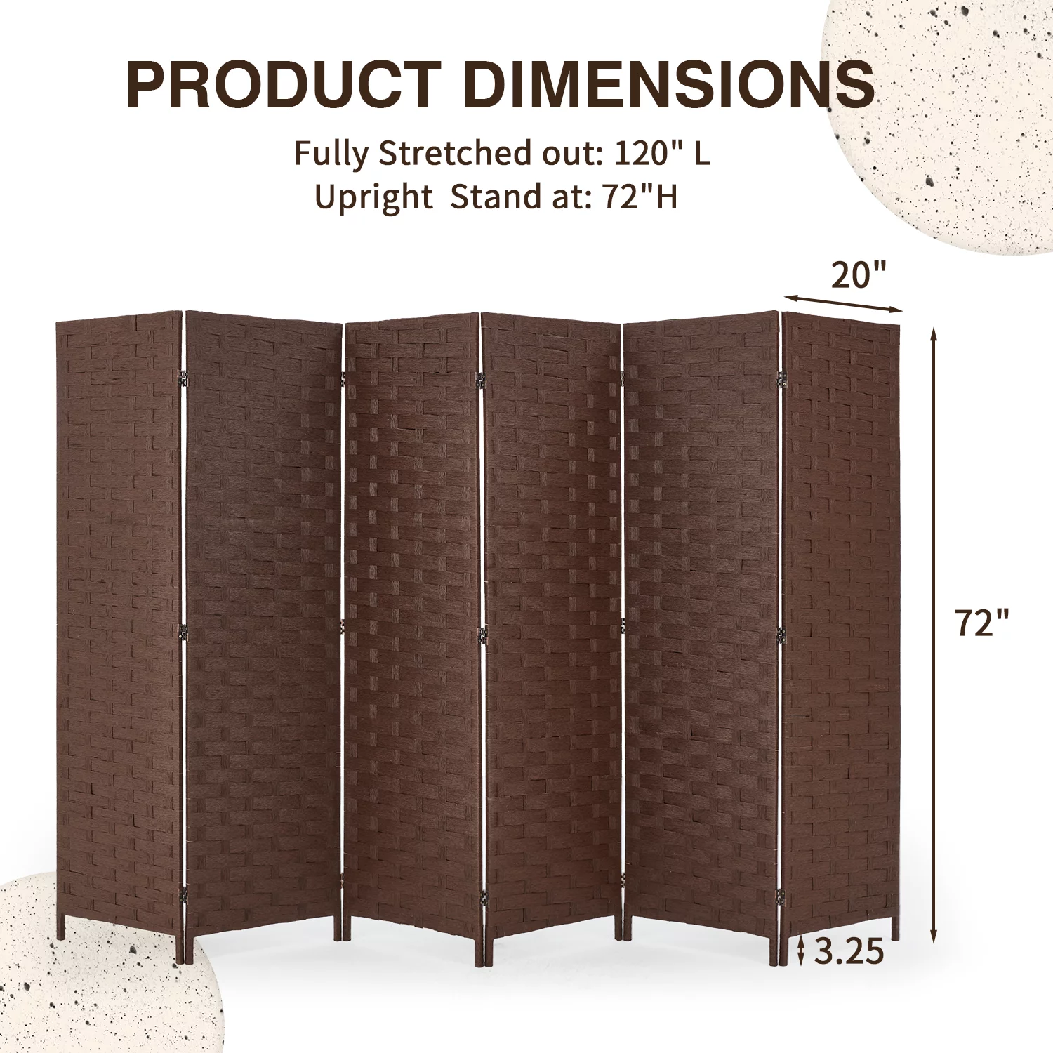 YODOLLA 6 Panels Room Divider, 6 FT Tall Weave Fiber Room Divider, Double Hinged Folding Privacy Screens, Freestanding Room Dividers, Brown