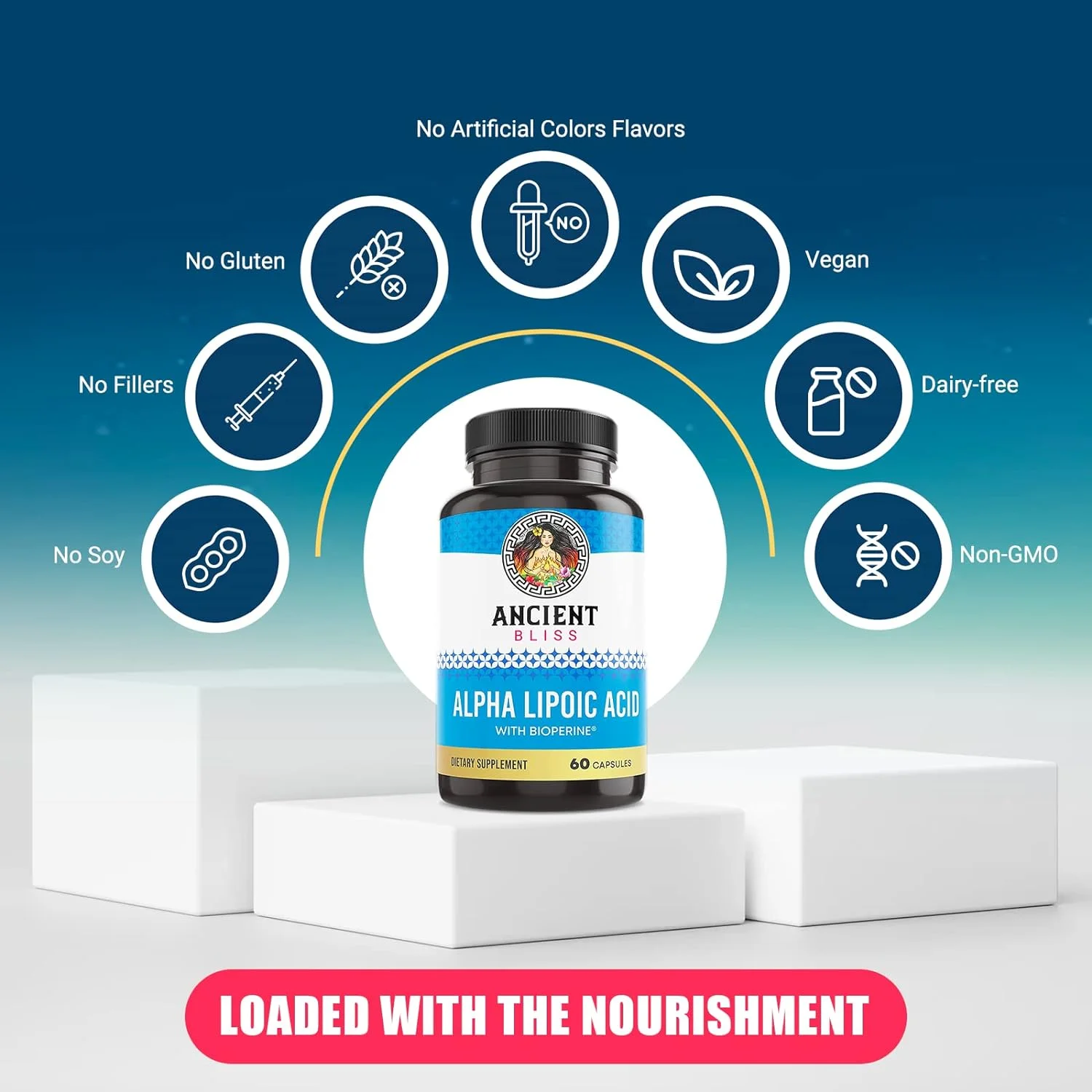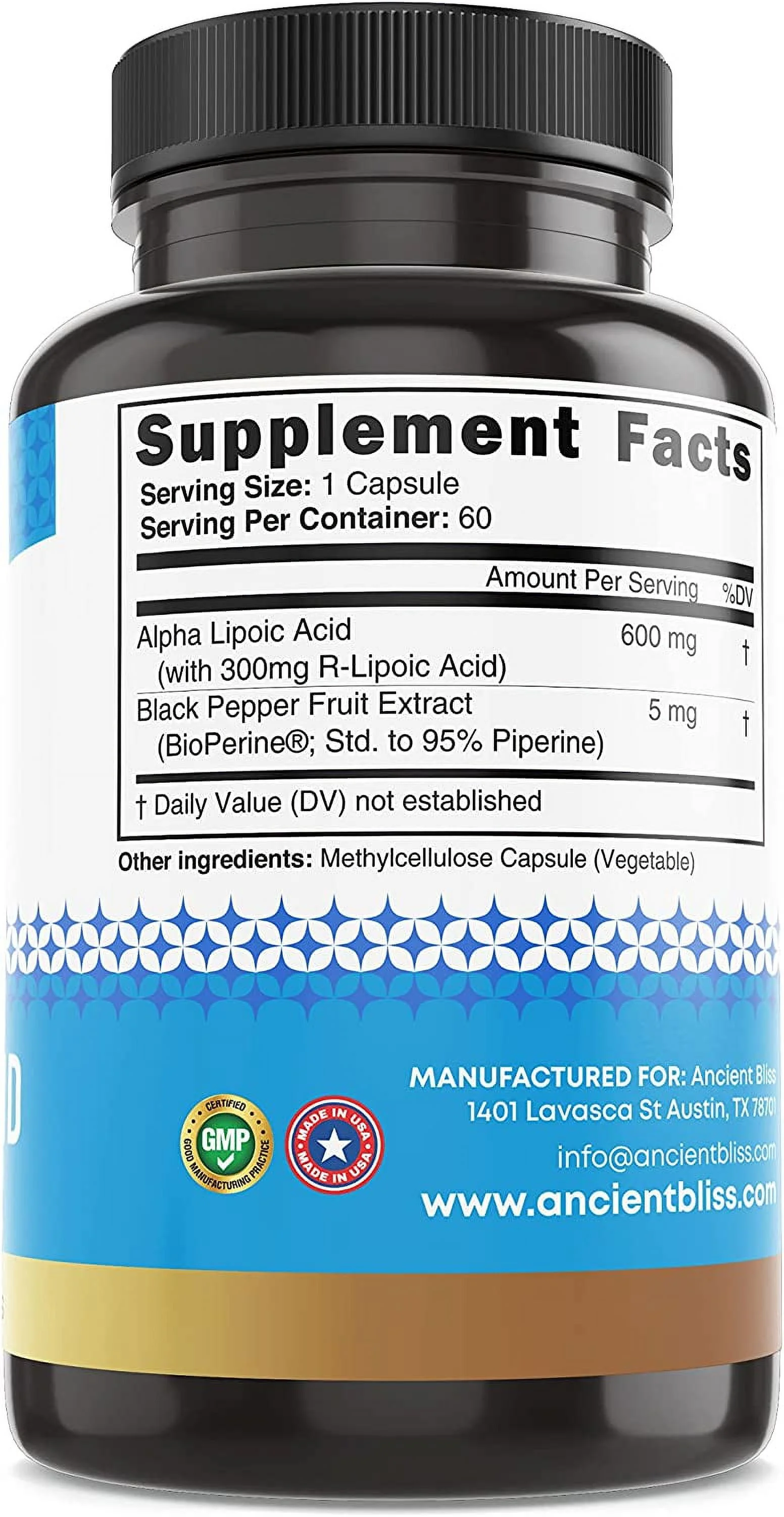 Ancient Bliss Alpha Lipoic Acid Supplement, Antioxidant and Energy Support, Herbal Ingredients, No Gluten or Soy, 600mg per Serving, 60 Vegan Capsules