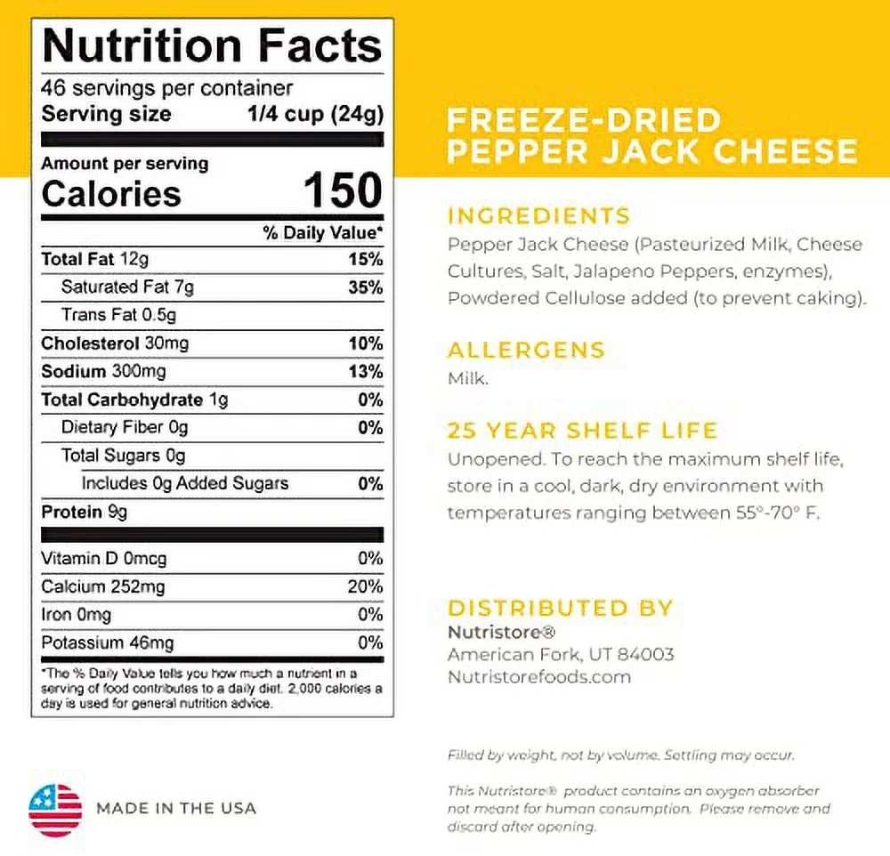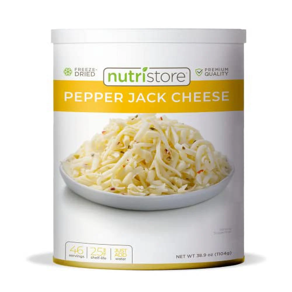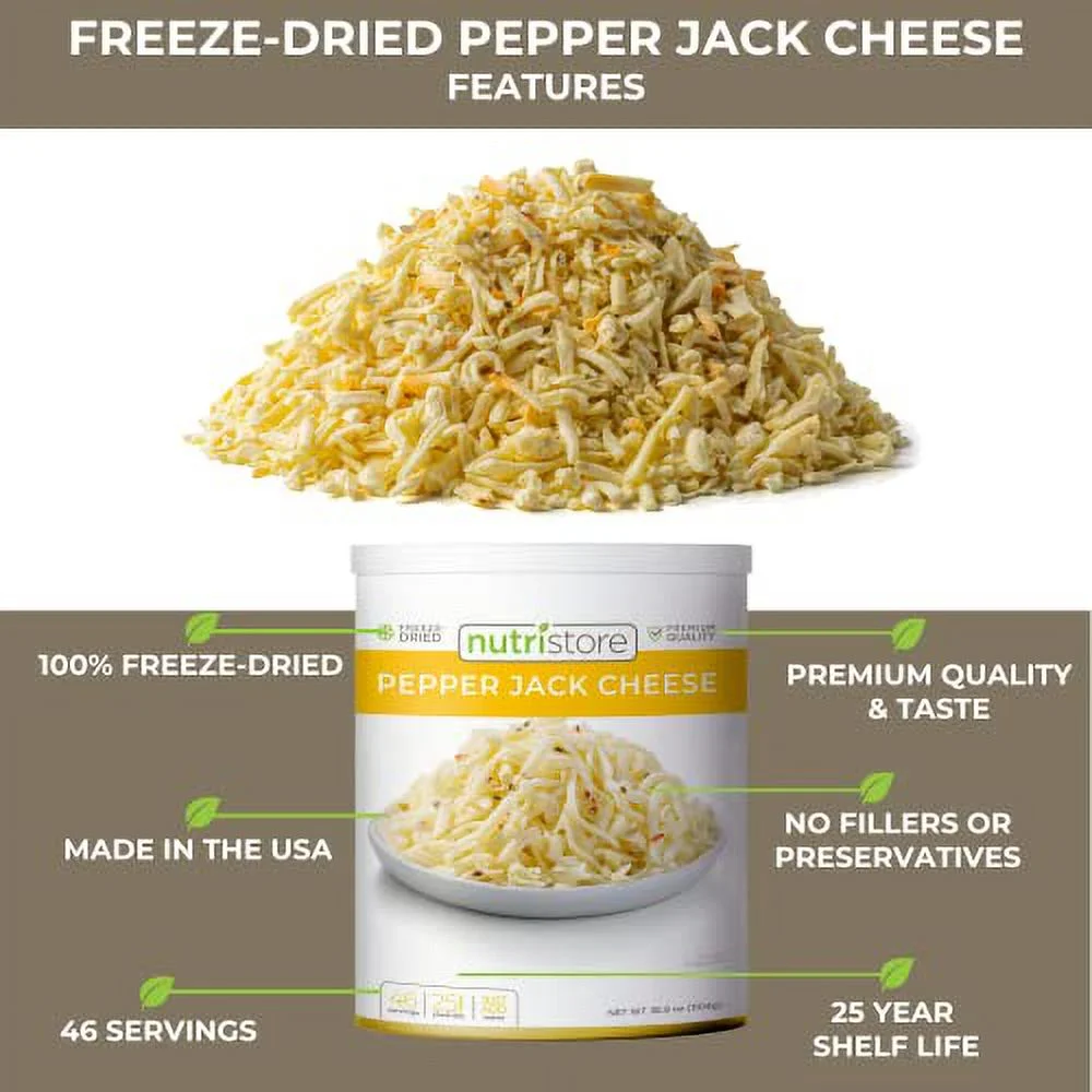Nutristore Freeze-Dried Pepper Jack Cheese Shredded | Amazing Taste & Quality | Perfect for Snacking & Backpacking, Camping Meals | Emergency Survival Food Storage | 25 Year Shelf-Life