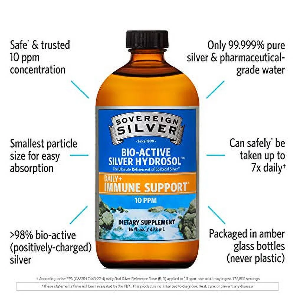 Sovereign Silver Bio-Active Silver Hydrosol for Immune Support - Colloidal Silver -10 ppm, 16oz (473mL) - Economy Size