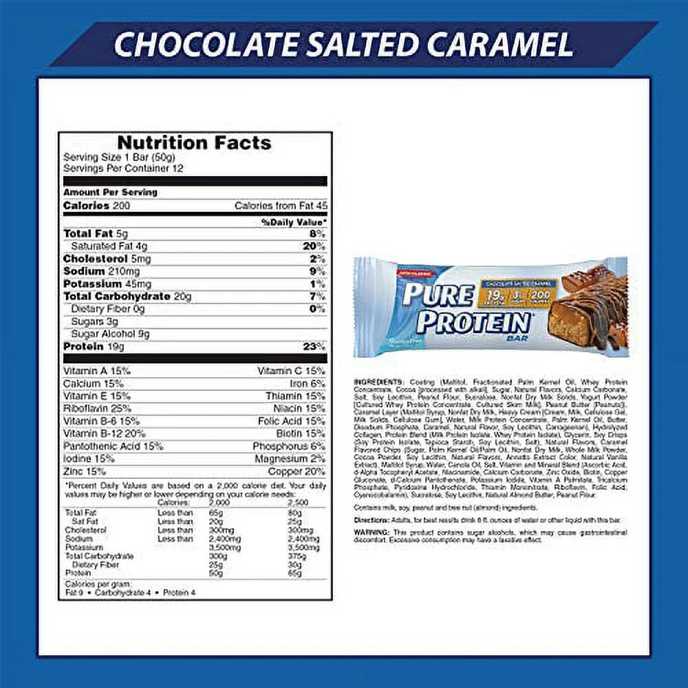 Pure Protein Bars, High Protein, Nutritious Snacks to Support Energy, Low Sugar, Gluten Free, Chocolate Salted Caramel, 1.76oz, 12 Pack