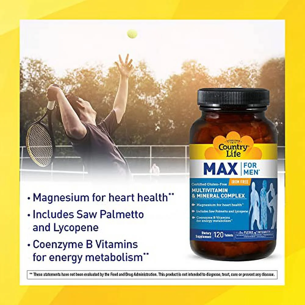 Country Life Max for Men, Multivitamin & Mineral Complex, Iron-Free, Vegetarian Tablets, 120 Count, Certified Gluten Free, Certified Vegetarian