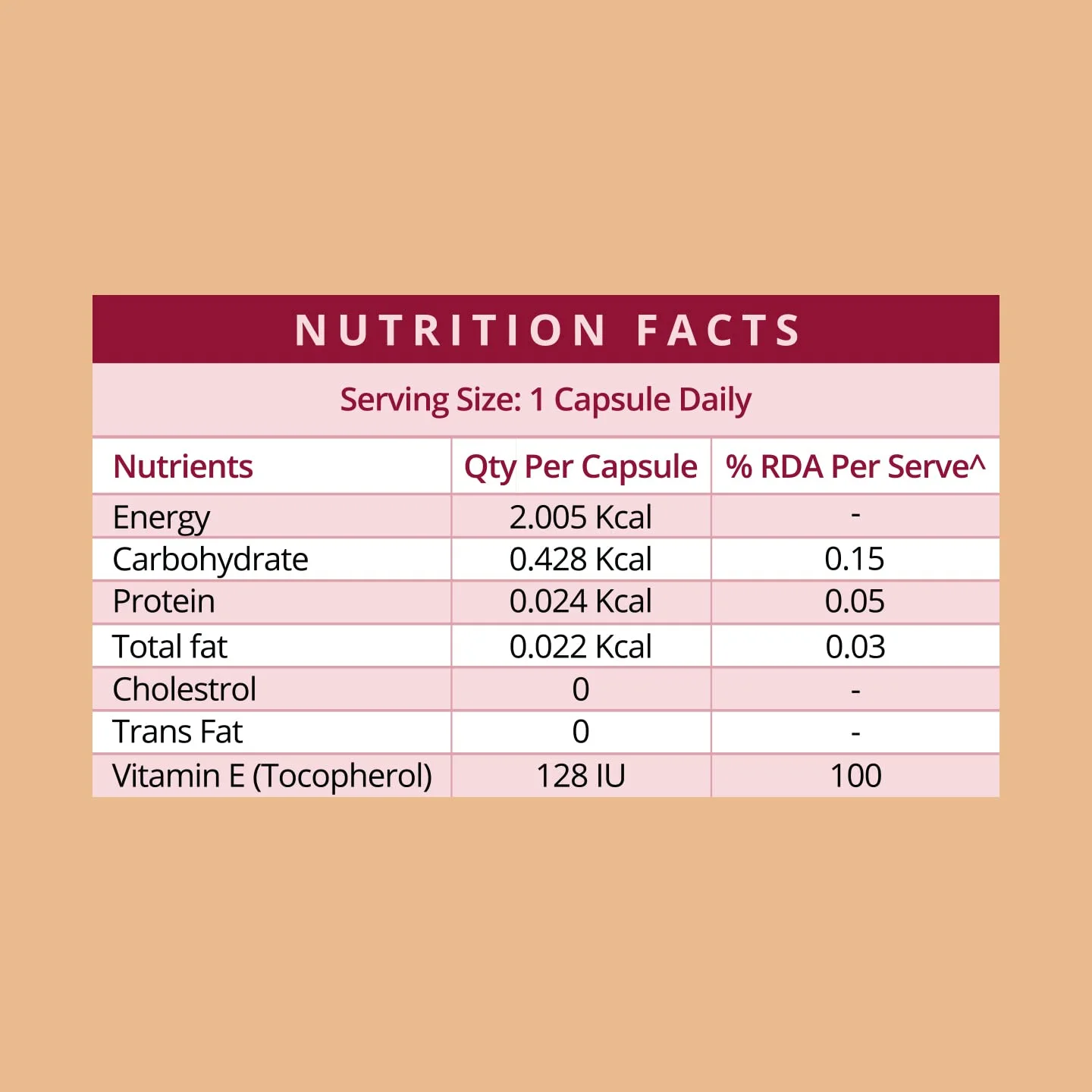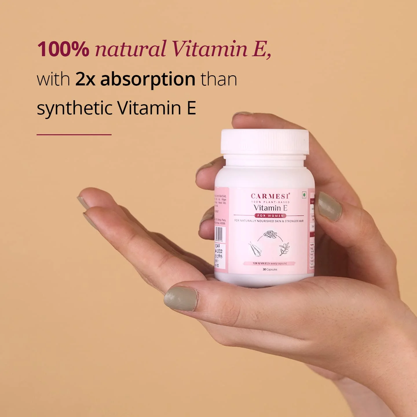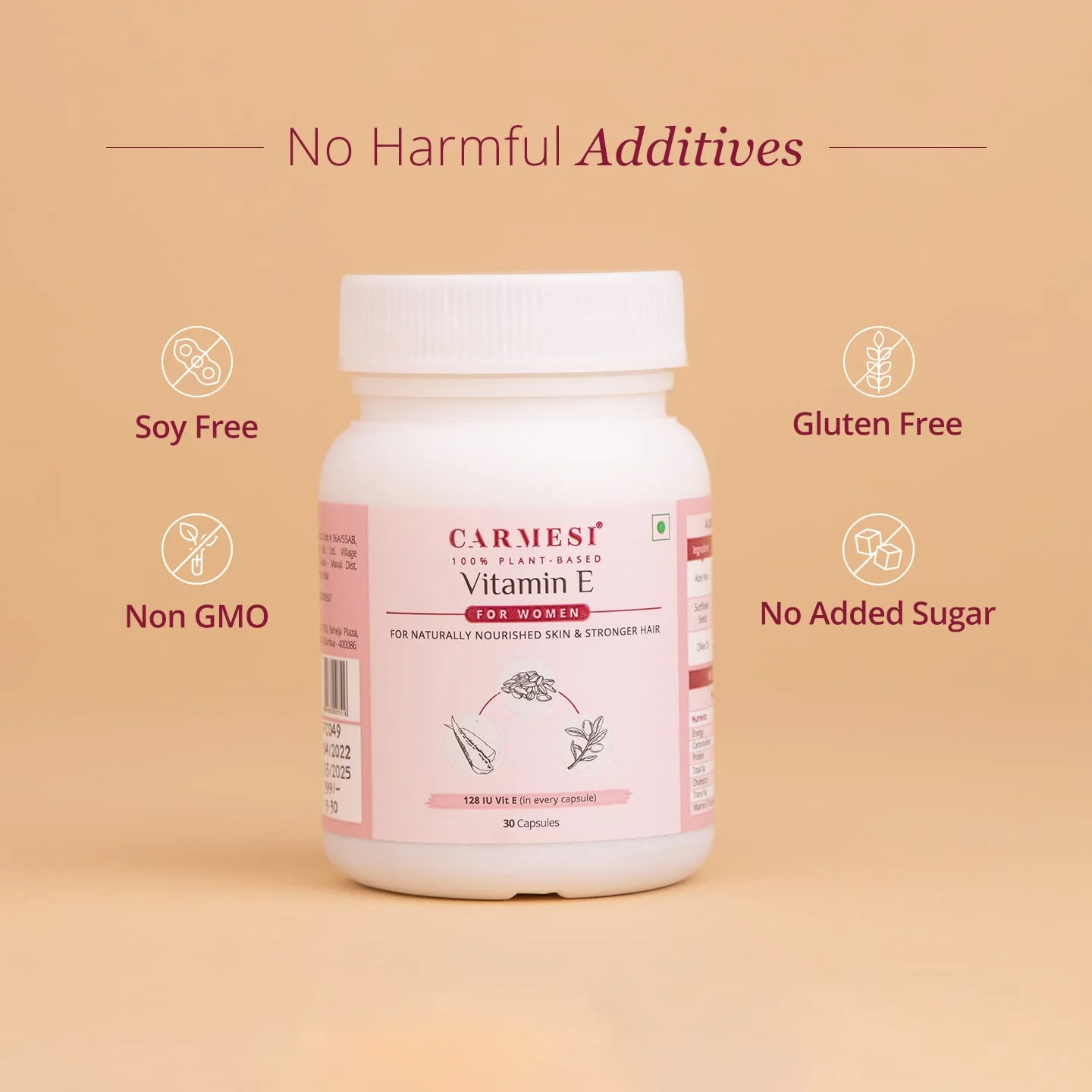 Carmesi 100% Plant-Based Vitamin E Capsules for Women | For Naturally Nourished Skin & Hair | Aloe Vera, Sunflower Seeds, Olive Oil | No Added Sugar | 30 Capsules