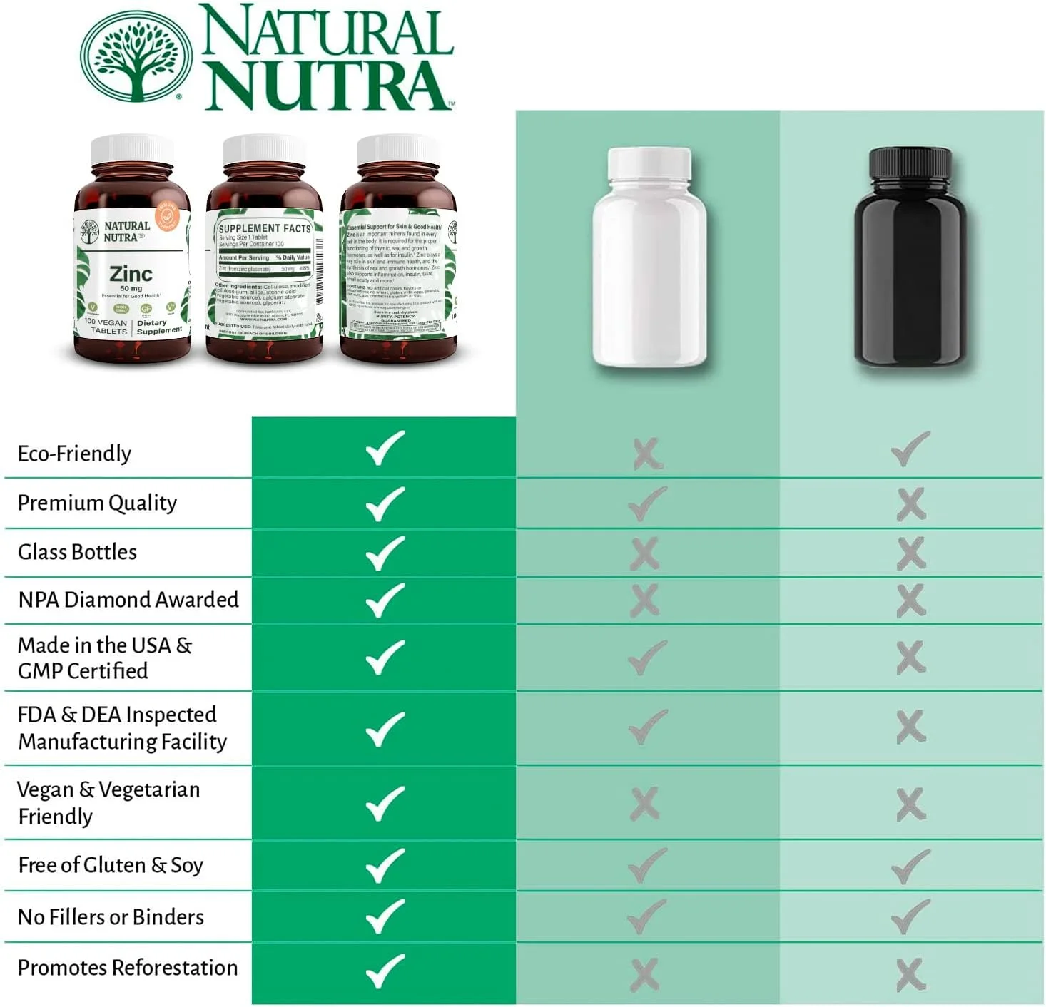 Natural Nutra Zinc Gluconate 50mg Supplement for Immune Support, Skin, Enhance Taste and Smell, Gluten Free 50mg 100 Vegan Tablets