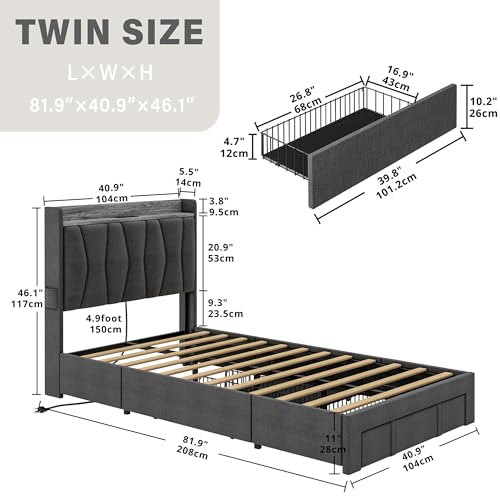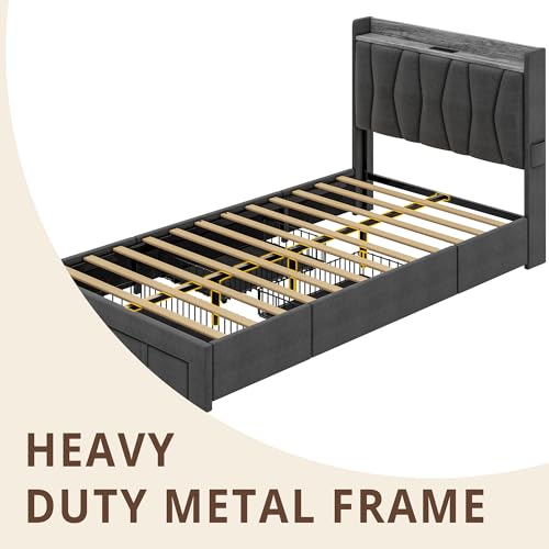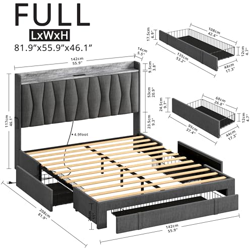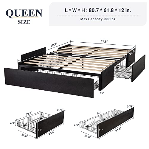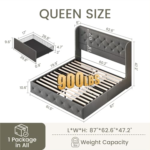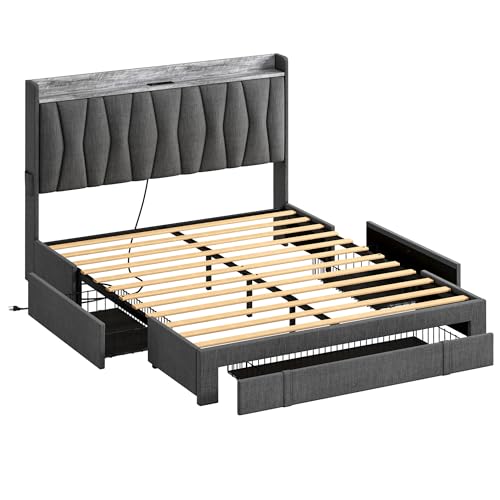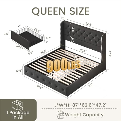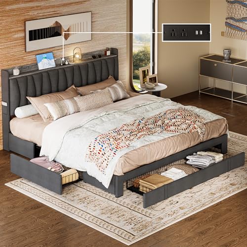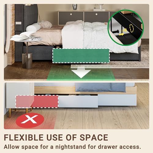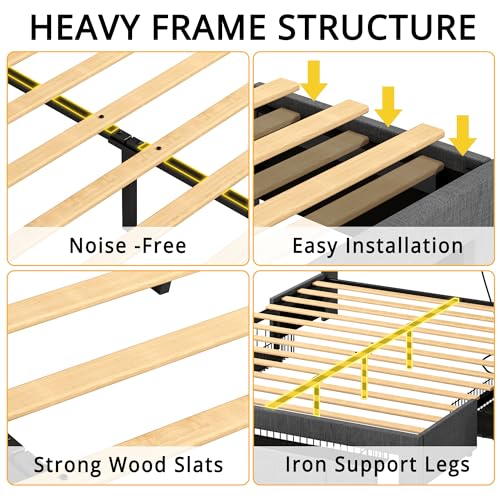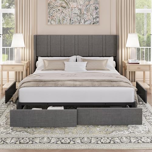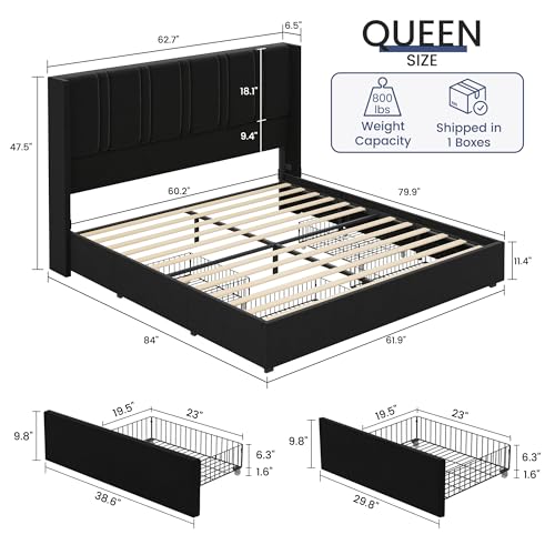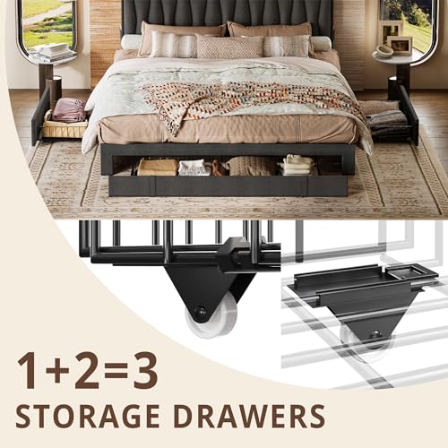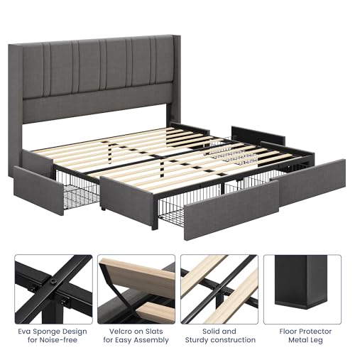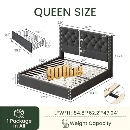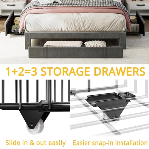 Allewie Queen Size Platform Bed Frame with 3 Storage Drawers, Fabric Upholstered, Wooden Slats Support, No Box Spring Needed, Noise Free, Easy Assembly, Dark Grey
