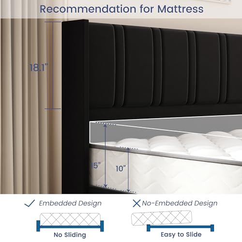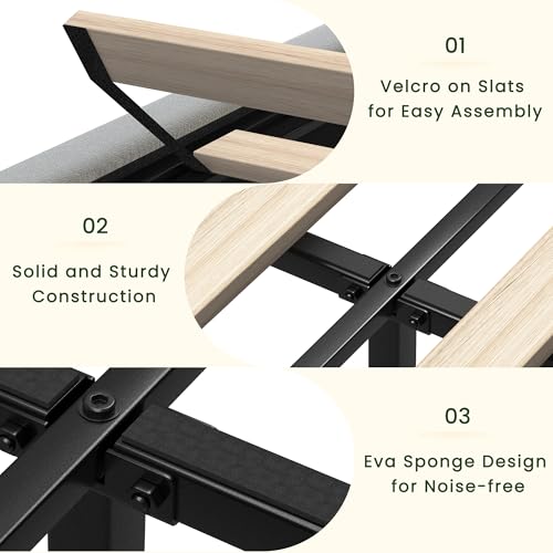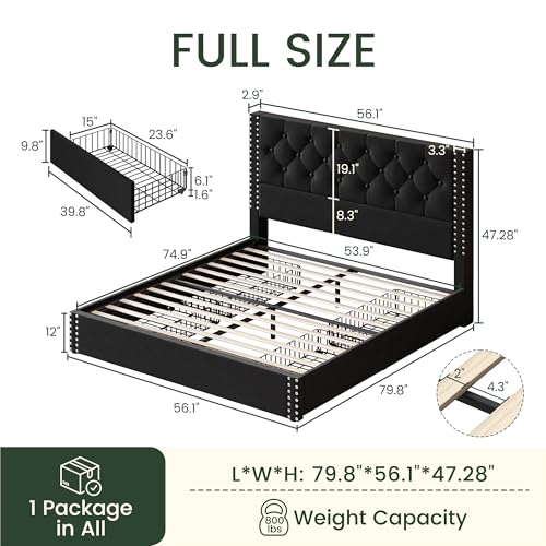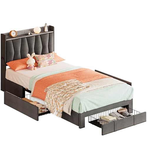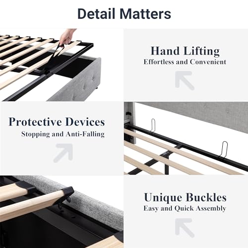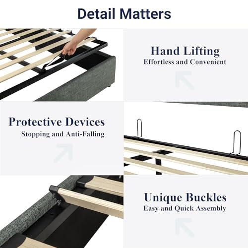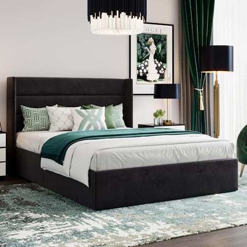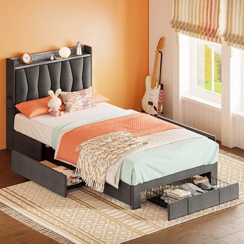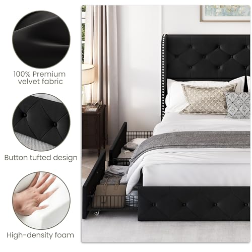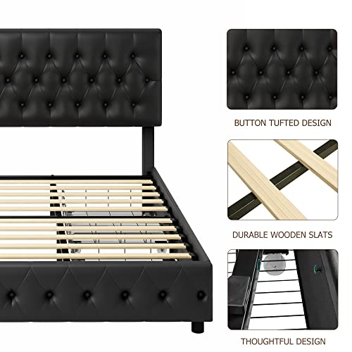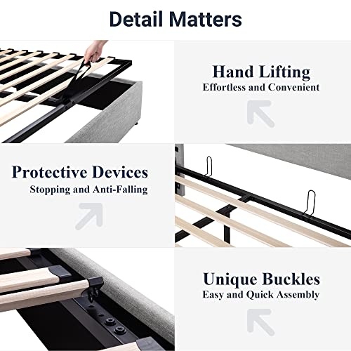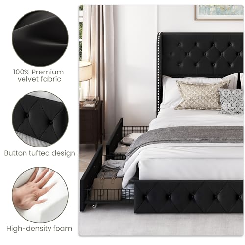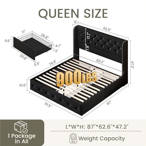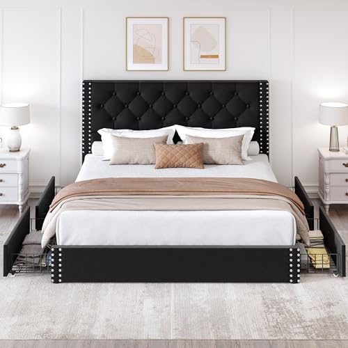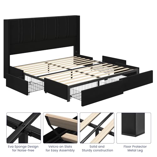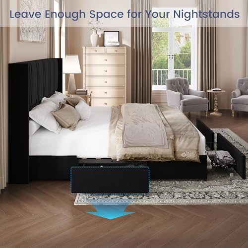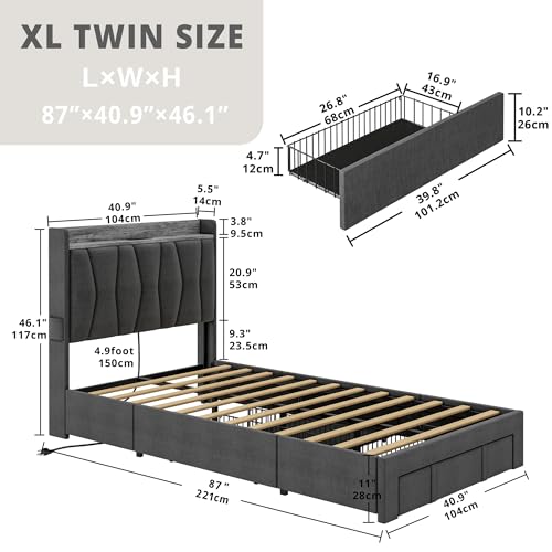 Allewie Queen Size Platform Bed Frame with 3 Storage Drawers, Fabric Upholstered, Wooden Slats Support, No Box Spring Needed, Noise Free, Easy Assembly, Dark Grey