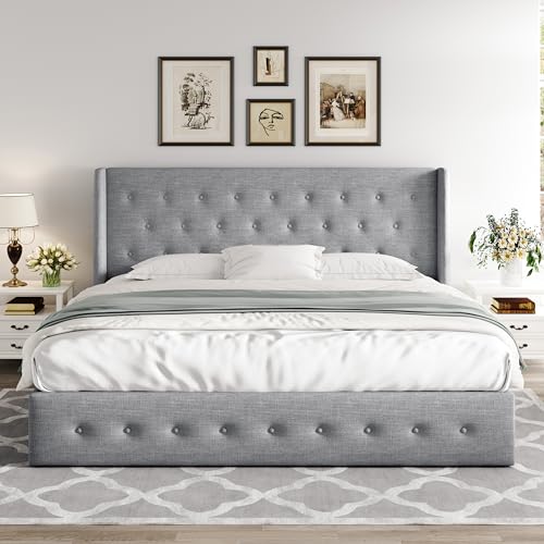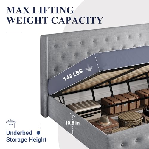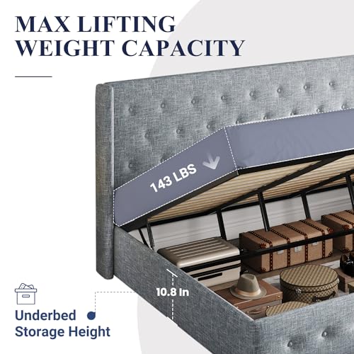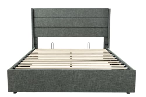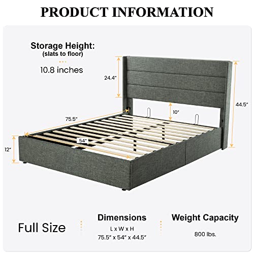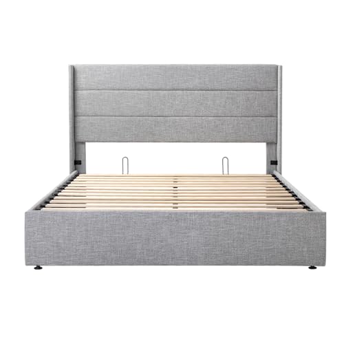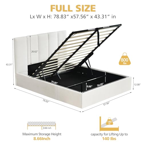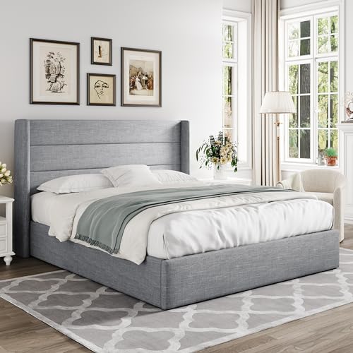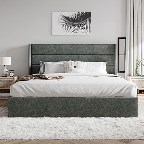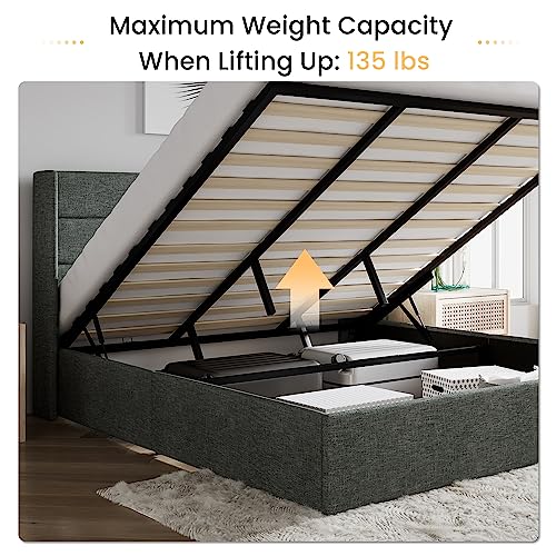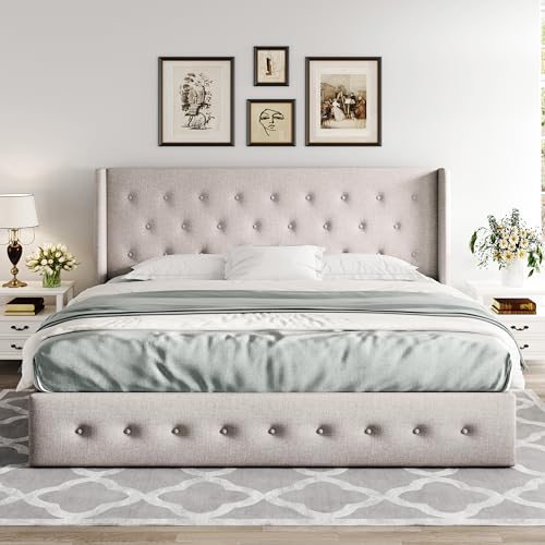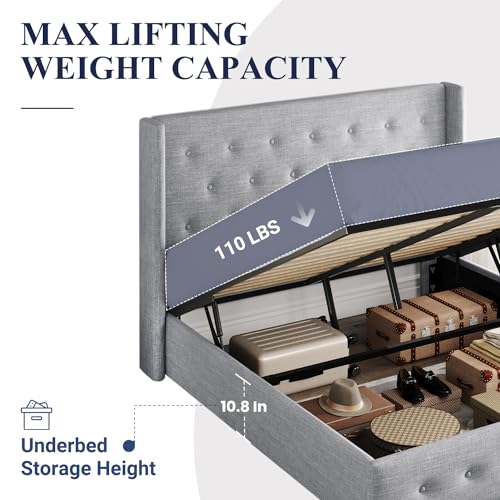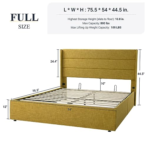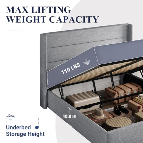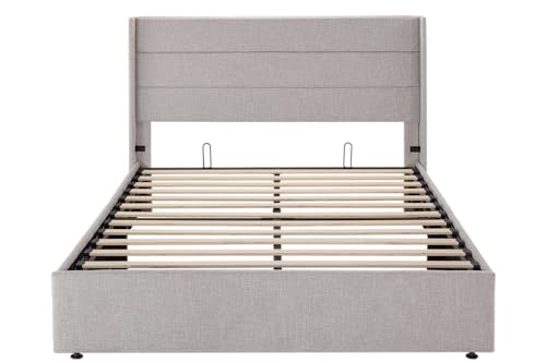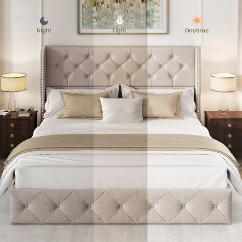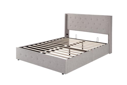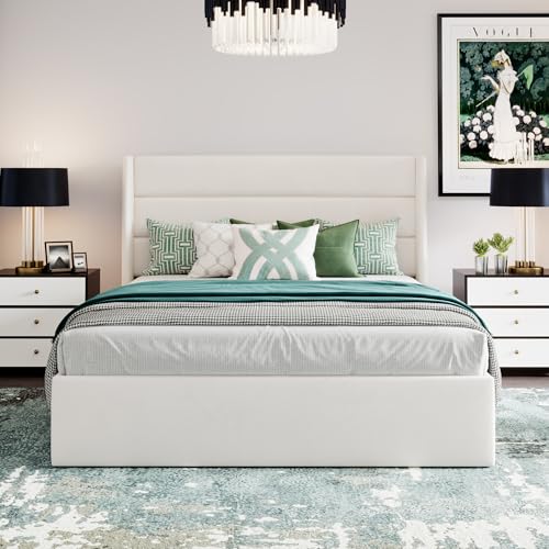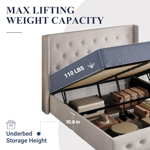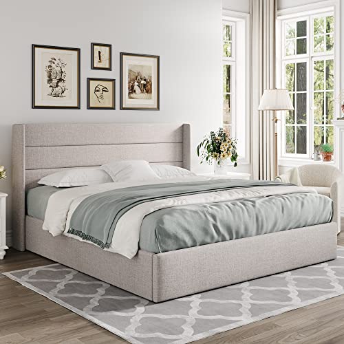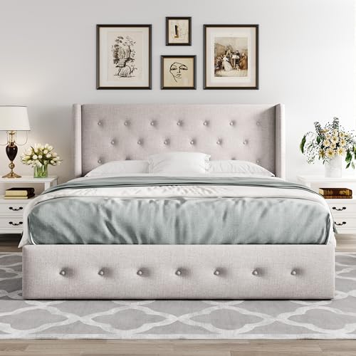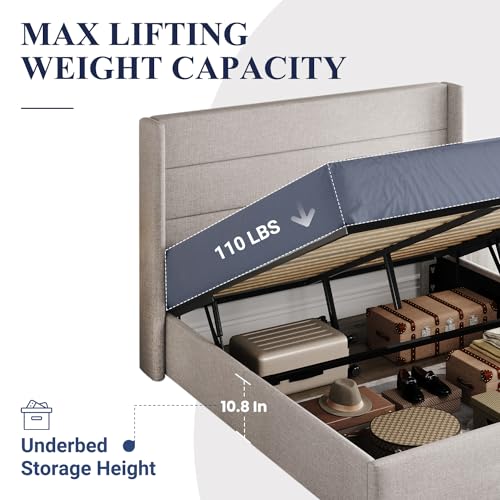 Allewie Full Size Lift Up Storage Bed, Modern Wingback Headboard, Hydraulic Support, No Box Spring Needed, Light Beige