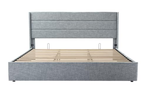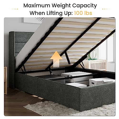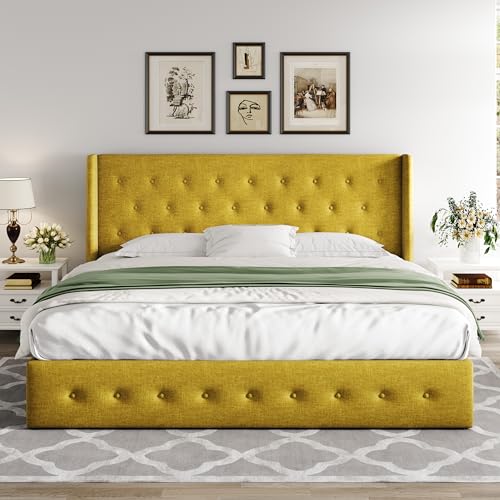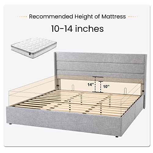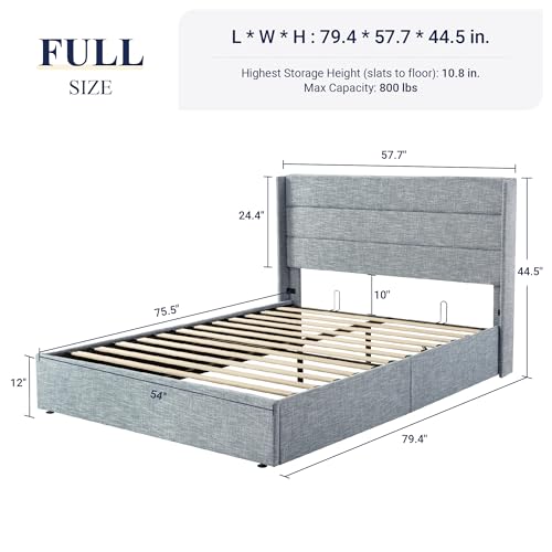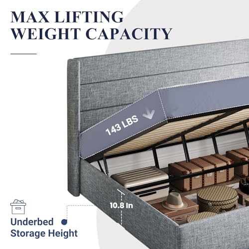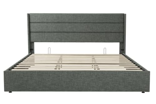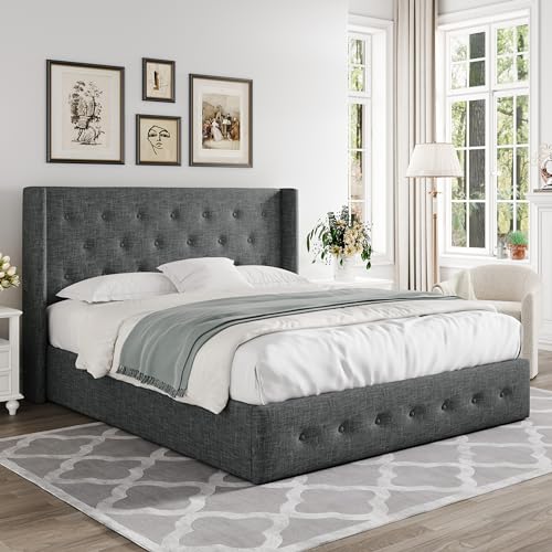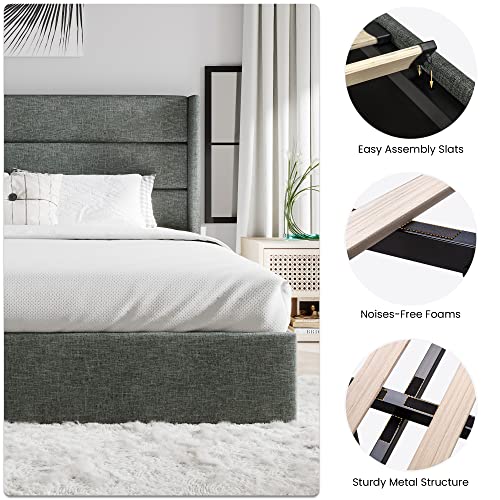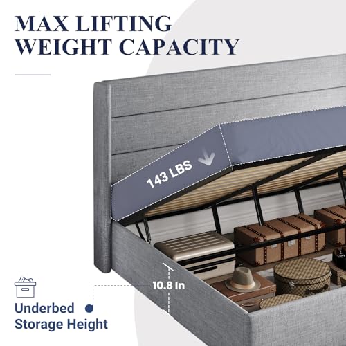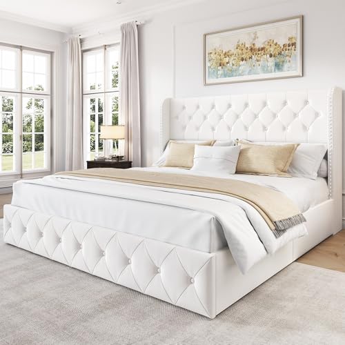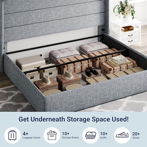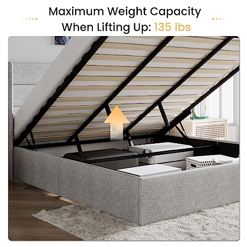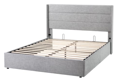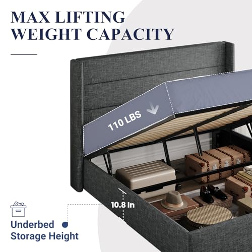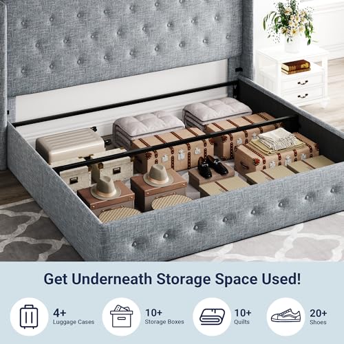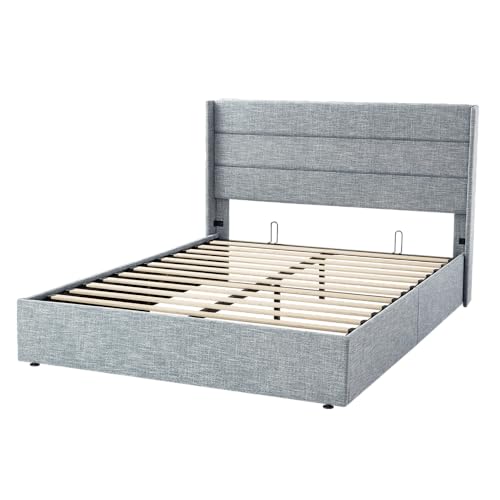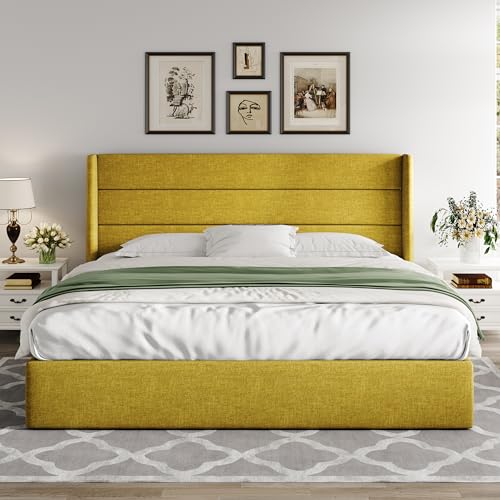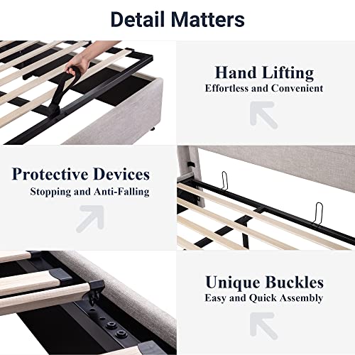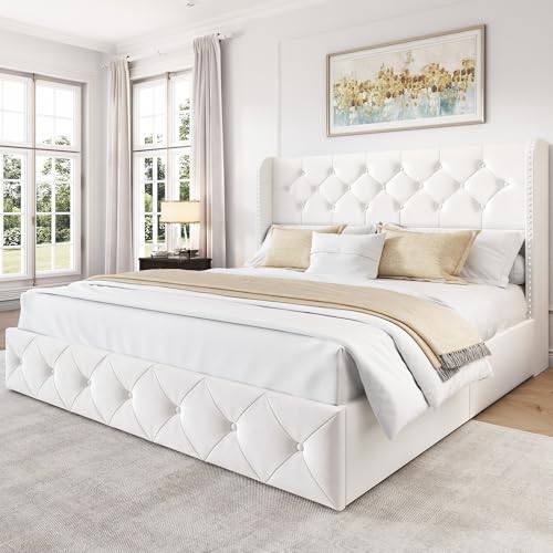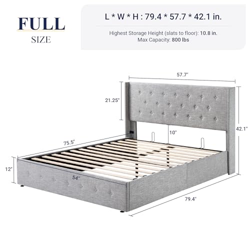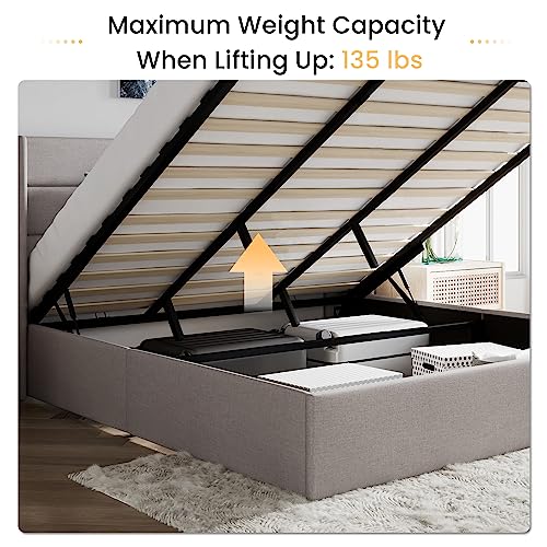 Allewie Full Size Lift Up Storage Bed, Modern Wingback Headboard, Hydraulic Support, No Box Spring Needed, Light Beige