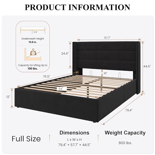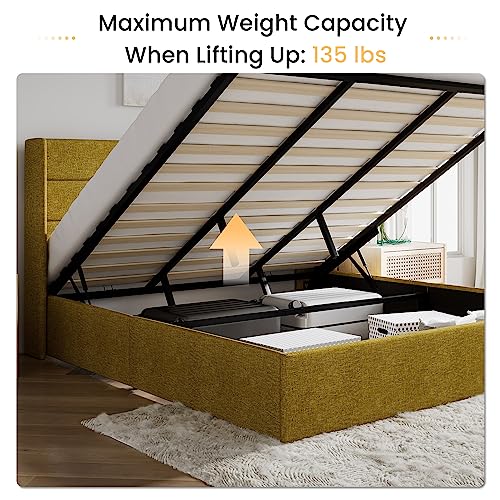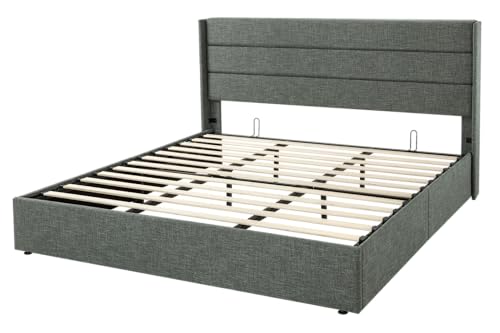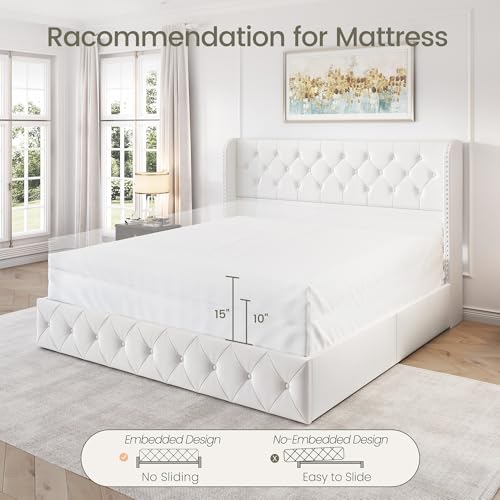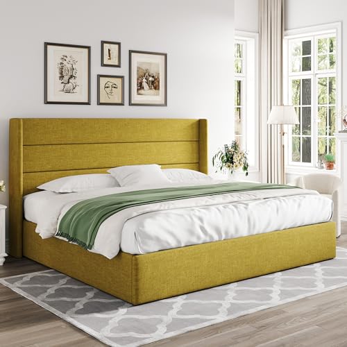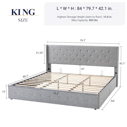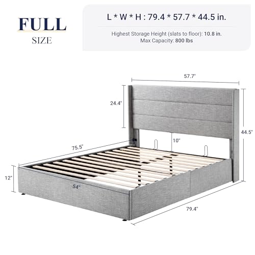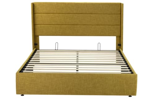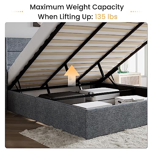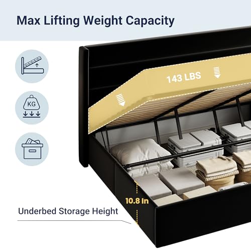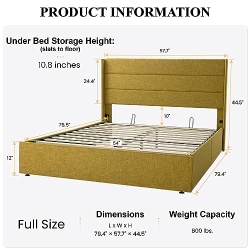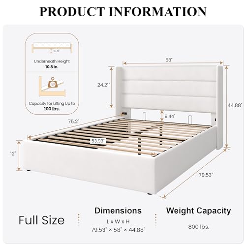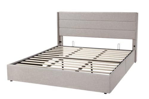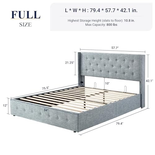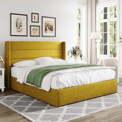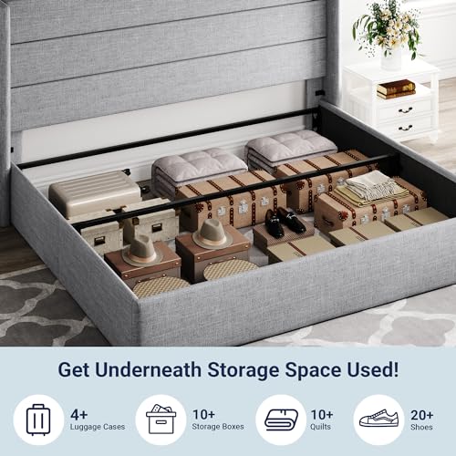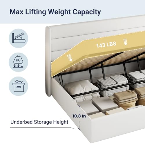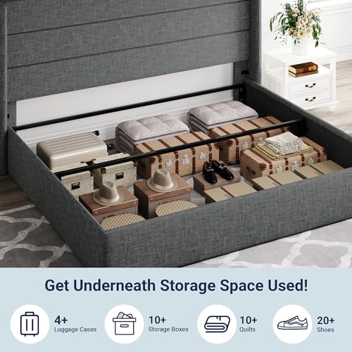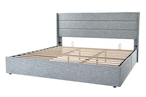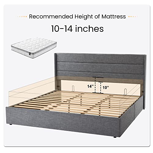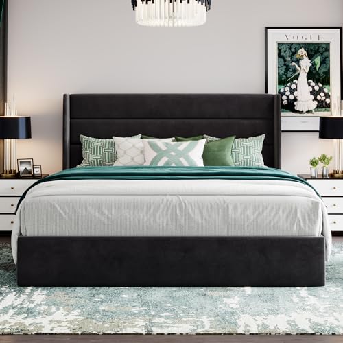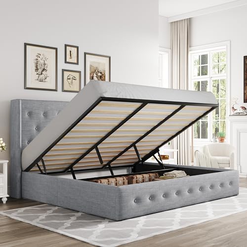 Allewie Full Size Lift Up Storage Bed, Modern Wingback Headboard, Hydraulic Support, No Box Spring Needed, Light Beige