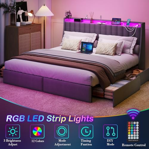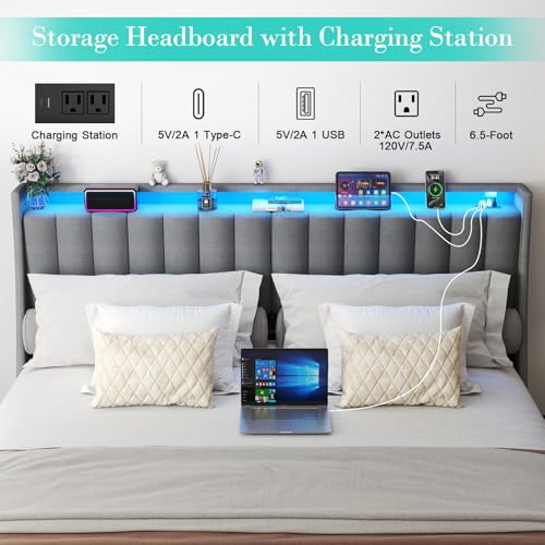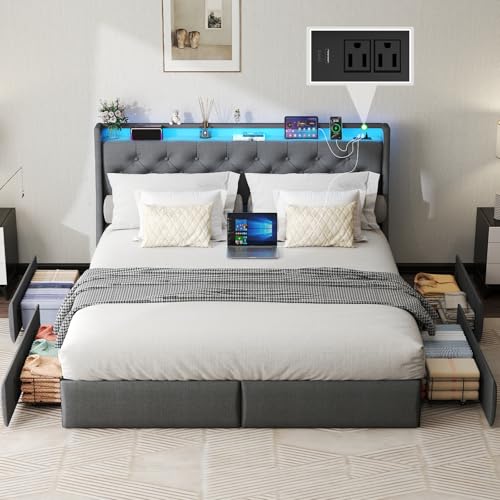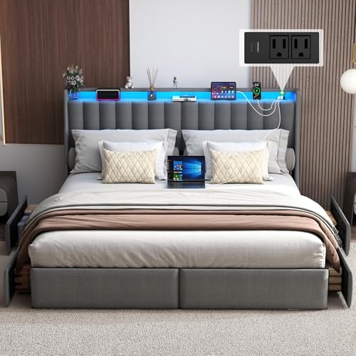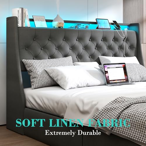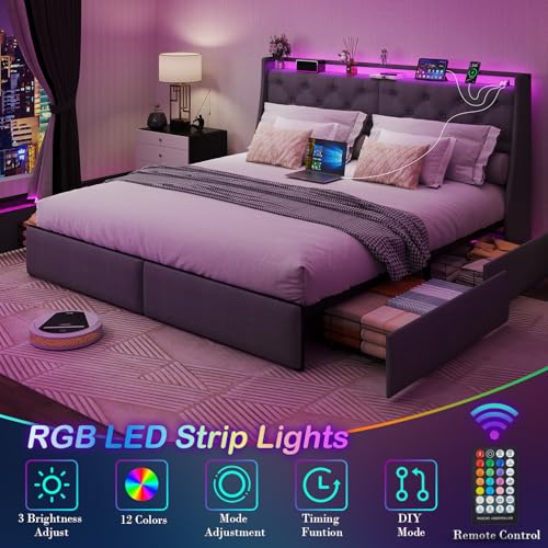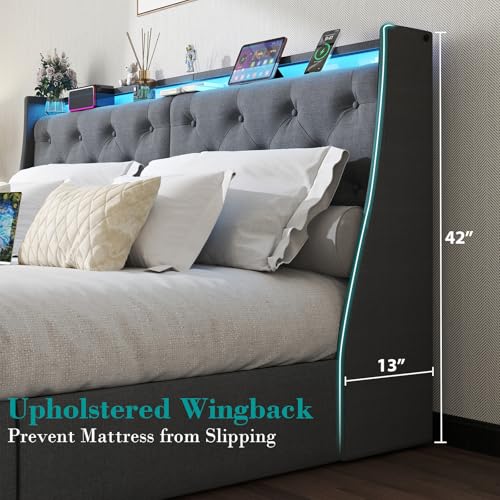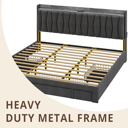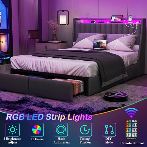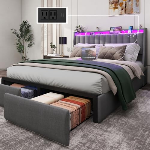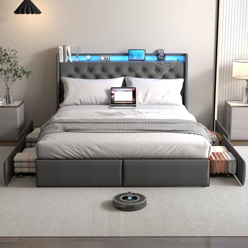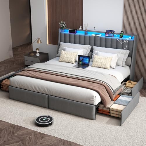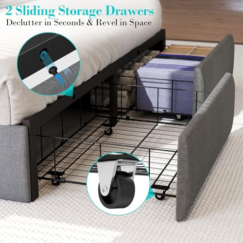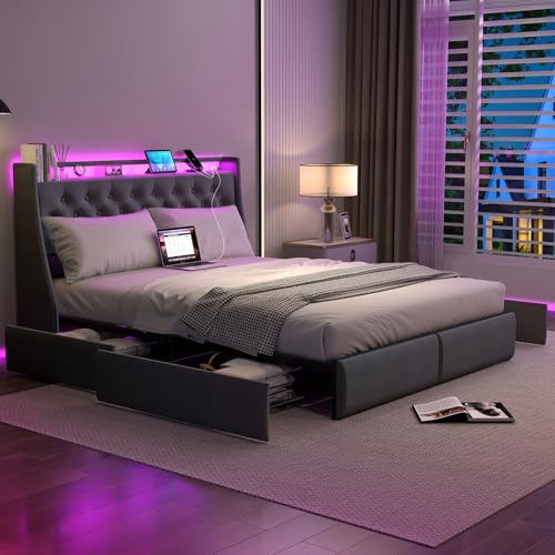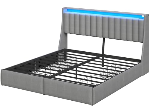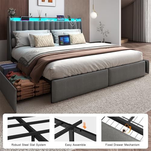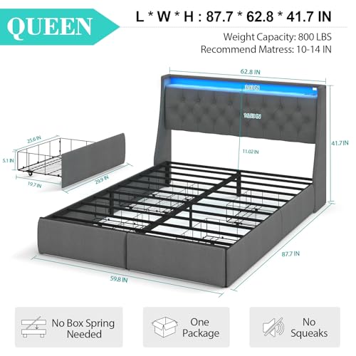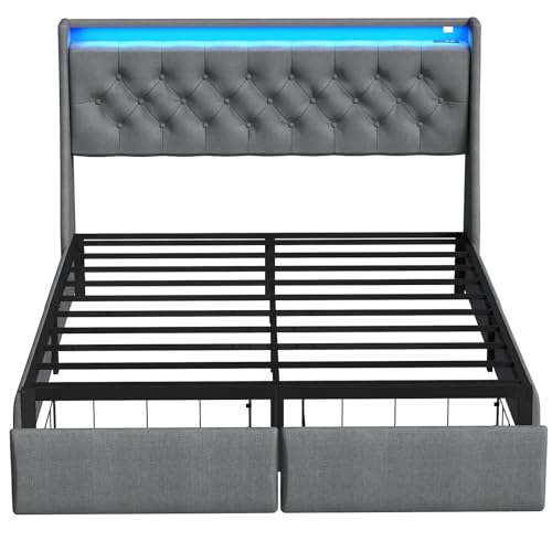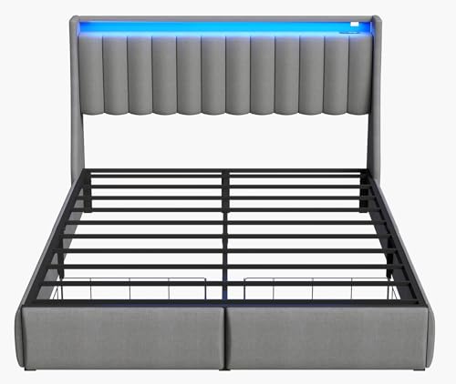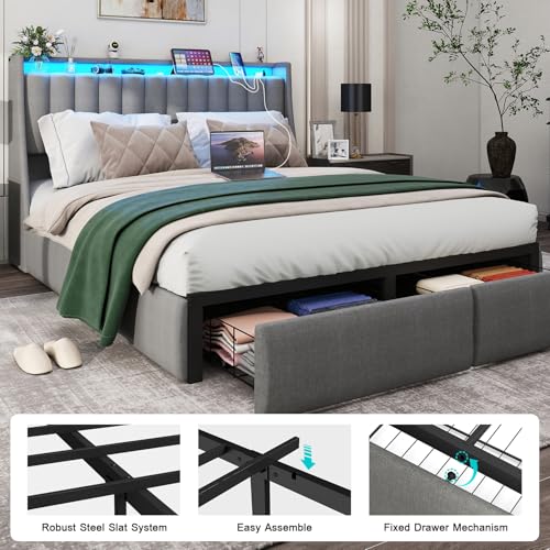 Queen Bed Frame with 2 Storage Drawers, Platform Bed Frame Queen Size with LED Light, Upholstered Headboard, Charging Station, Steel Slat Support, No Box Spring Needed, Noise-Free, Easy Assembly, Gray