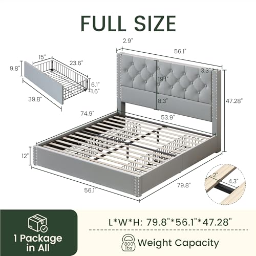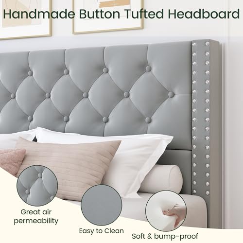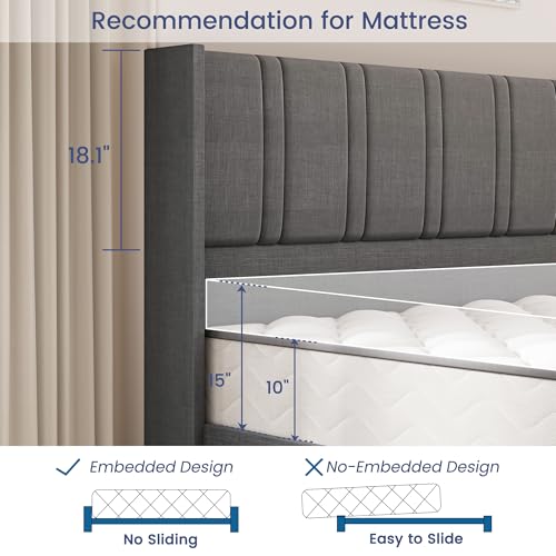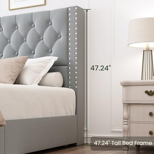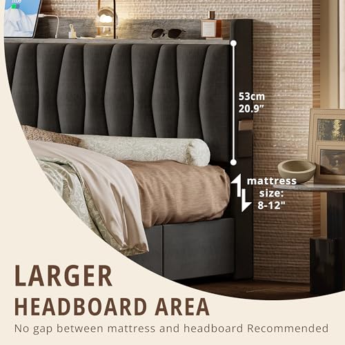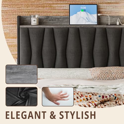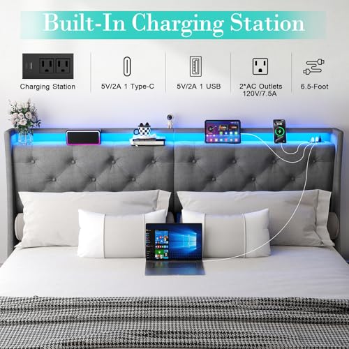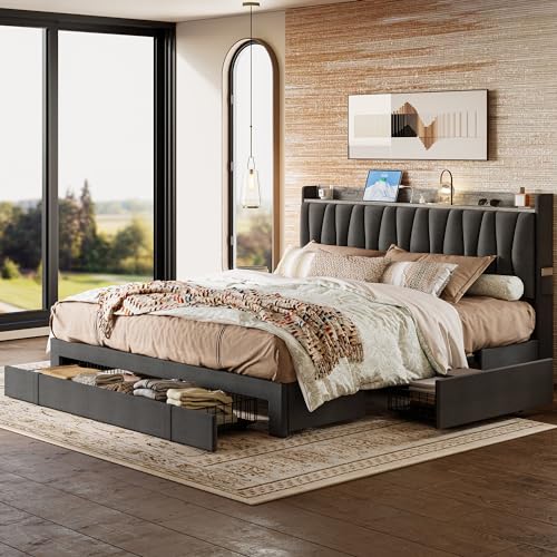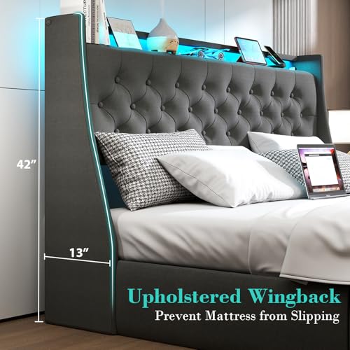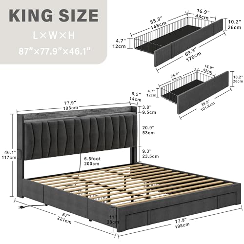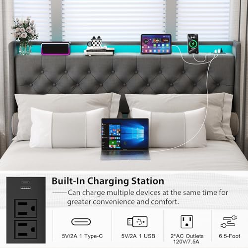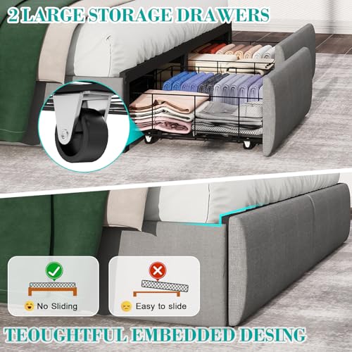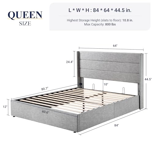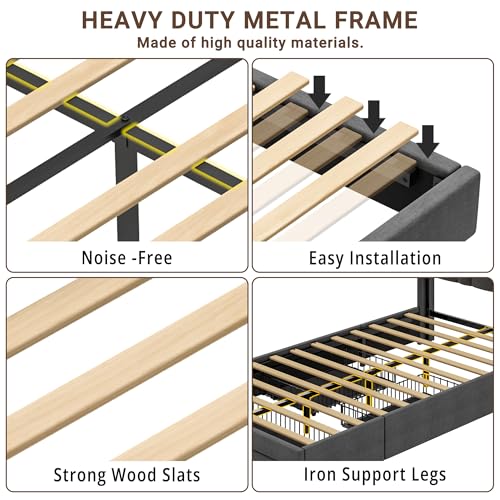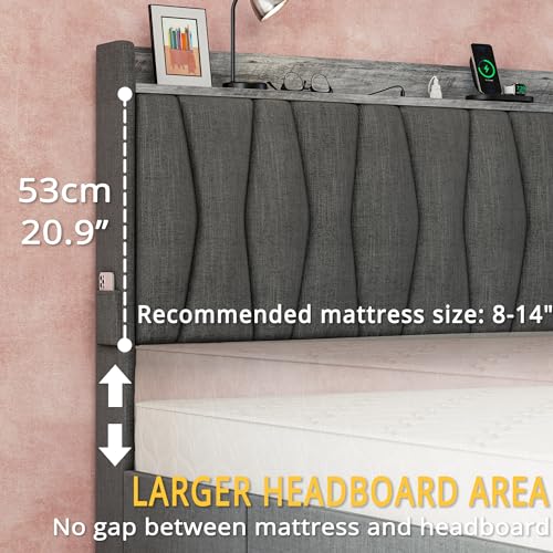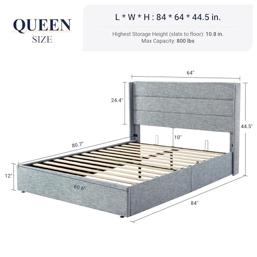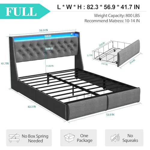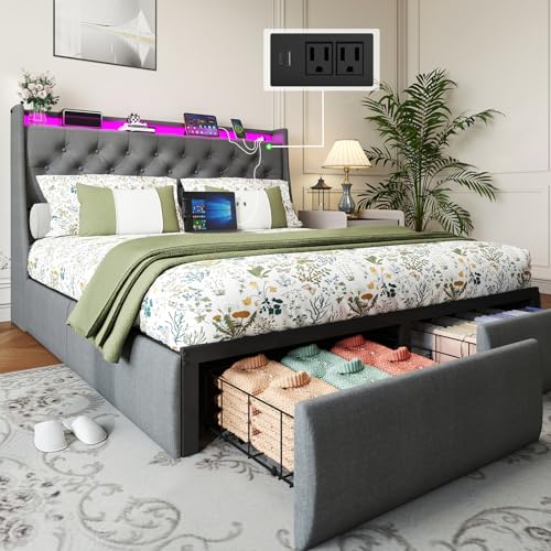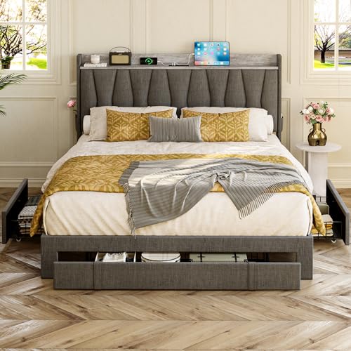 Queen Bed Frame with 2 Storage Drawers, Platform Bed Frame Queen Size with LED Light, Upholstered Headboard, Charging Station, Steel Slat Support, No Box Spring Needed, Noise-Free, Easy Assembly, Gray