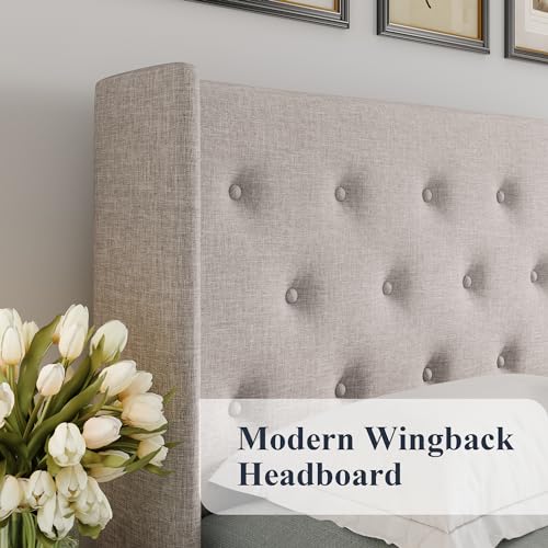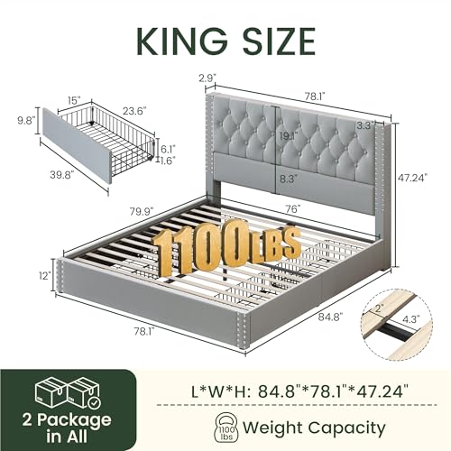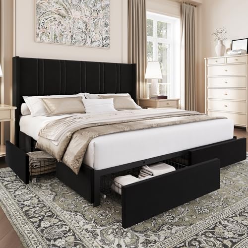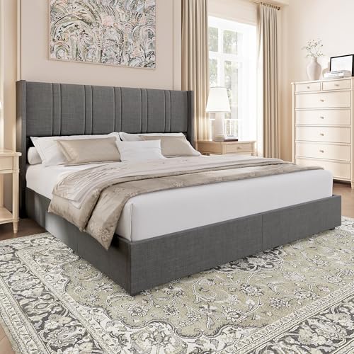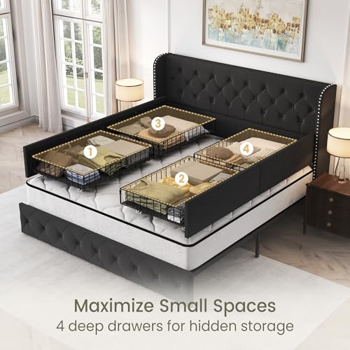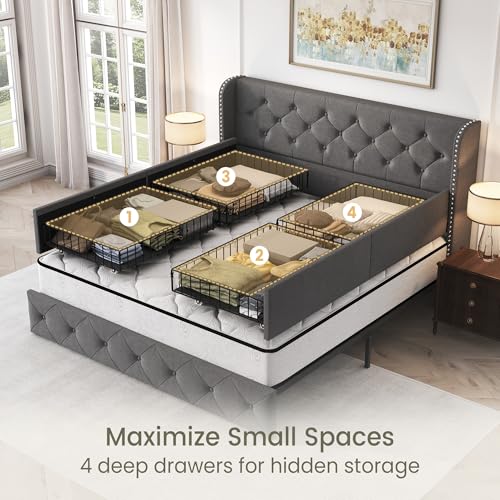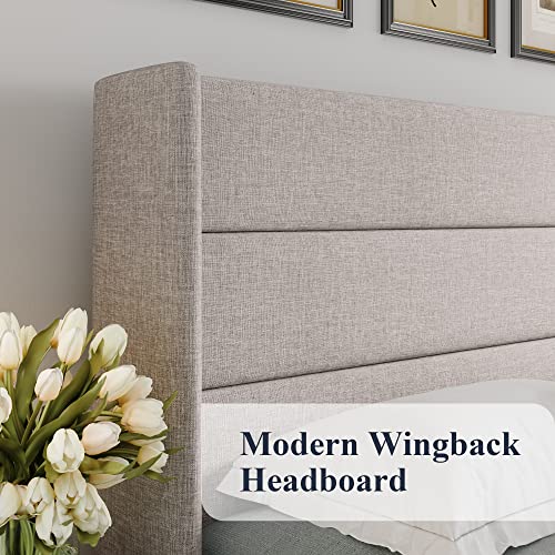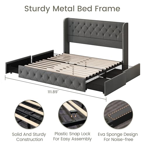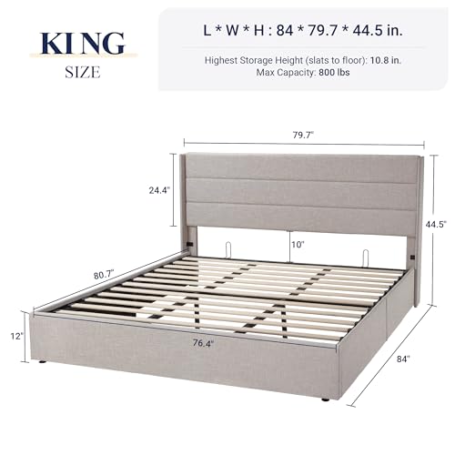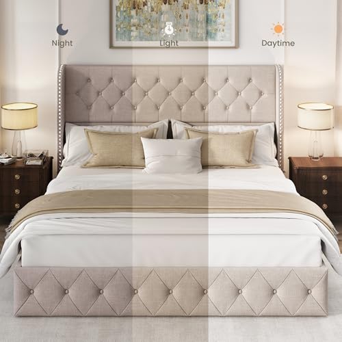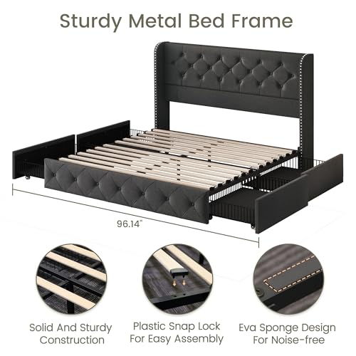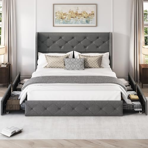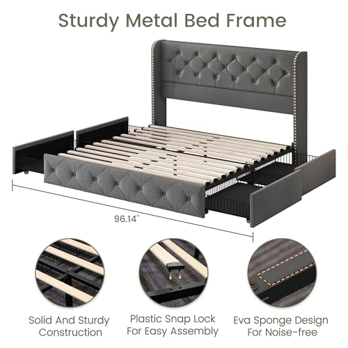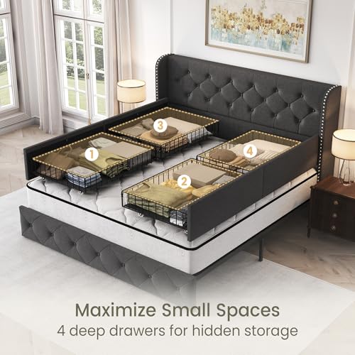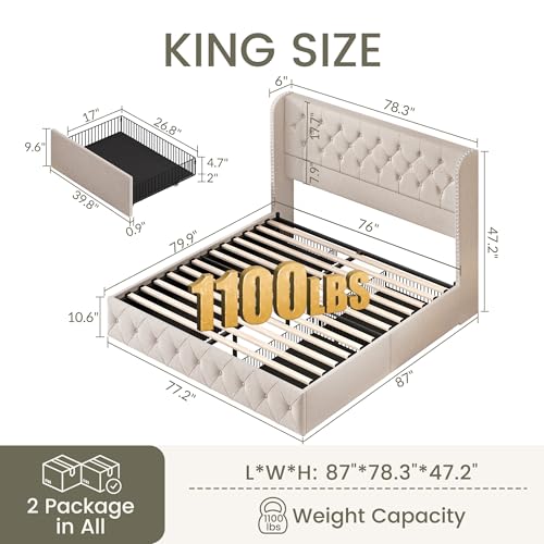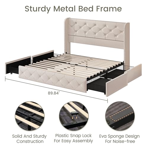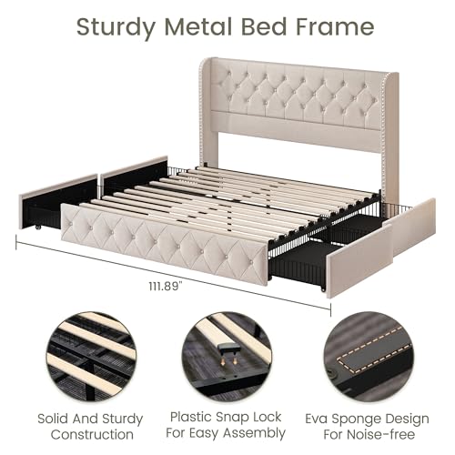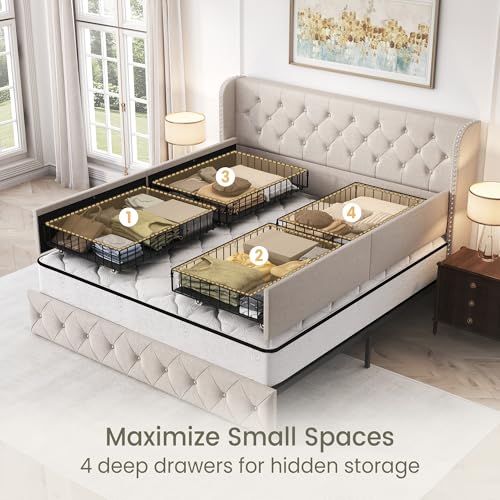 King Size Bed Frame with 4 Storage Drawers and Tufted Headboard Linen Upholstered Platform Bed Frame Wingback Beds with Wooden Slats Support, Easy Assembly, Beige