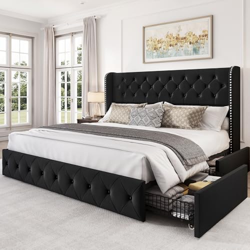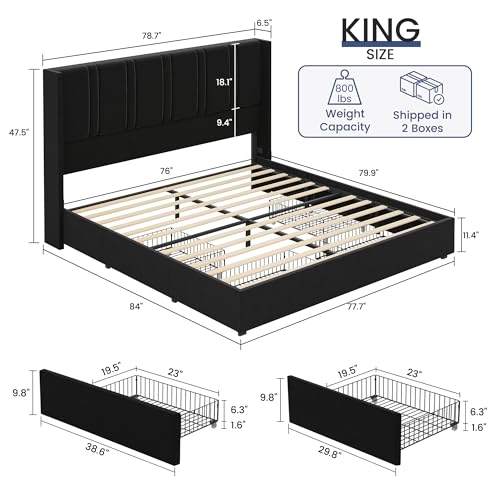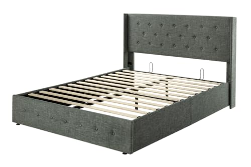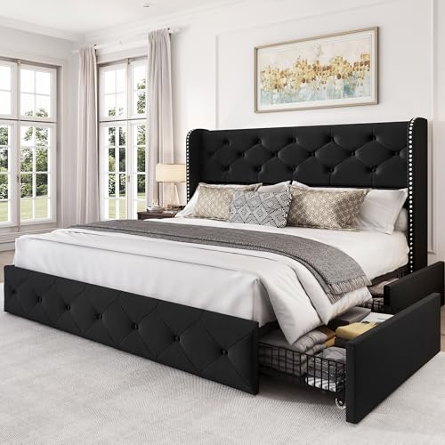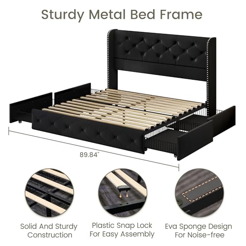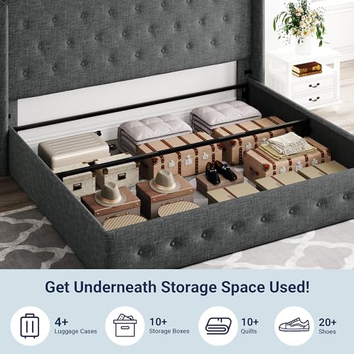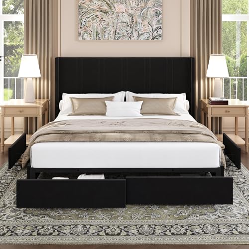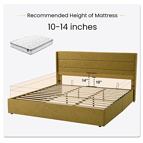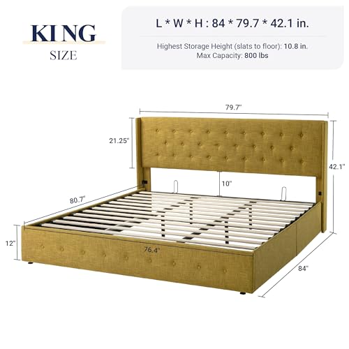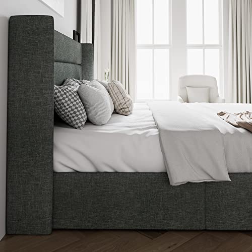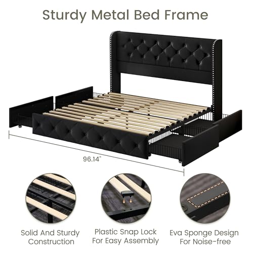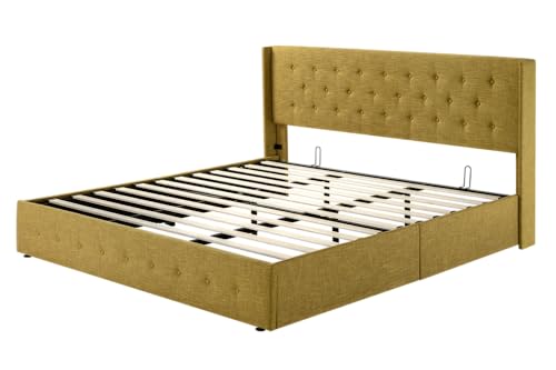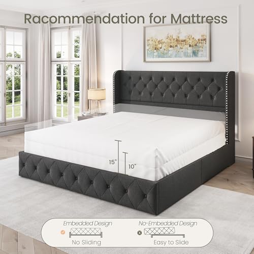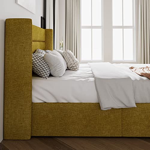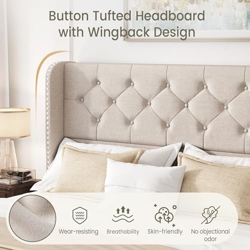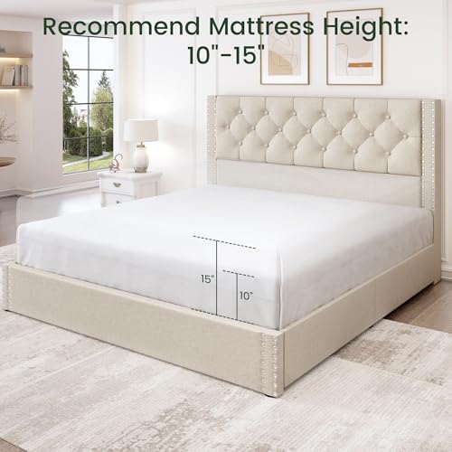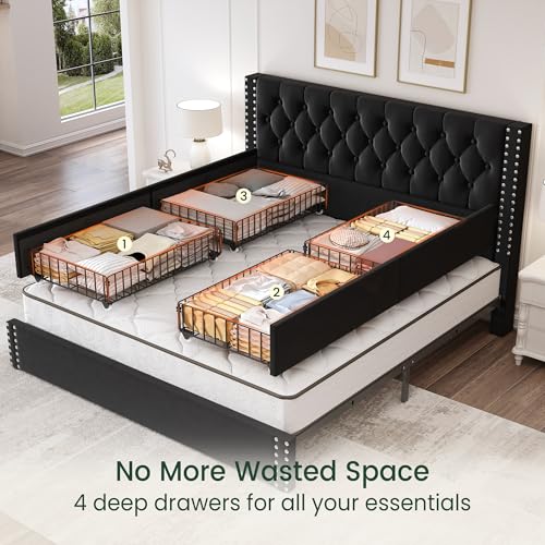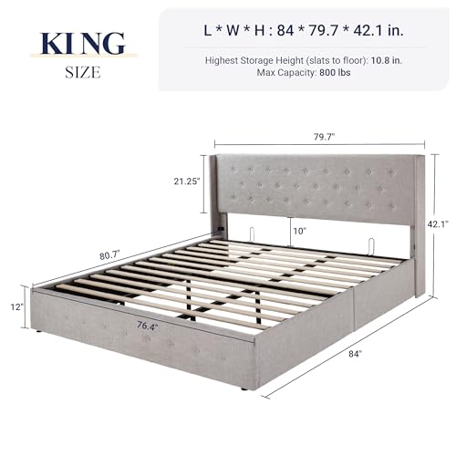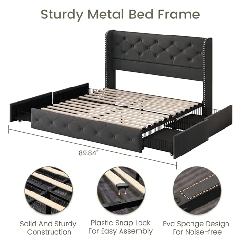 King Size Bed Frame with 4 Storage Drawers and Tufted Headboard Linen Upholstered Platform Bed Frame Wingback Beds with Wooden Slats Support, Easy Assembly, Beige