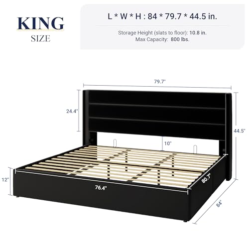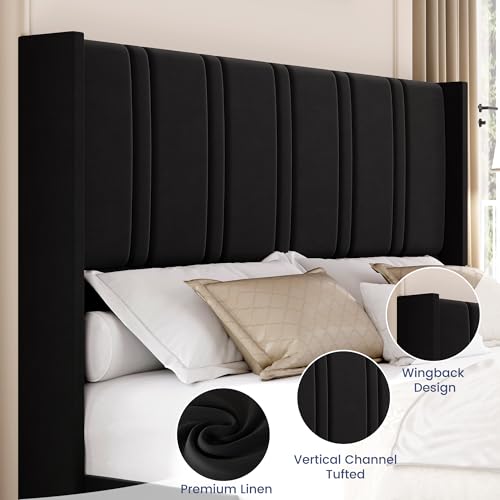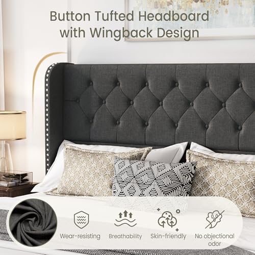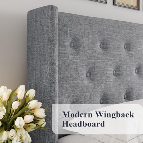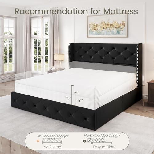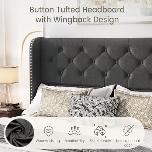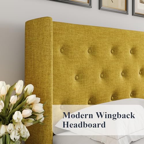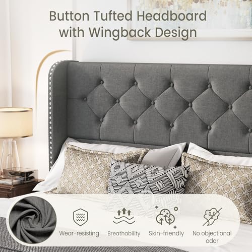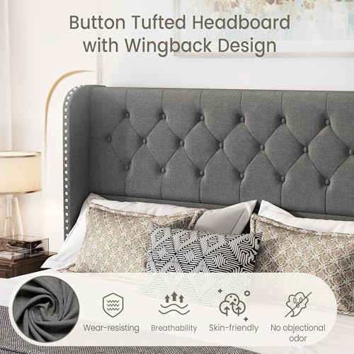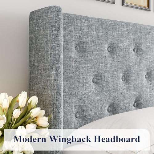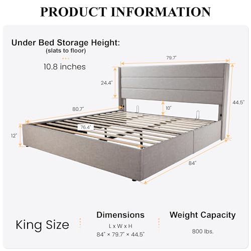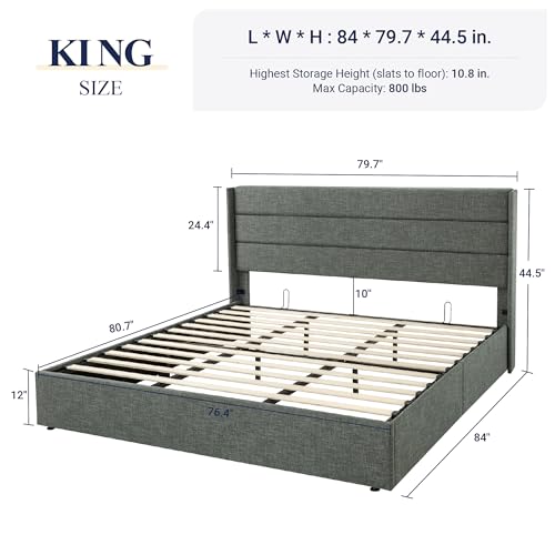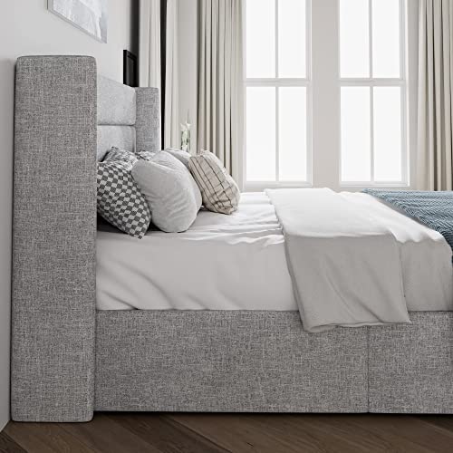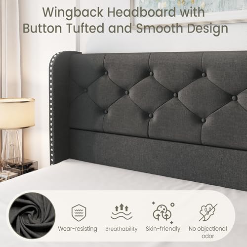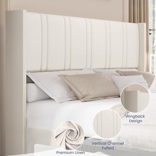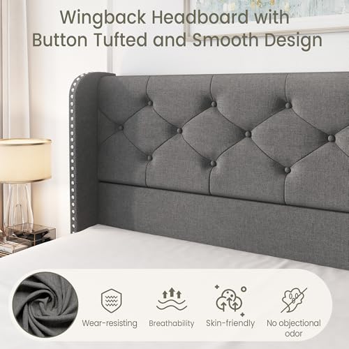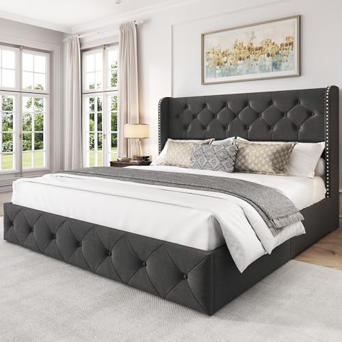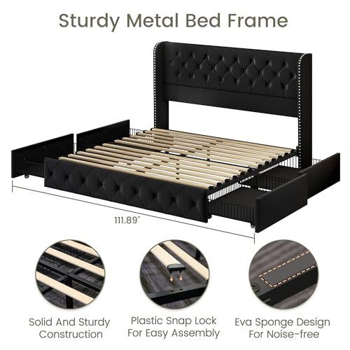 King Size Bed Frame with 4 Storage Drawers and Tufted Headboard Linen Upholstered Platform Bed Frame Wingback Beds with Wooden Slats Support, Easy Assembly, Beige