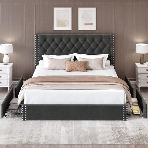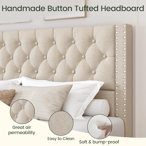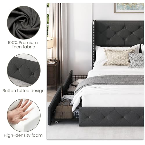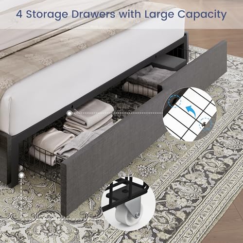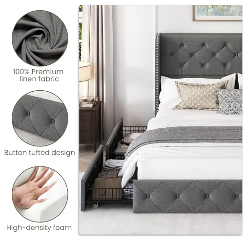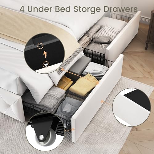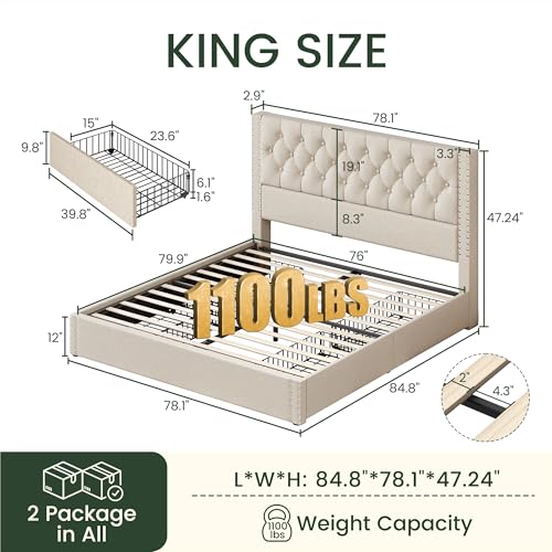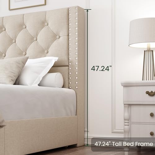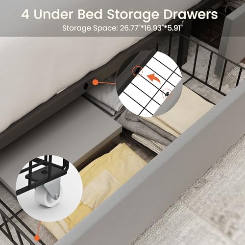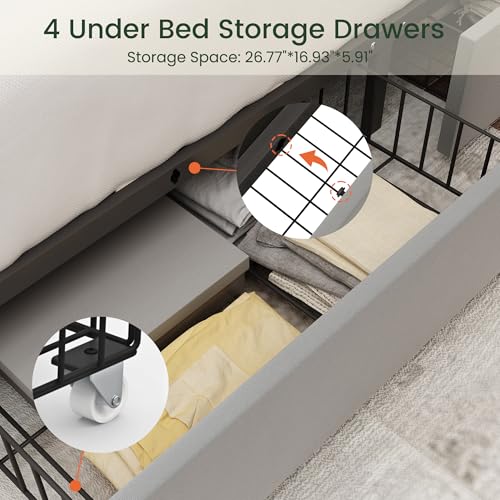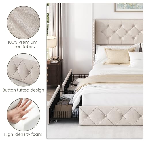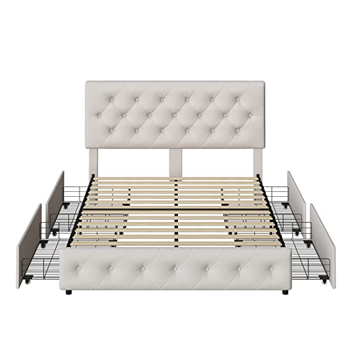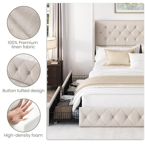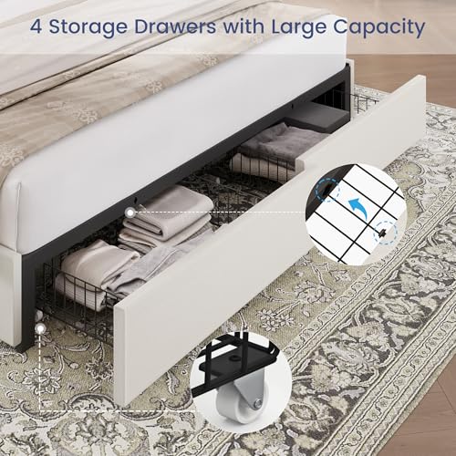 King Size Bed Frame with 4 Storage Drawers and Tufted Headboard Linen Upholstered Platform Bed Frame with Heavy Duty Wood Slats, No Box Spring Needed, Easy Assembly, Beige