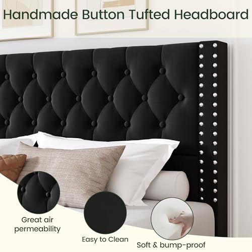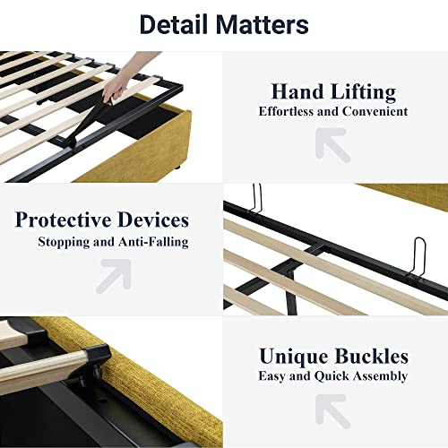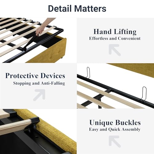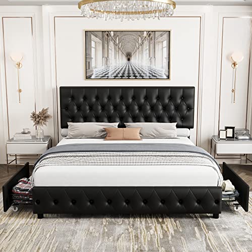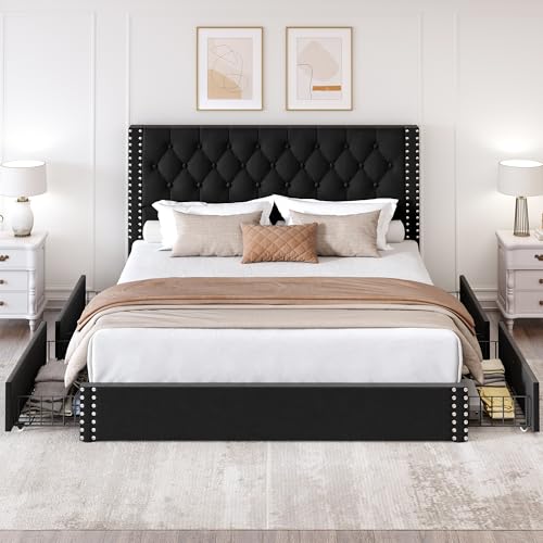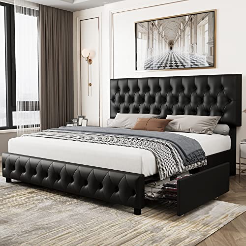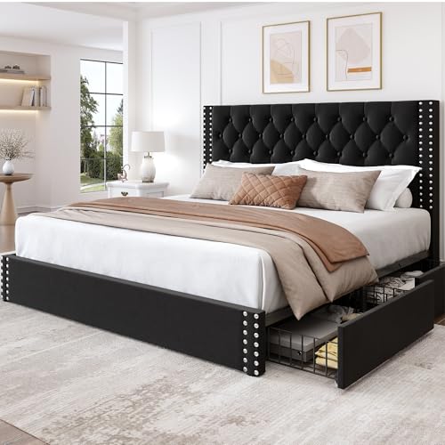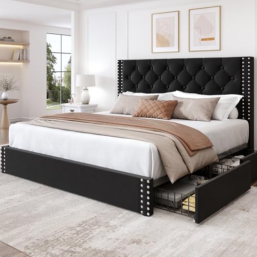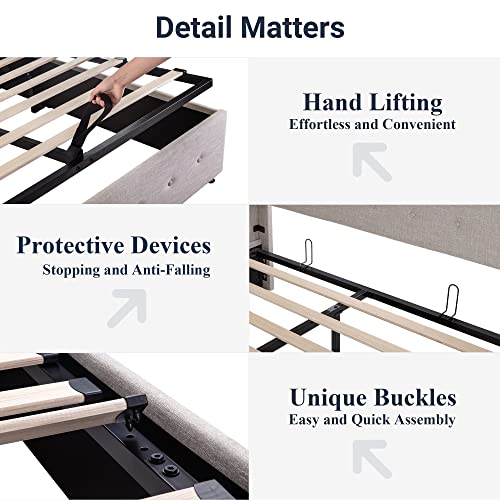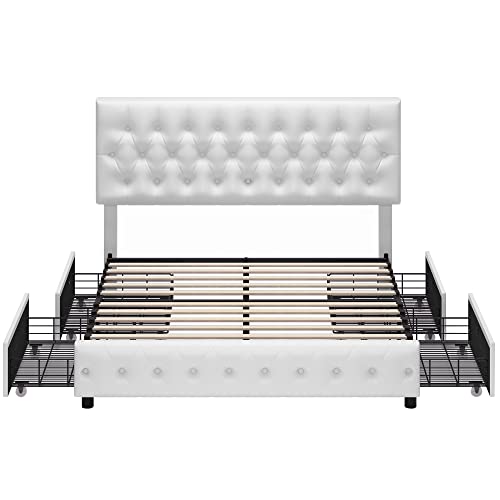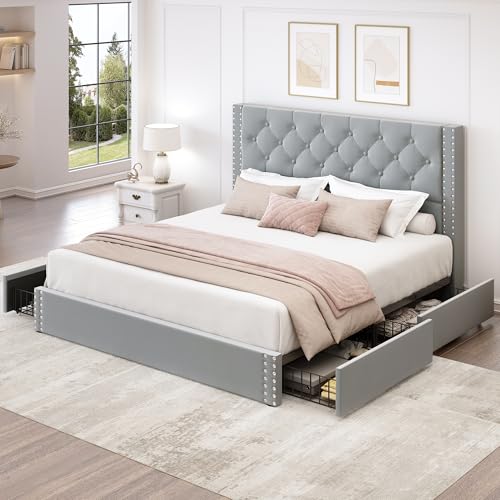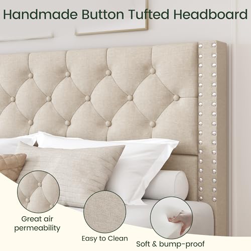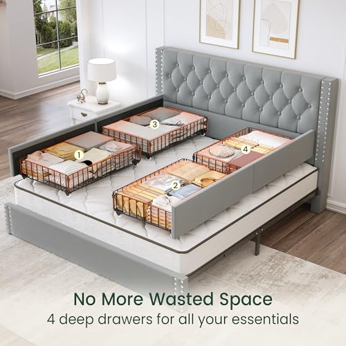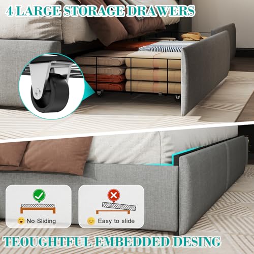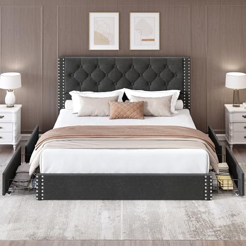 King Size Bed Frame with 4 Storage Drawers and Tufted Headboard Linen Upholstered Platform Bed Frame with Heavy Duty Wood Slats, No Box Spring Needed, Easy Assembly, Beige