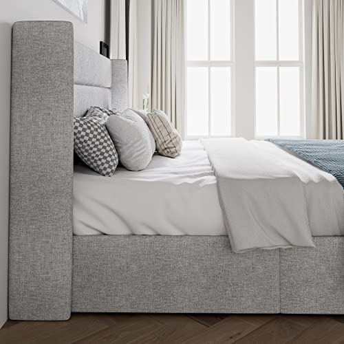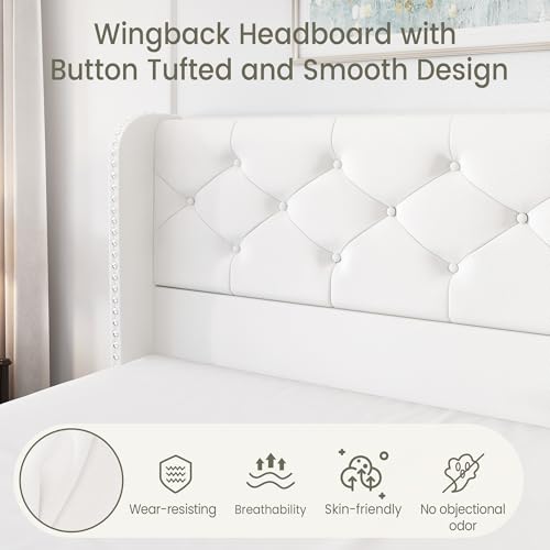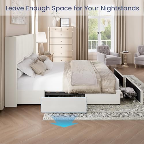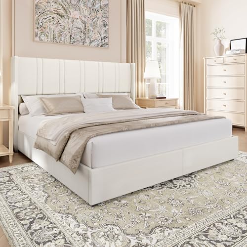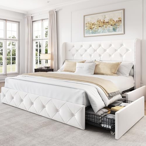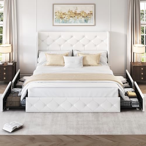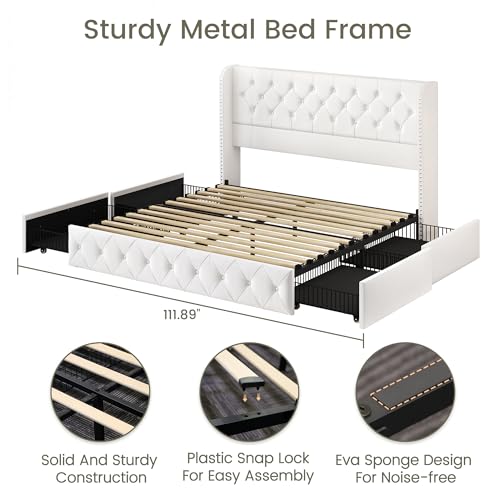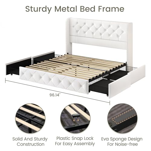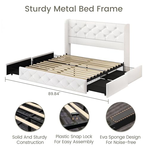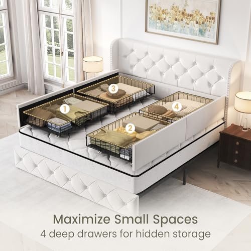 King Size Bed Frame with 4 Storage Drawers Linen Upholstered Platform Bed with Wingback Headboard, No Box Spring Needed, Easy Assembly, White