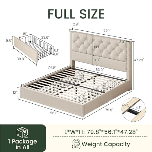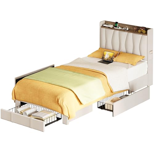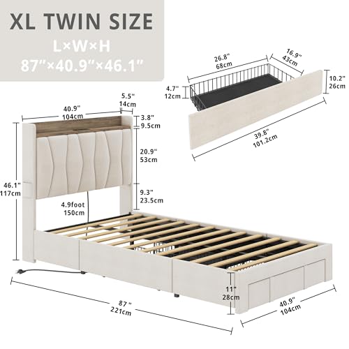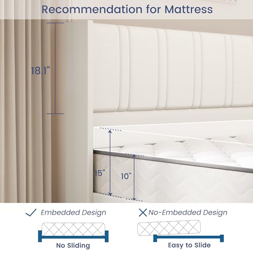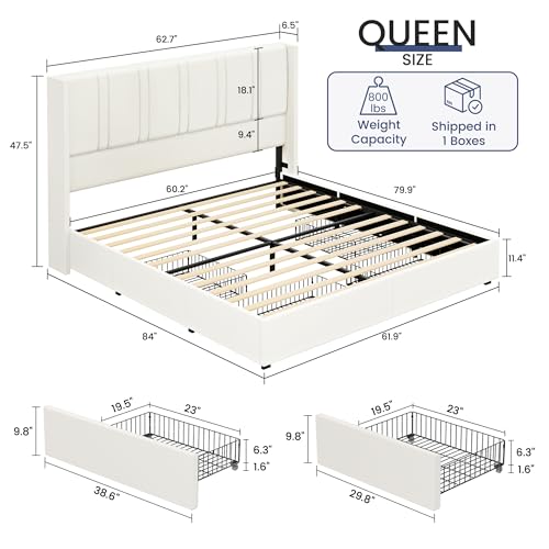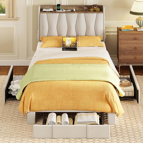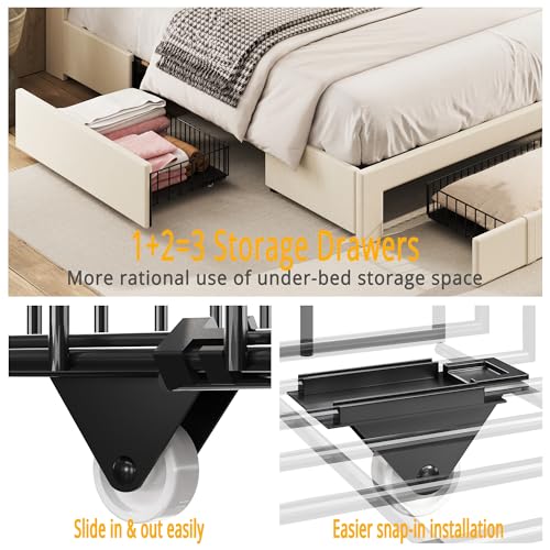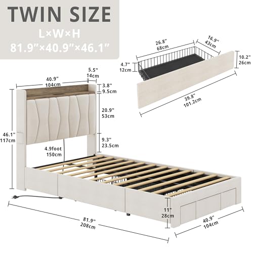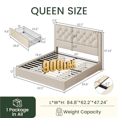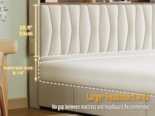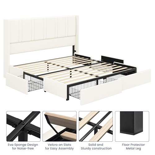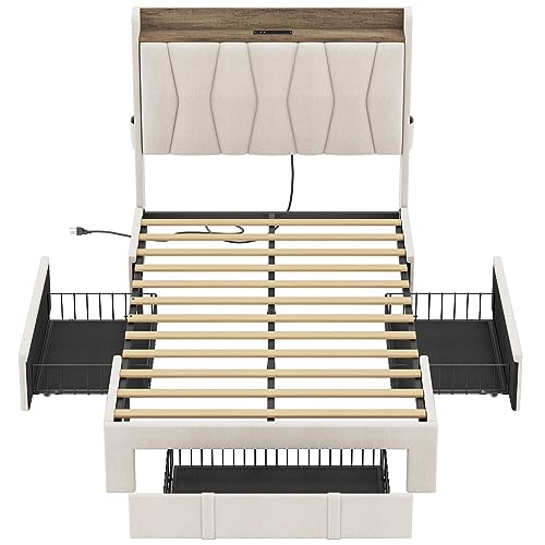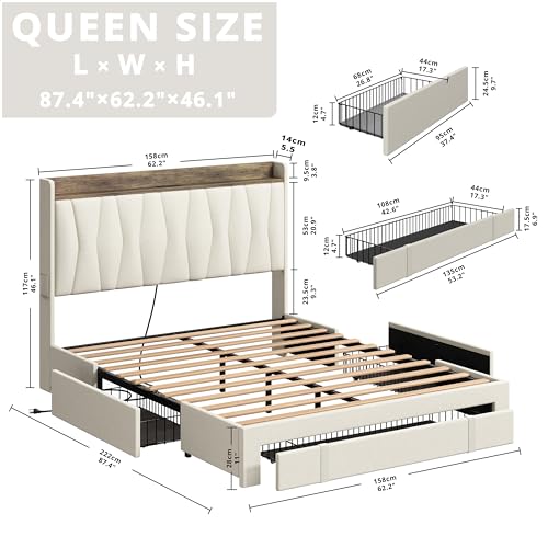 ANCTOR Queen Bed Frame with 3 Drawers, Upholstered Platform Bed with Storage Headboard and Charging Station, No Box Spring Needed, Easy Assembly, Beige