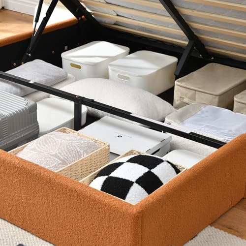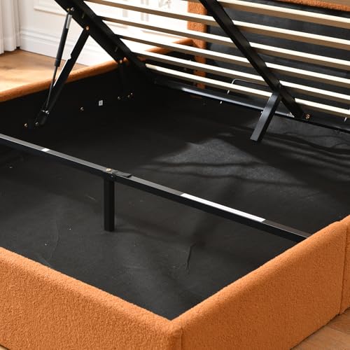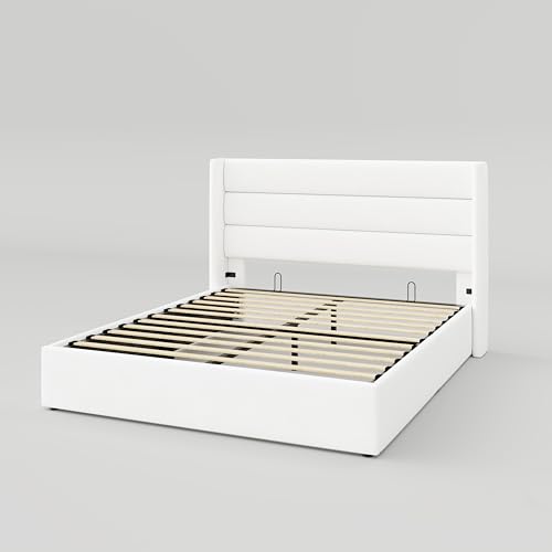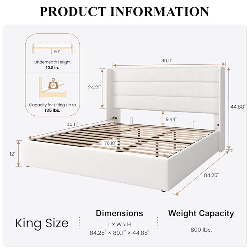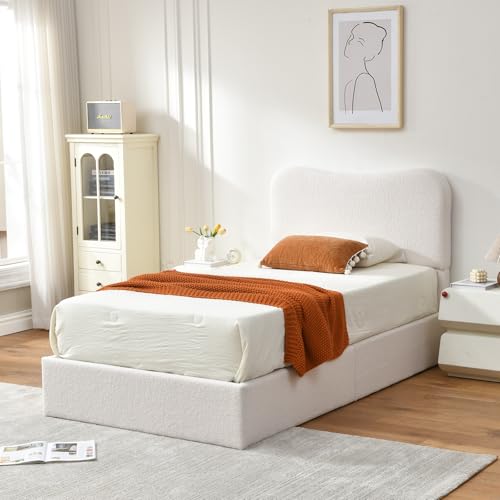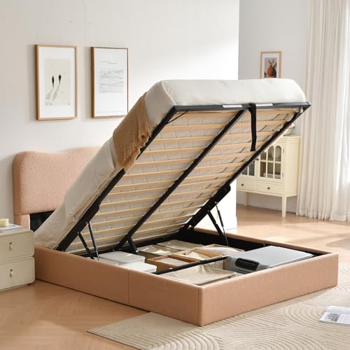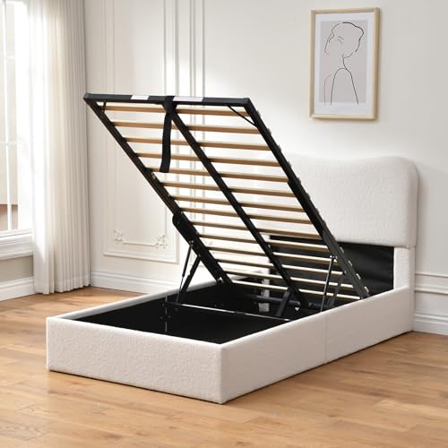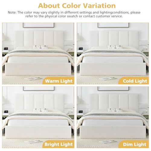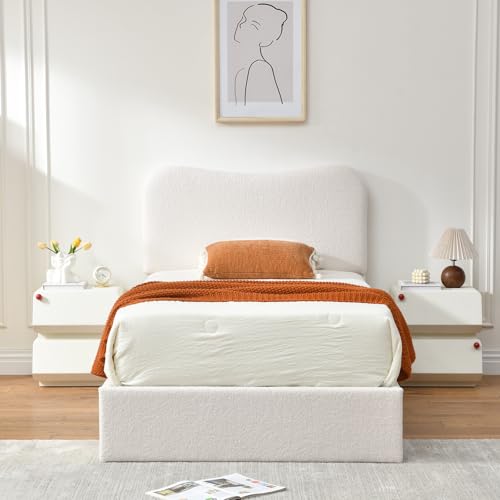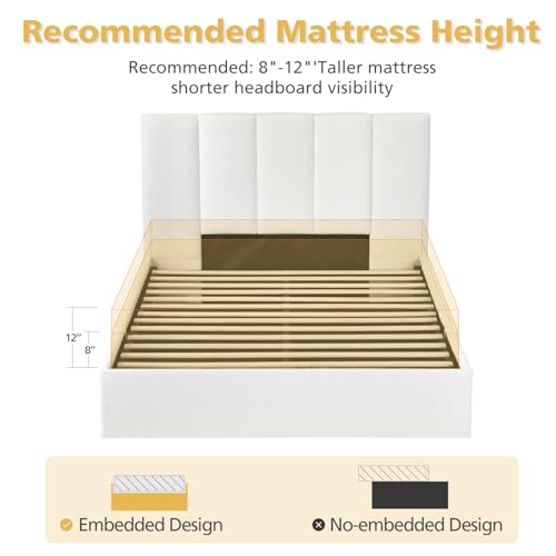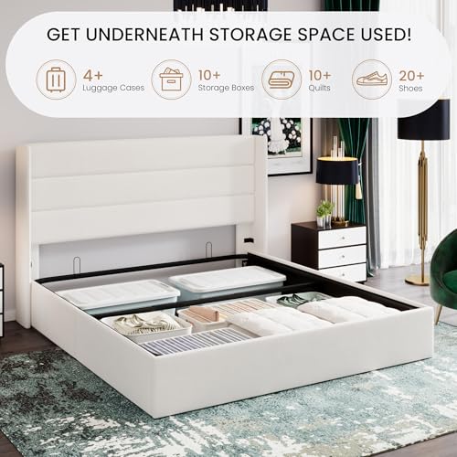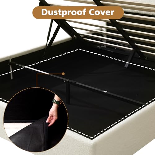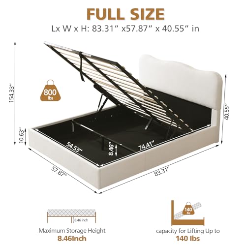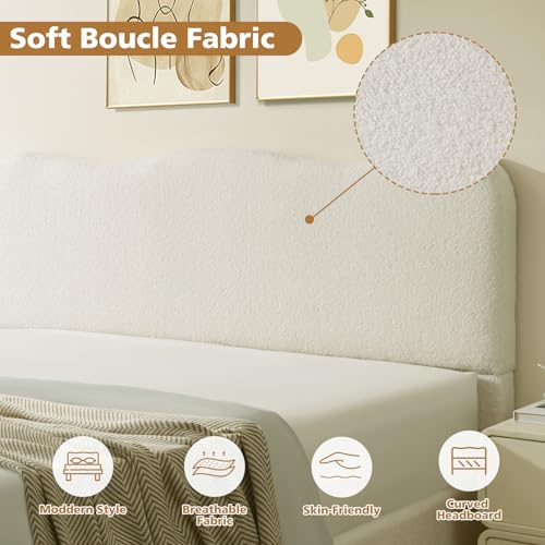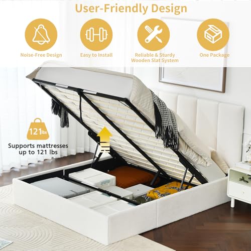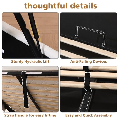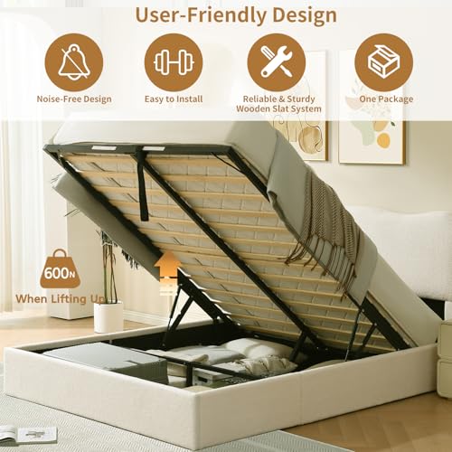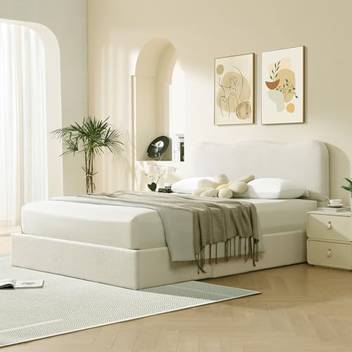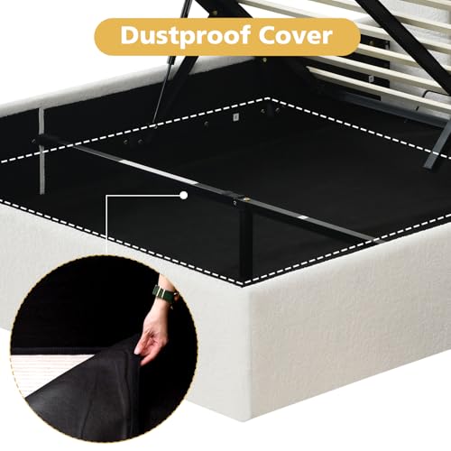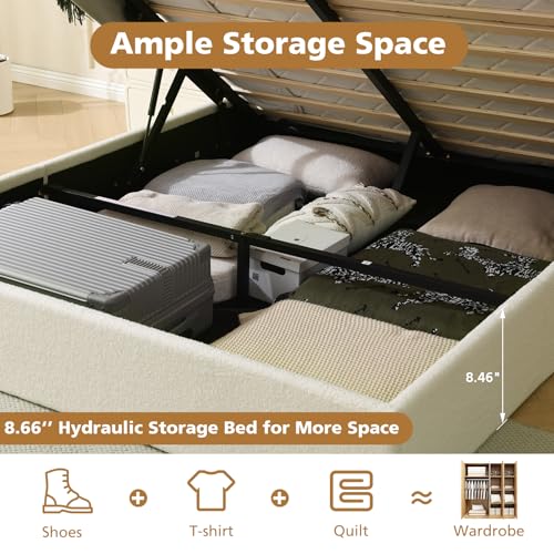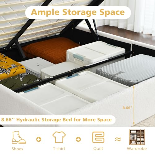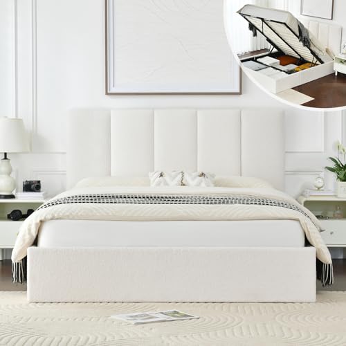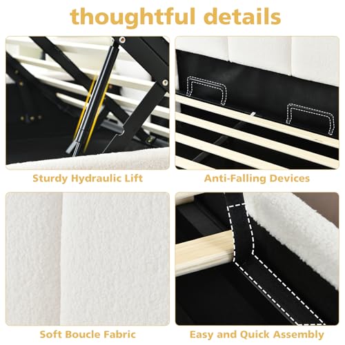 VELOCAVA Queen Size Lift-Up Storage Bed, Upholstered Boucle Bed with Curved Headboard, Rounded Corners, Sturdy Wooden Slat Support, No Box Spring Needed, Easy Assembly, Cream White