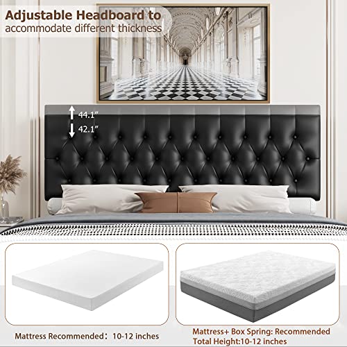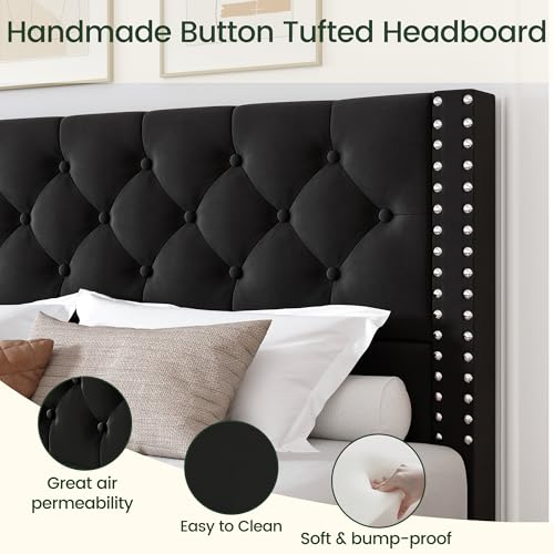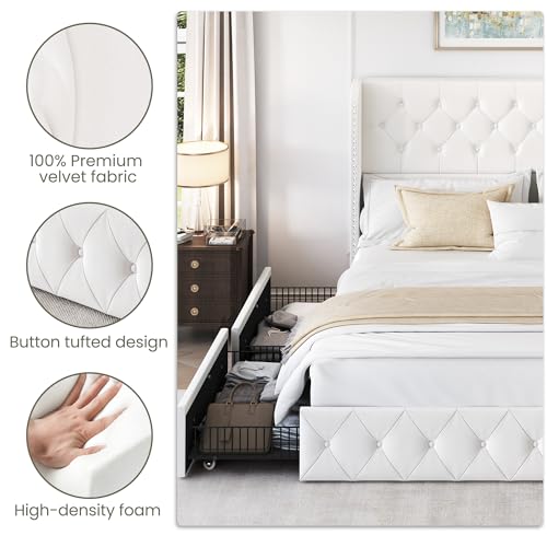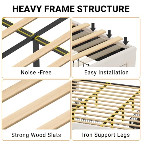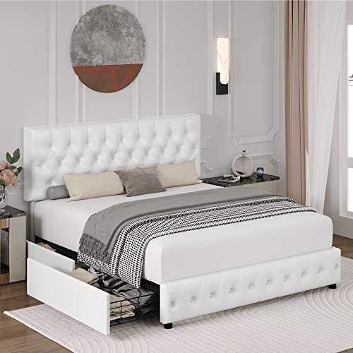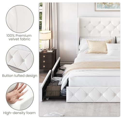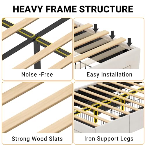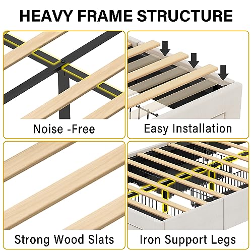 Queen Bed Frame with 4 Storage Drawers and Adjustable Headboard, Upholstered Platform Bed with Button Tufted Design, Strong Wooden Slats Support, No Box Spring Needed, Fabric, Cream