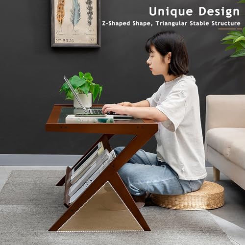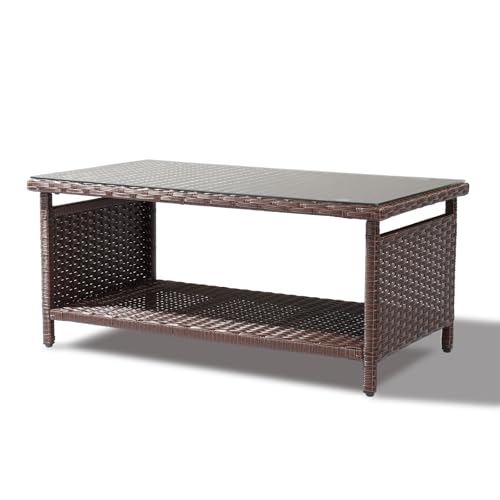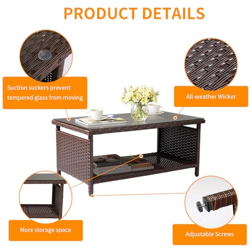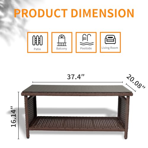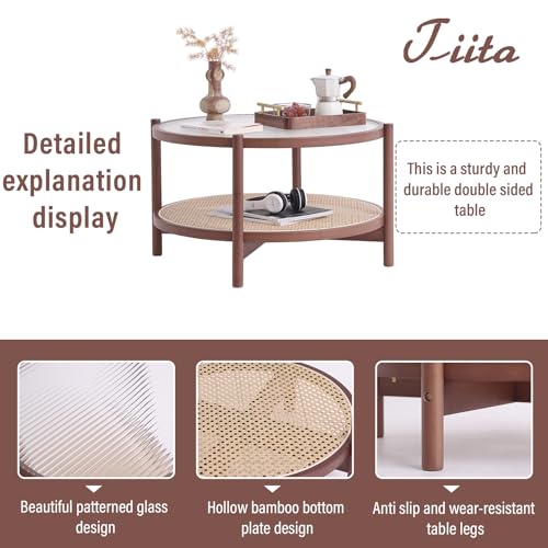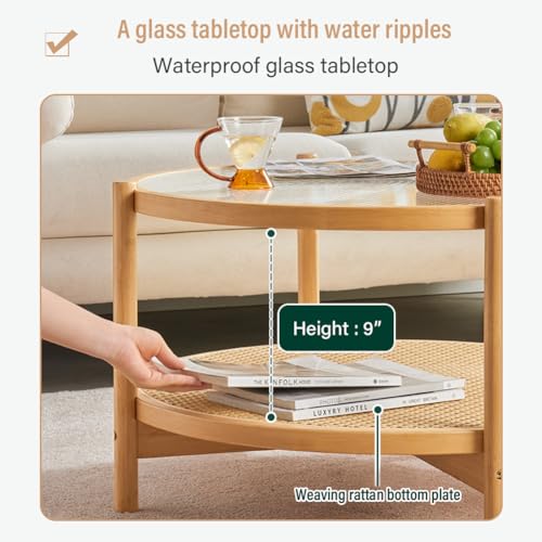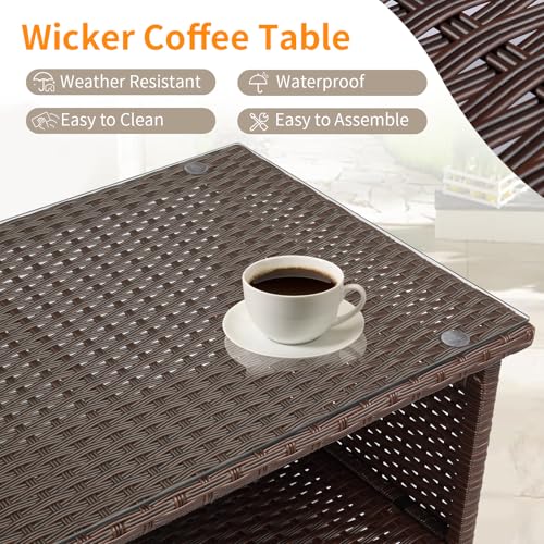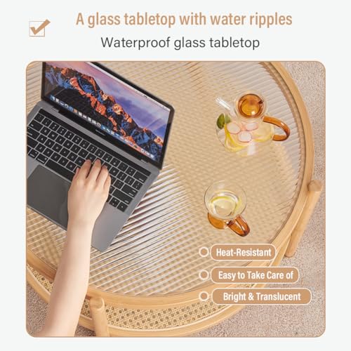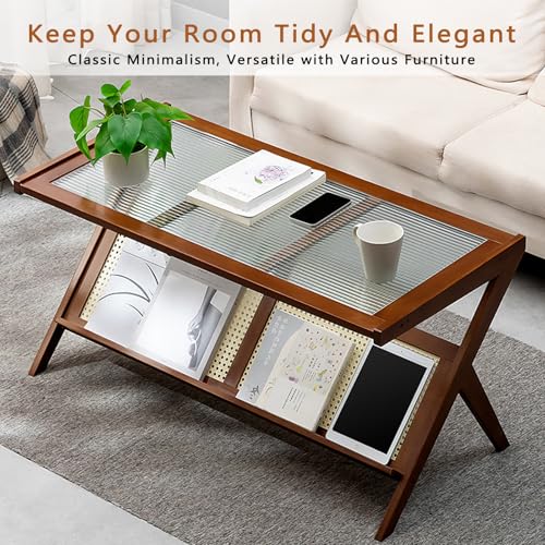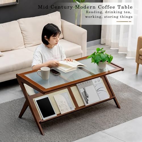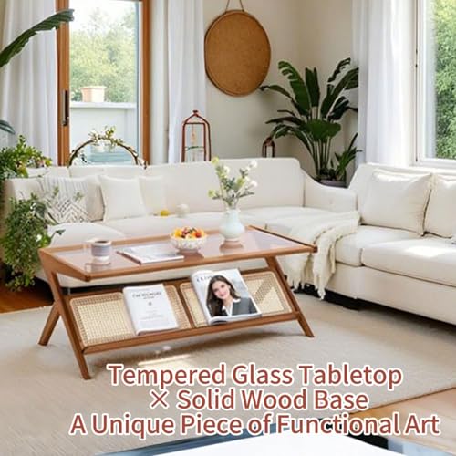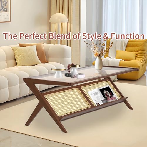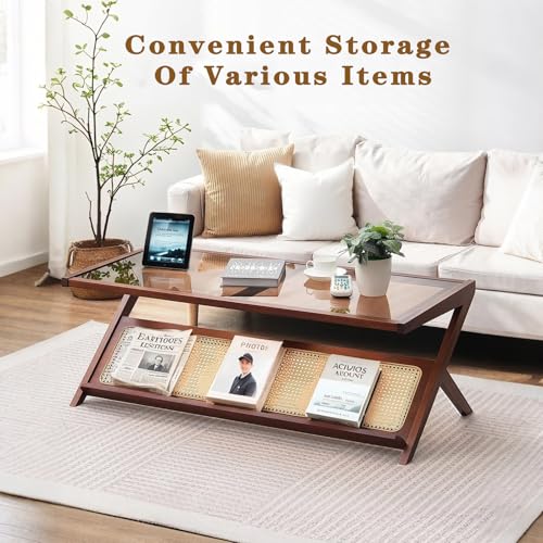 Rattan Coffee Table,Mid Century Modern Coffee Table with Tempered Glass Tabletop,BambooTable with Glass Top with Storage for Dining Room,Living Room,Home Decoration (Brown)