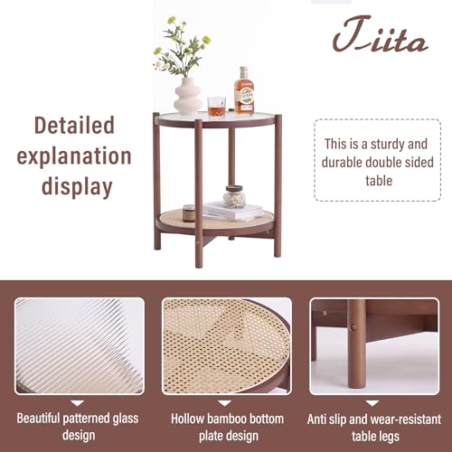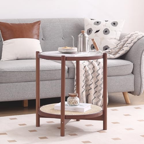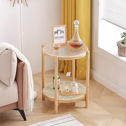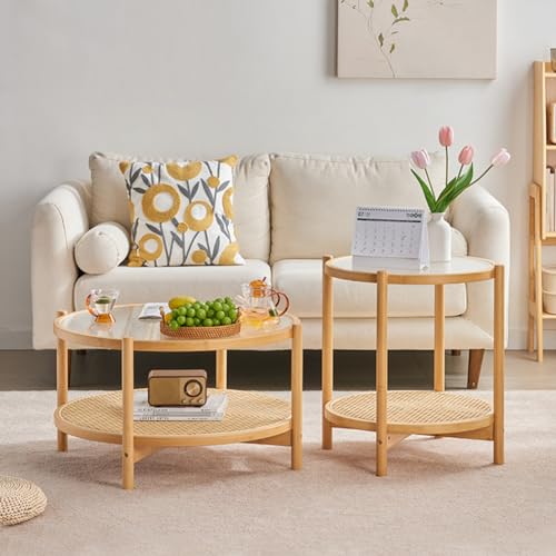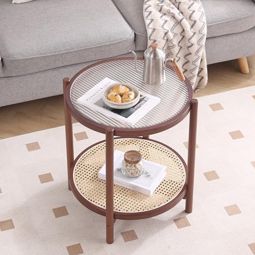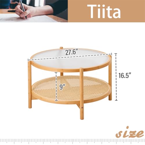 Tiita Rattan Coffee Table, Large Round End Table, 27.6 Inch Modern Side Table, Living Room Side Table, Glass Sofa End Table for Balcony and Office Outdoor/Indoor (Wood)