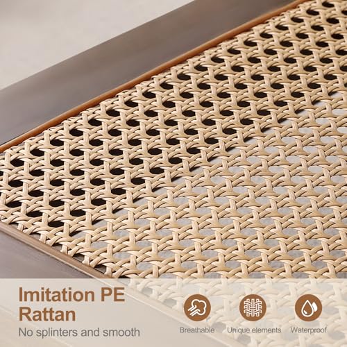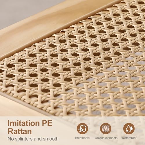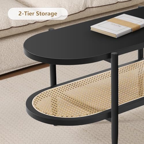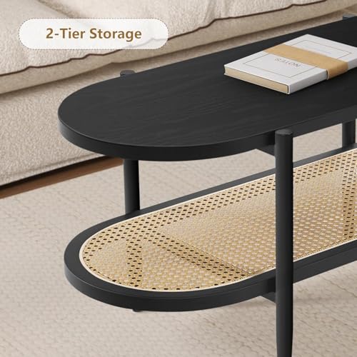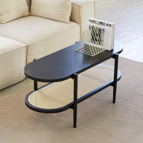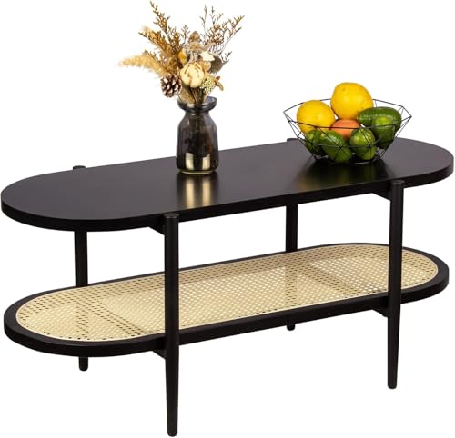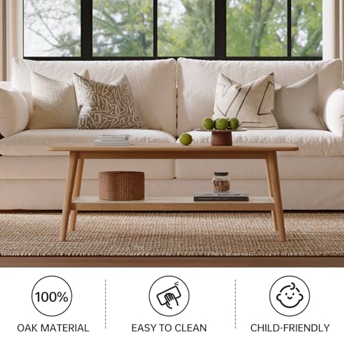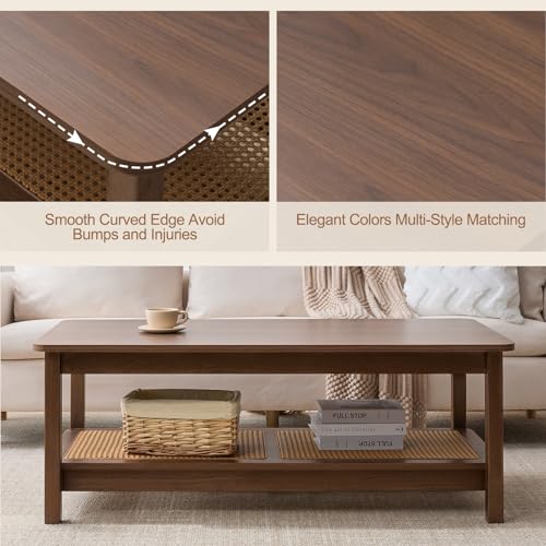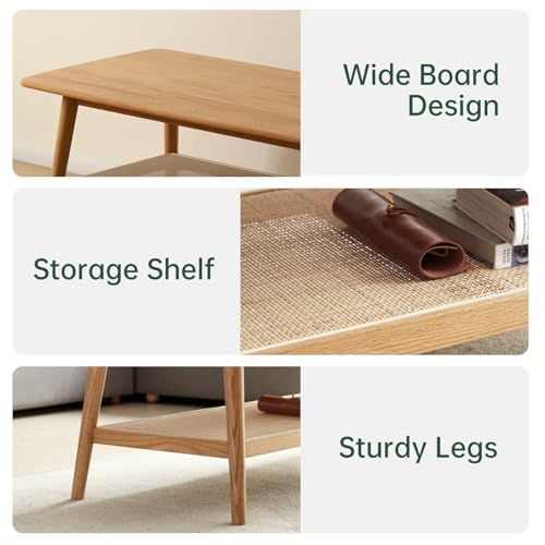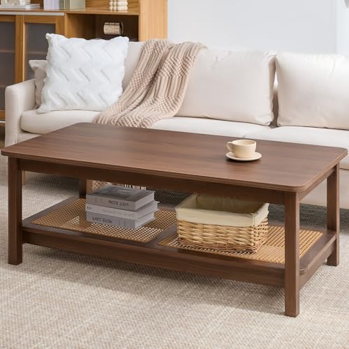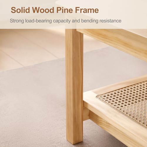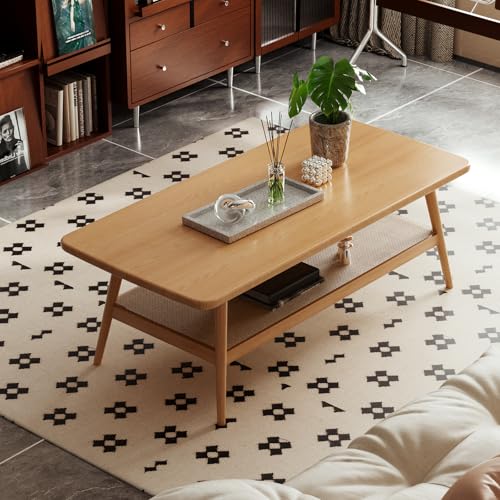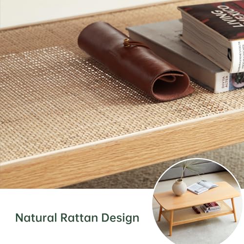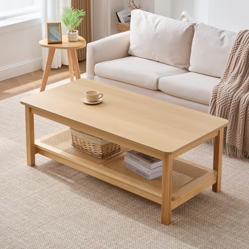 BECHAEO 47.2'' Boho Coffee Table with Solid Wood Legs & PE Rattan Shelf, 2-Tier Mid Century Modern Center Table Rustic Rectangle Wood Coffee Table for Living Room, Natural