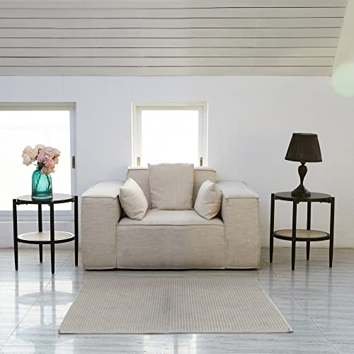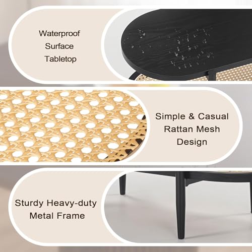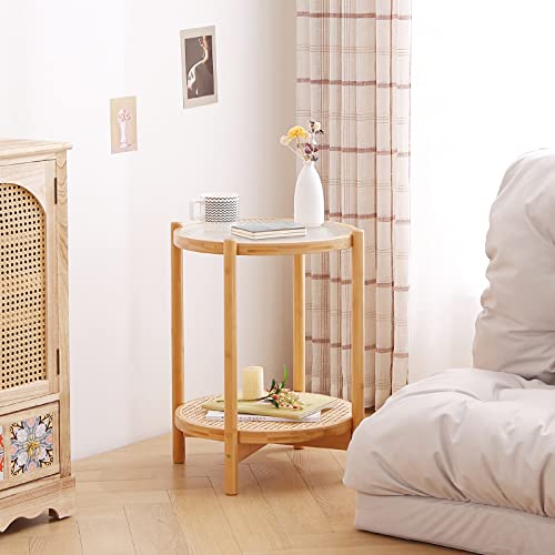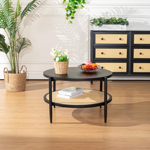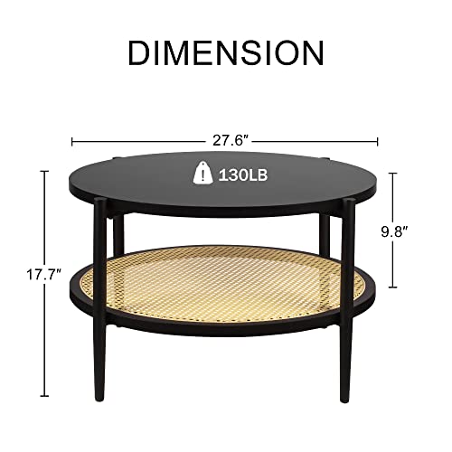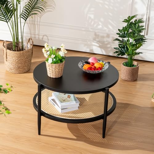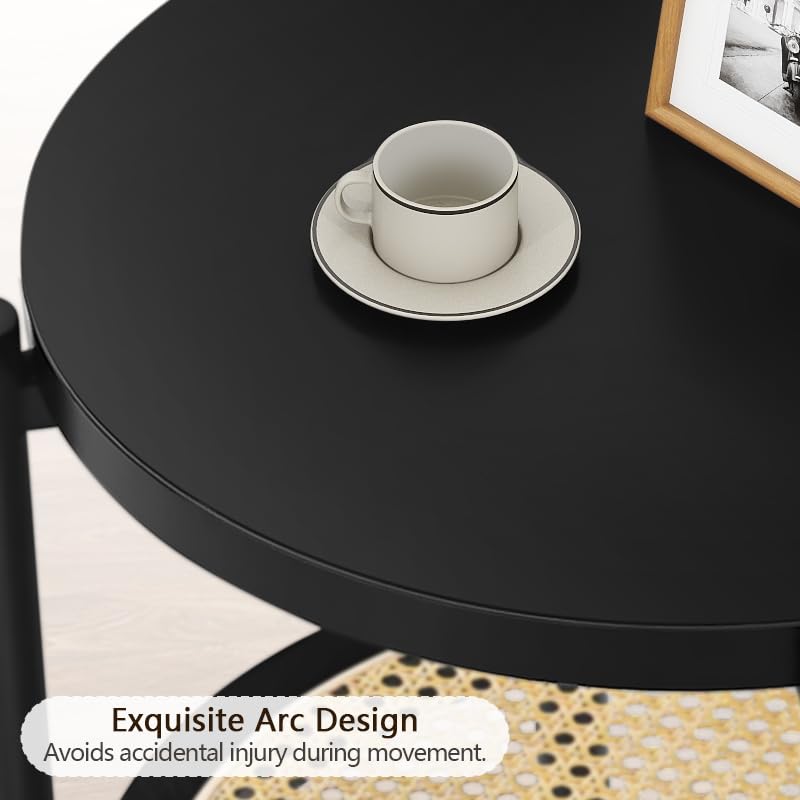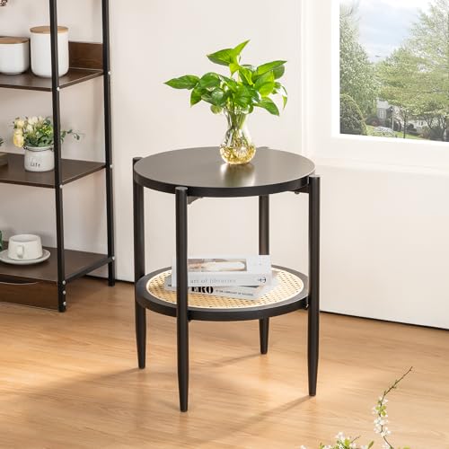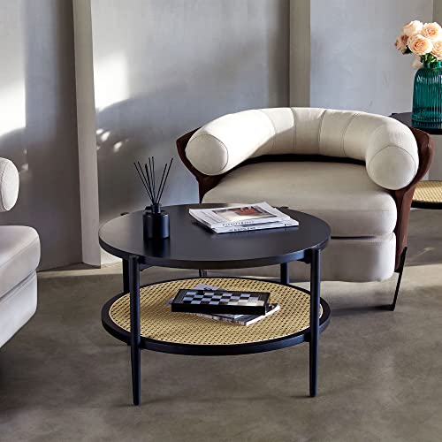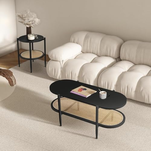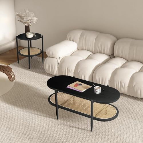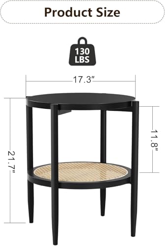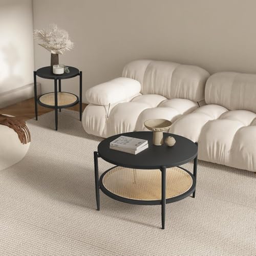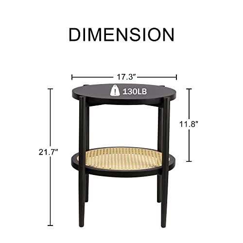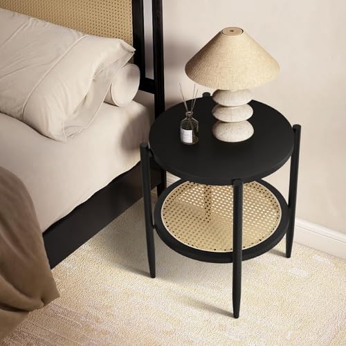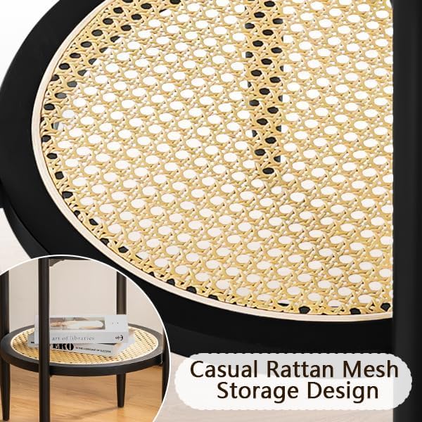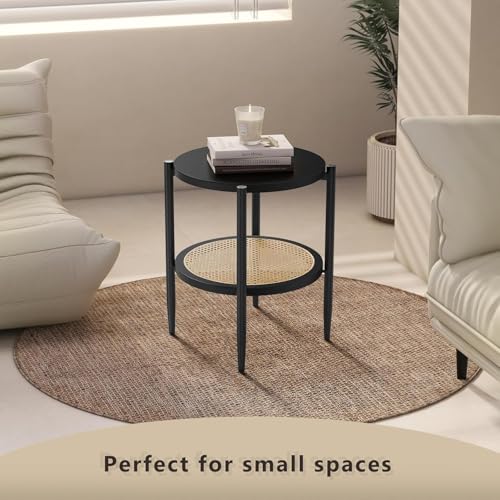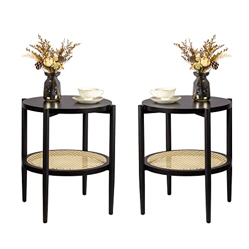 Black Small Side Table Set of 2, Mid Century Modern Engineered Wood End Table with Rattan Storage, 2-Tier Round Side Table for Living Room, Cafe, Bedroom, Small Space