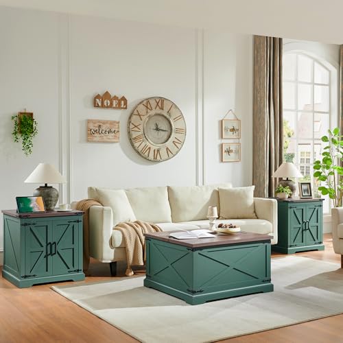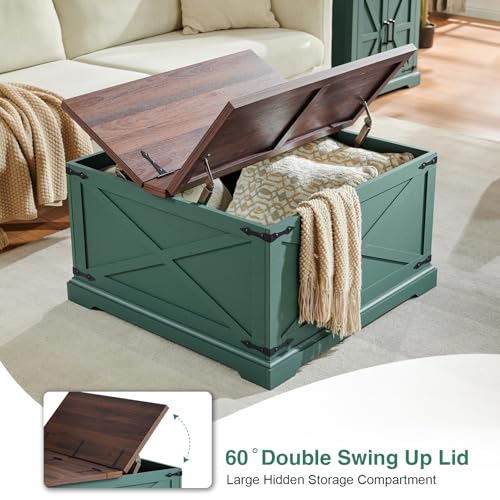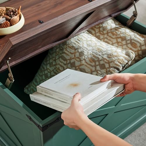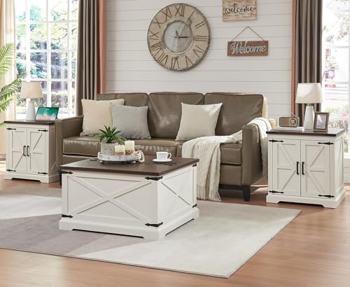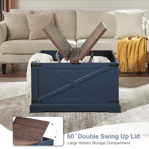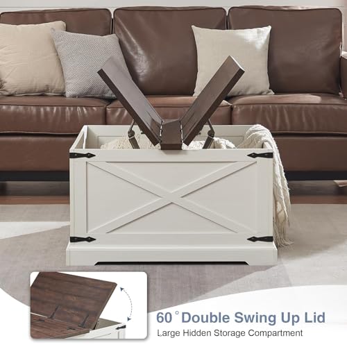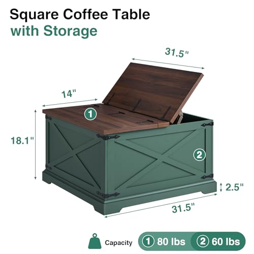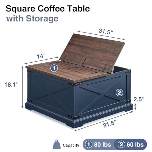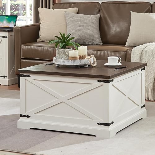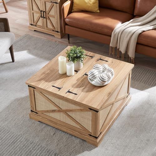 Farmhouse Square Coffee Table with Storage, Wood Center Table with Hinged Lift Top, Rustic Cocktail Table with Large Hidden Storage Compartment for Living Room, Bedroom,Natural,Rattan