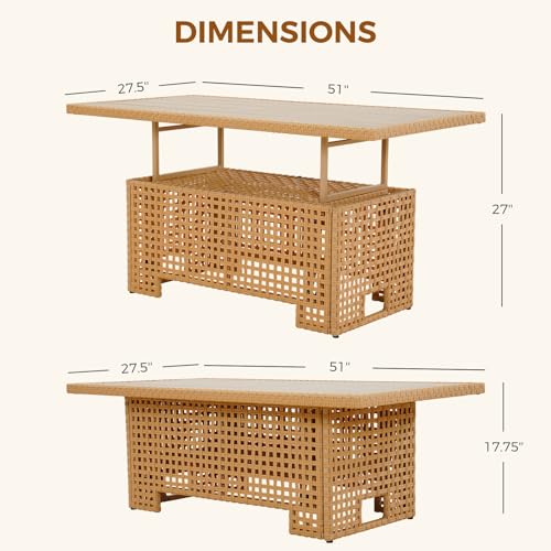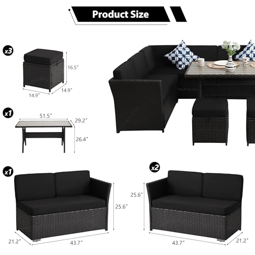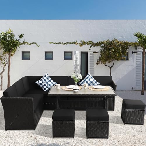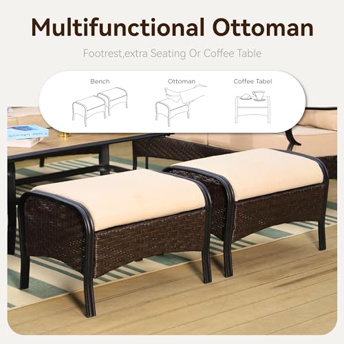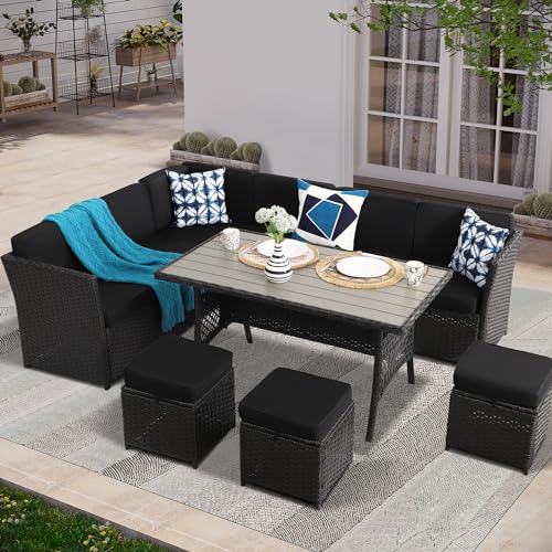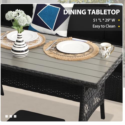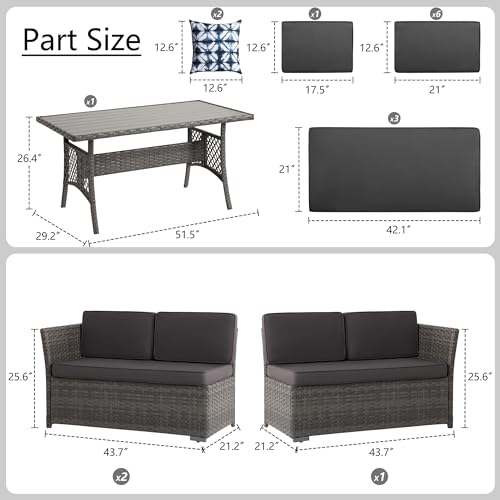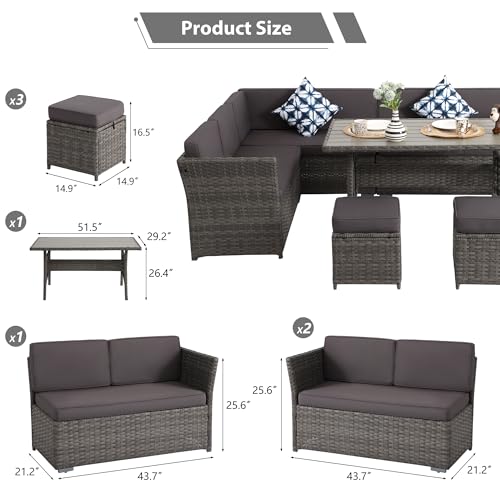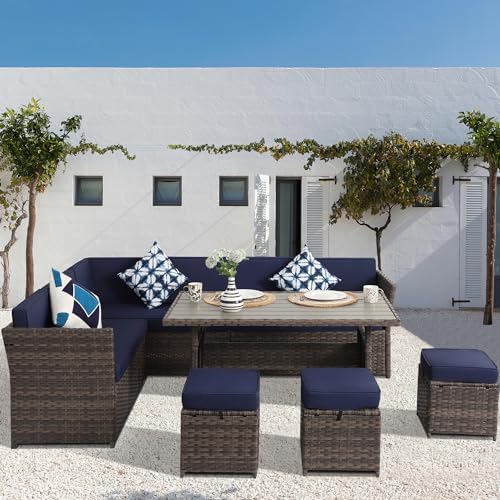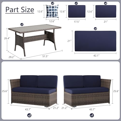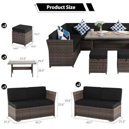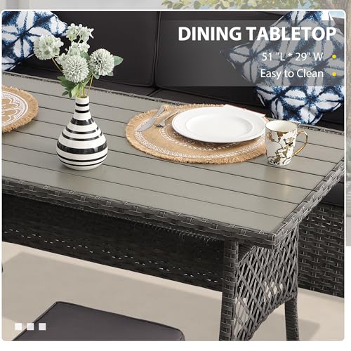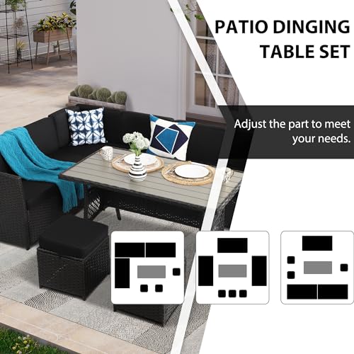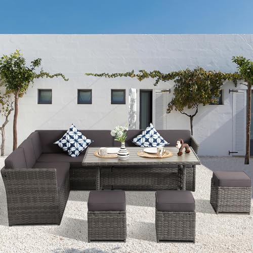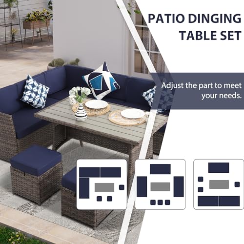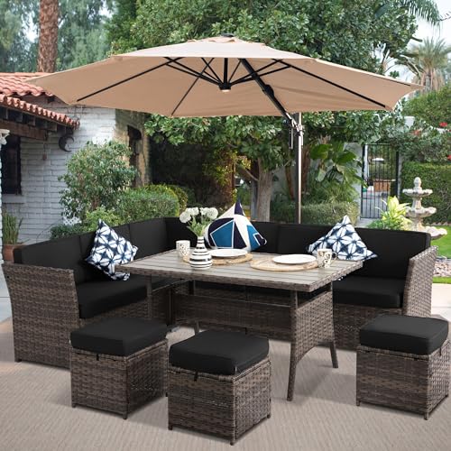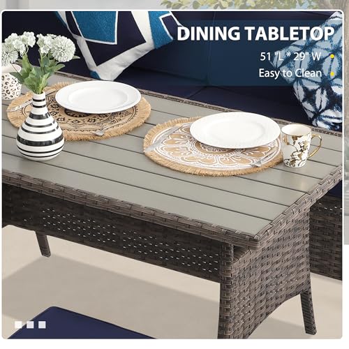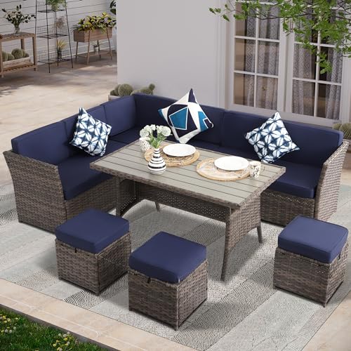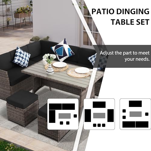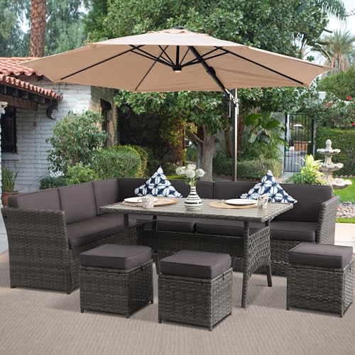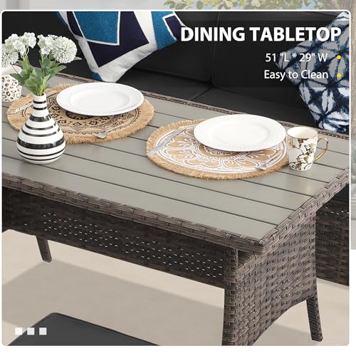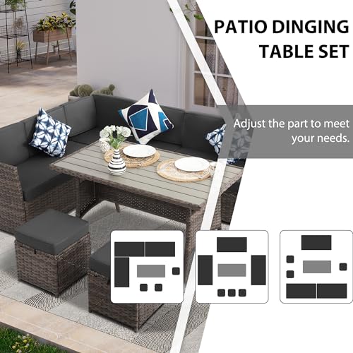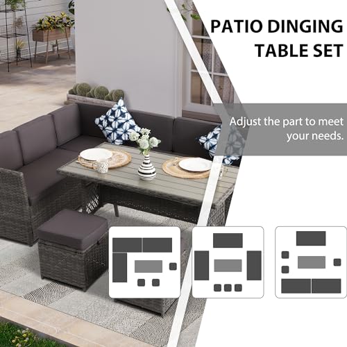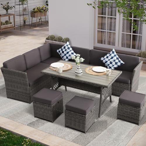 KIGOTY 7 Piece Patio Furniture Set, Outdoor PE Wicker Rattan Outdoor Dining Set, Patio Table and Chairs Set, Patio Conversation Sofa Set with Dining Table and Ottoman (Brown-Grey, 7 PCS-A)