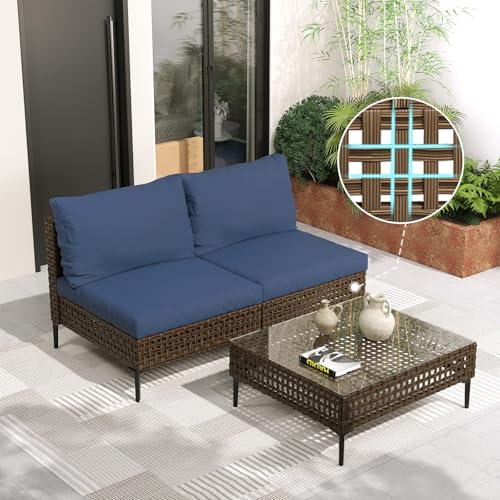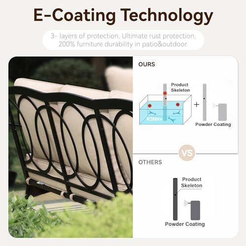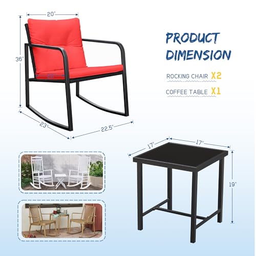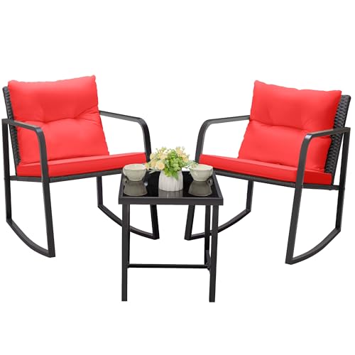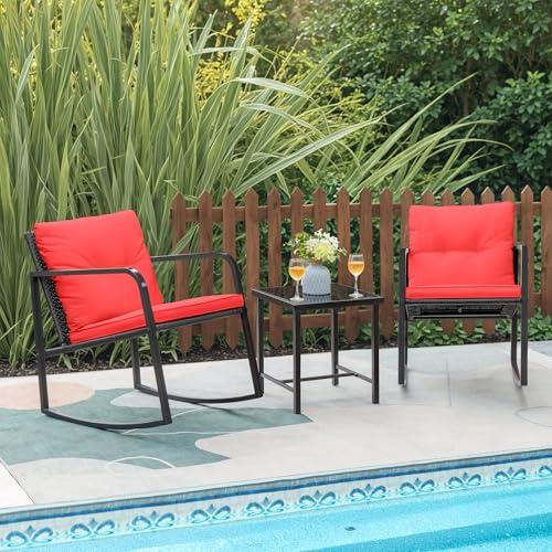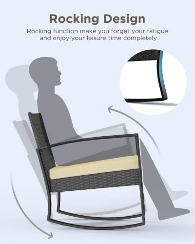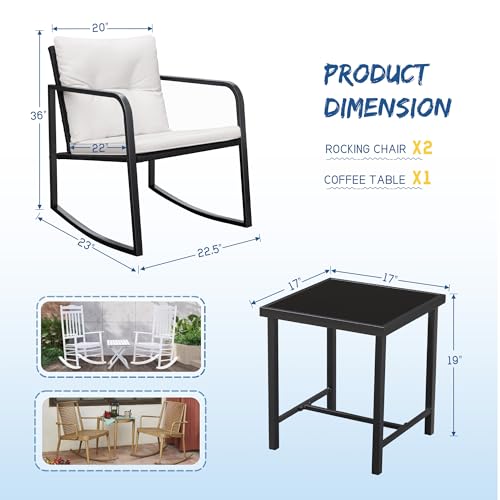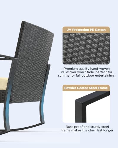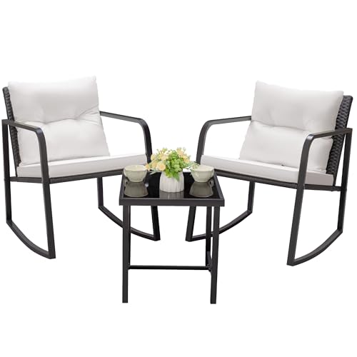 Greesum 3 Pieces Rocking Wicker Bistro Set, Patio Outdoor Furniture Conversation Sets with Porch Chairs and Glass Coffee Table, Beige